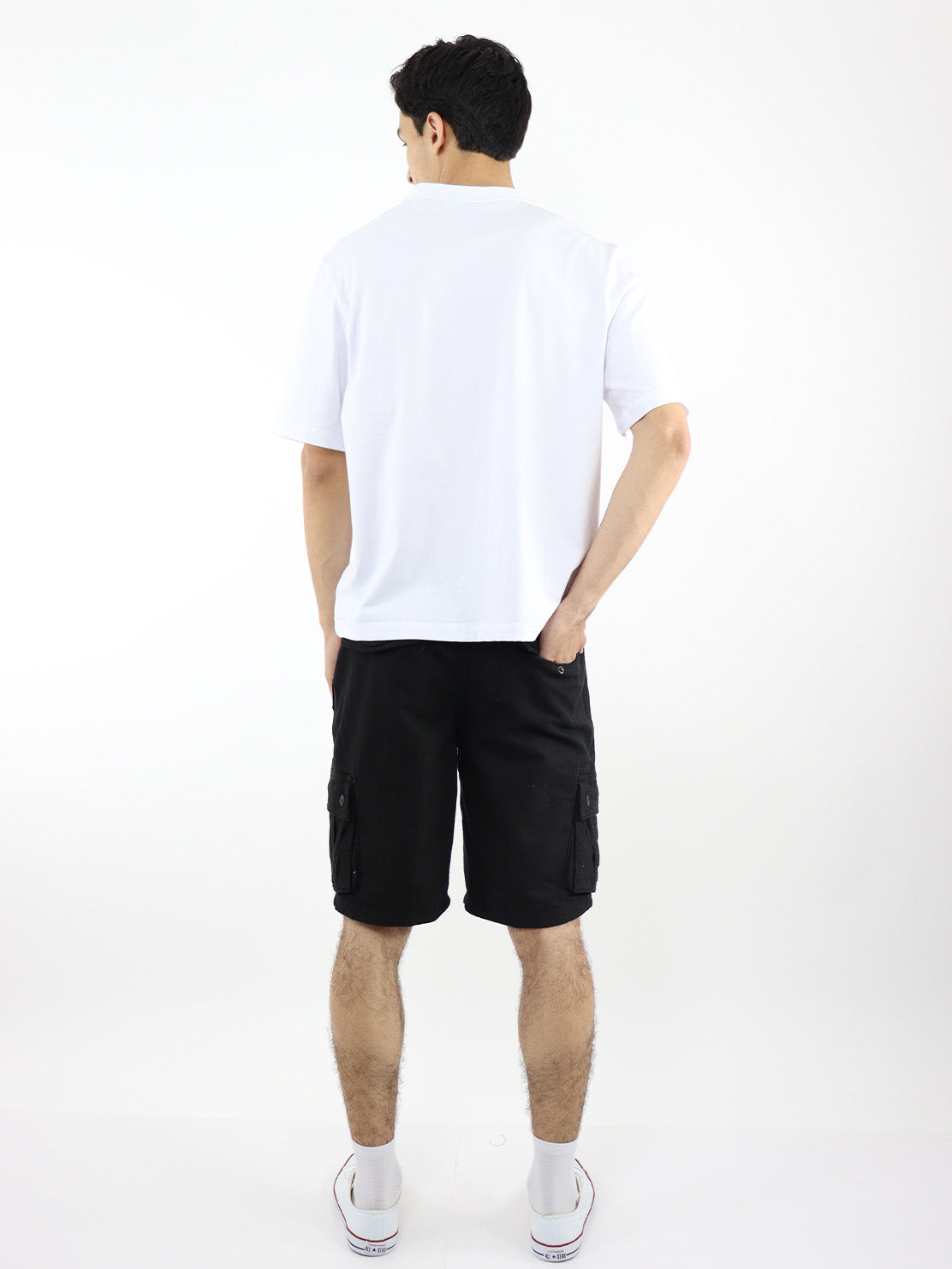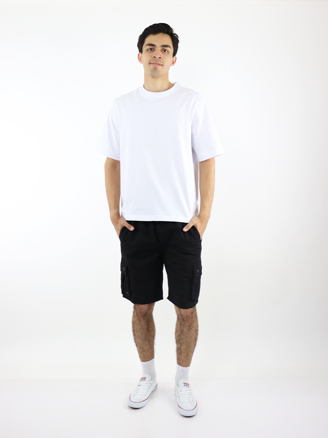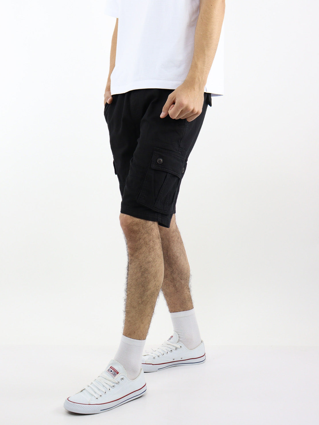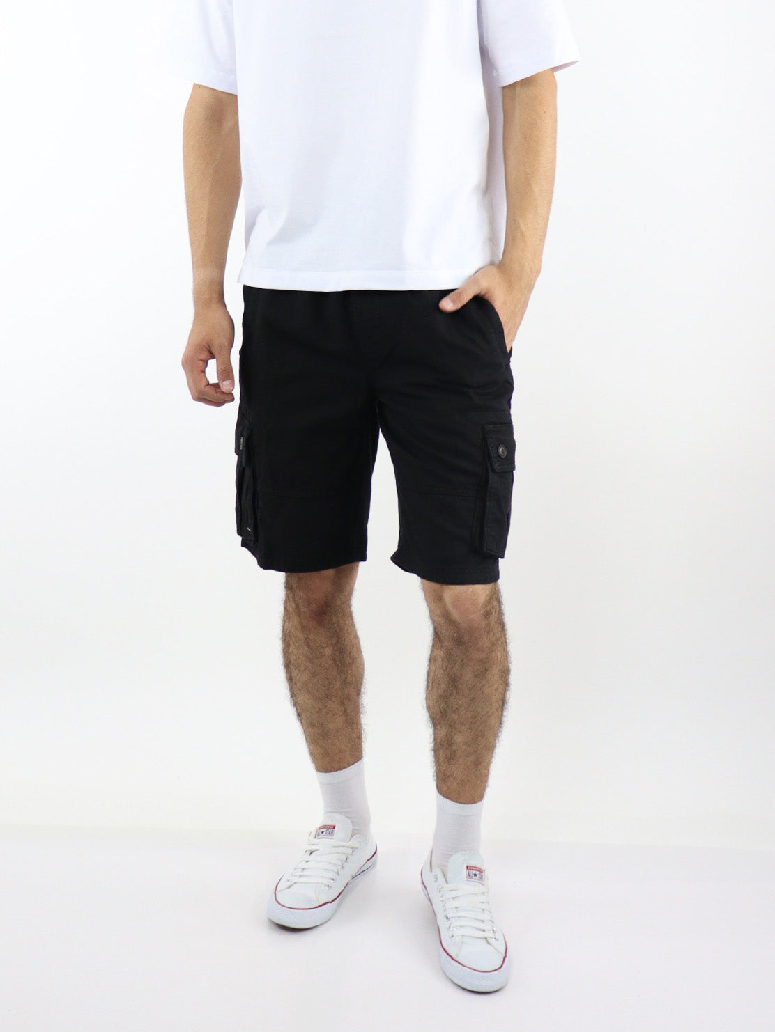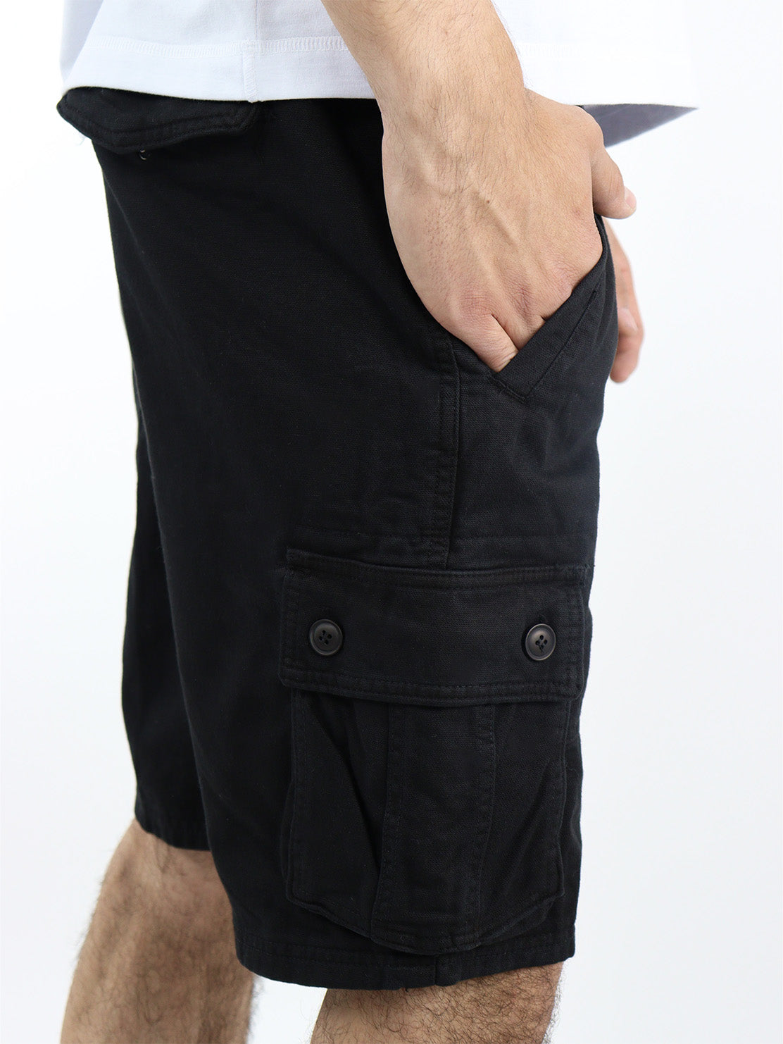 Bermuda cargo de gabardina color negro, con cinturilla elástica y cordón para ajustar. Bolsas cargo con tapeta de botón