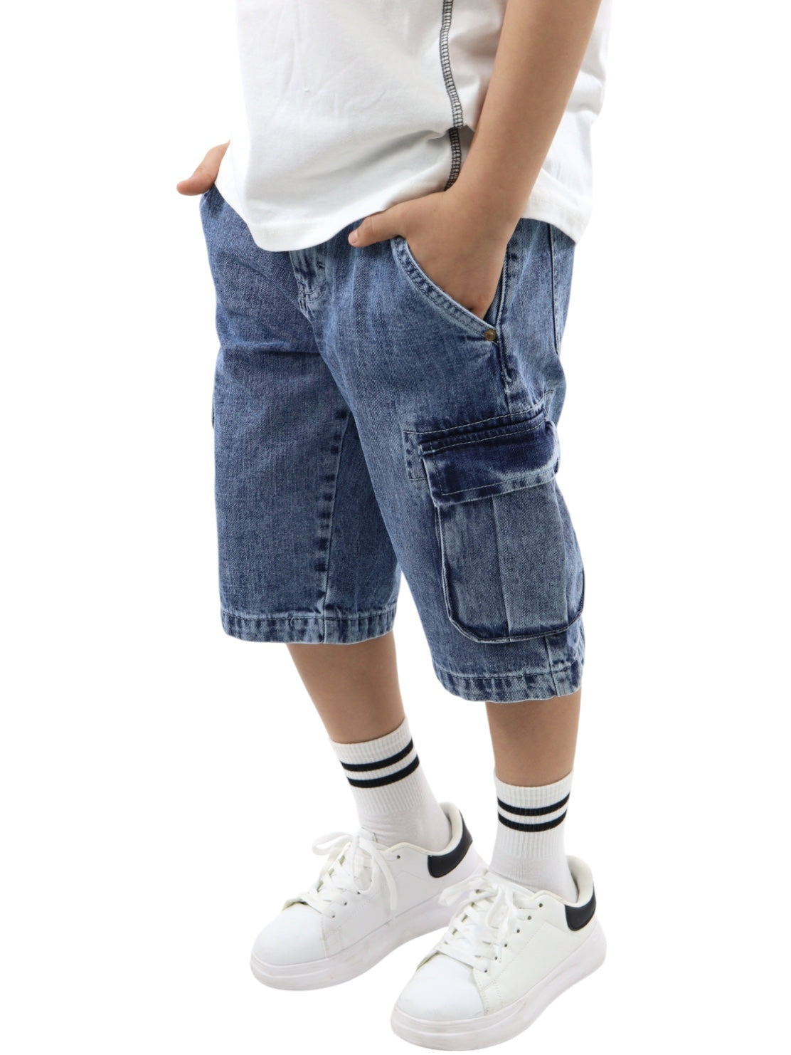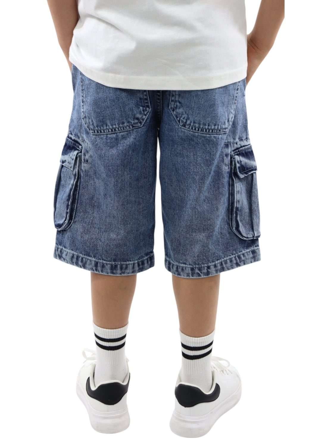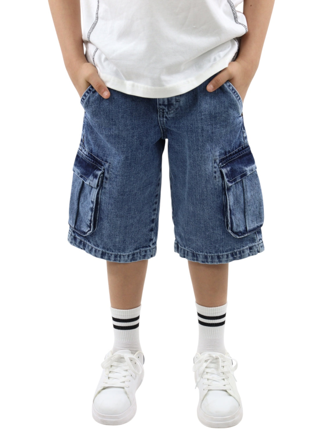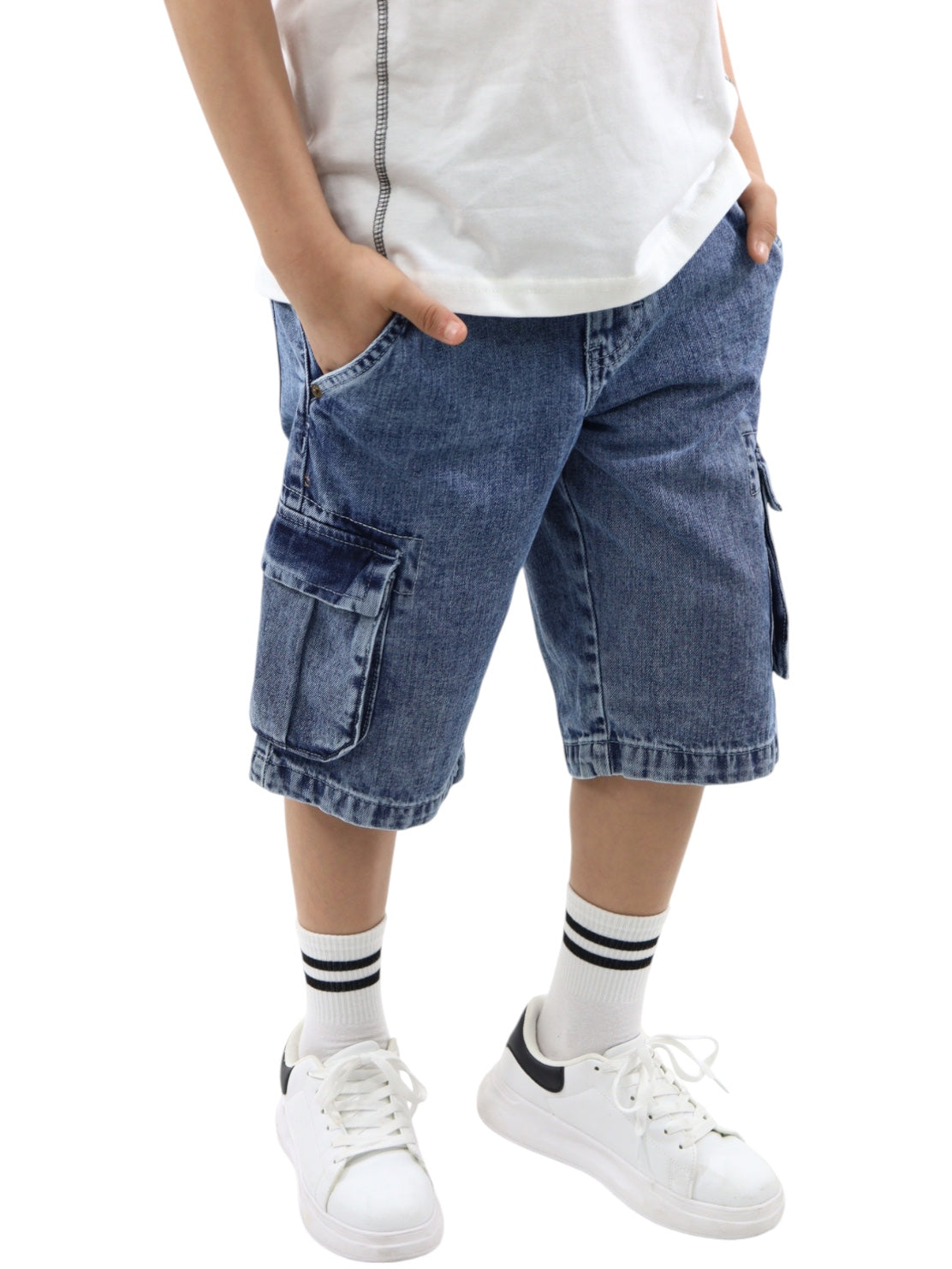 Bermuda cargo de mezclilla, con bolsillos en la parte delantera y trasera, cierre de botón y cremallera. Lavado azul oscuro, ligeramente ensuciado, aspecto usado.
