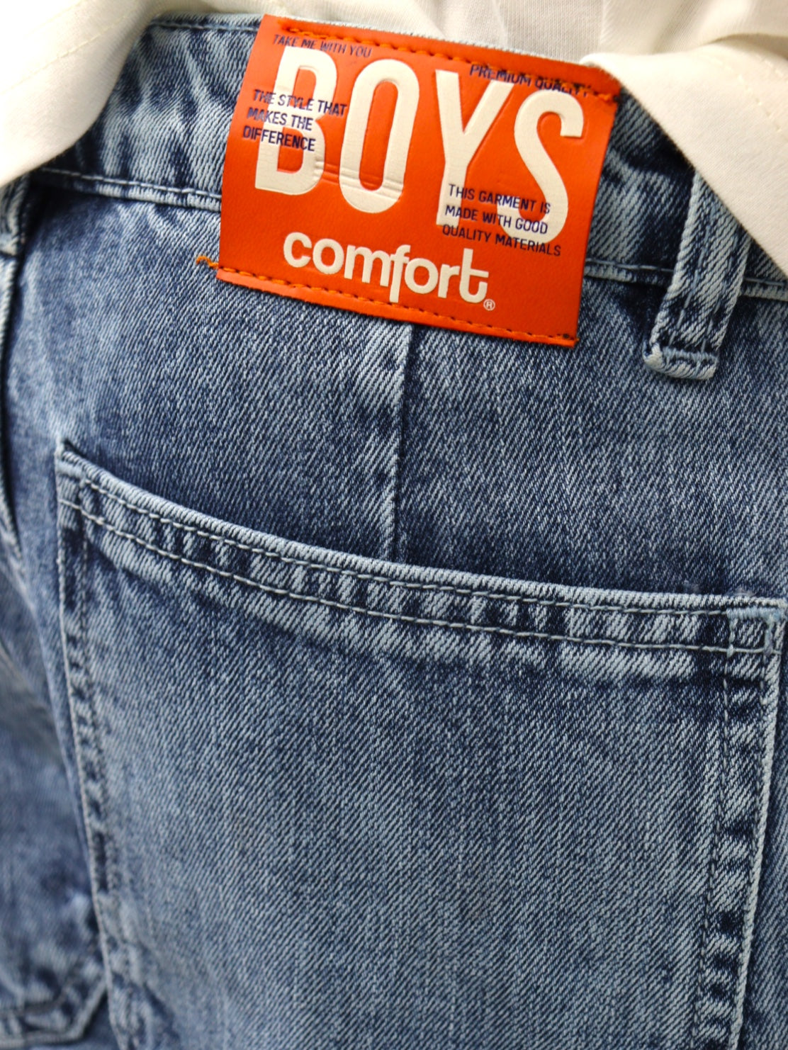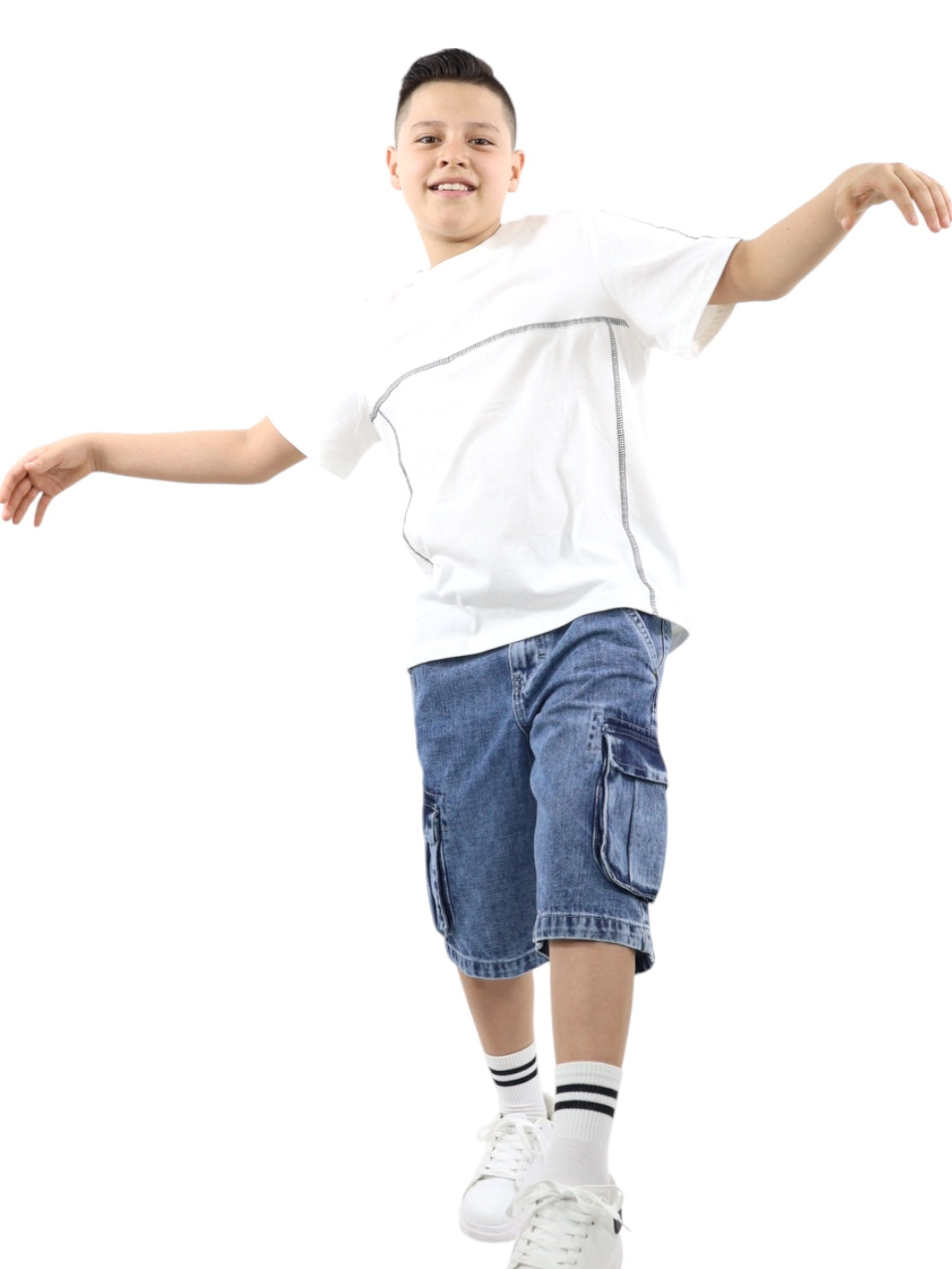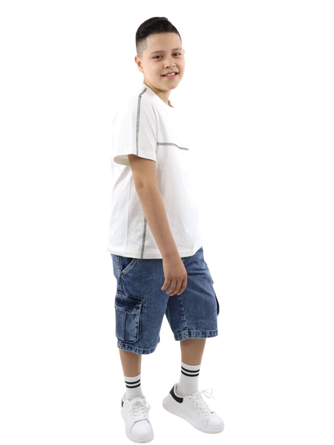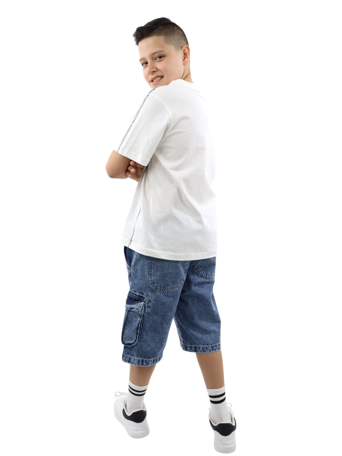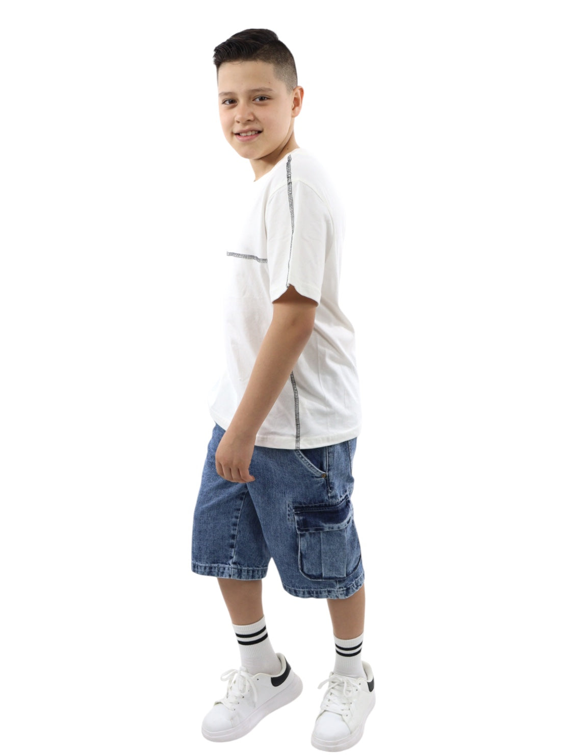 Bermuda cargo de mezclilla, con bolsillos en la parte delantera y trasera, cierre de botón y cremallera. Lavado azul oscuro, ligeramente ensuciado, aspecto usado.