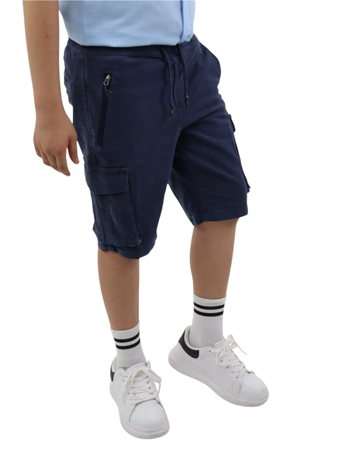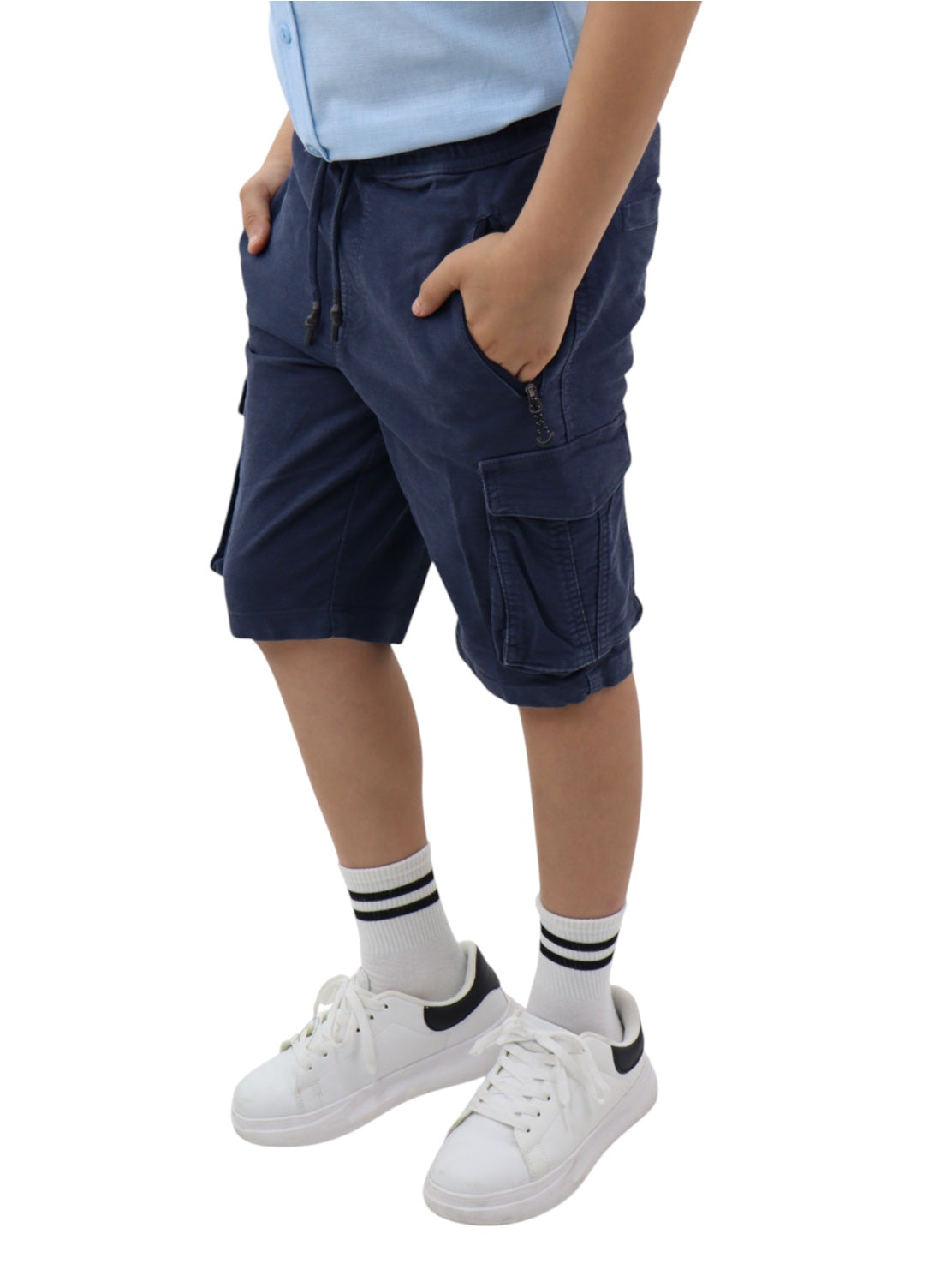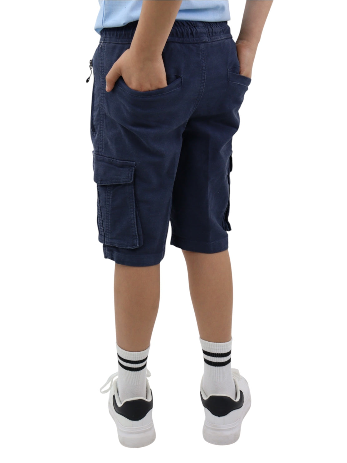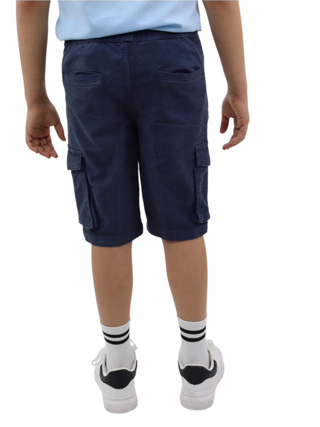 Bermuda cargo de gabardina color azul marino, con cinturilla elástica y cordón para ajustar. Detalle de bolsillos en la espalda.