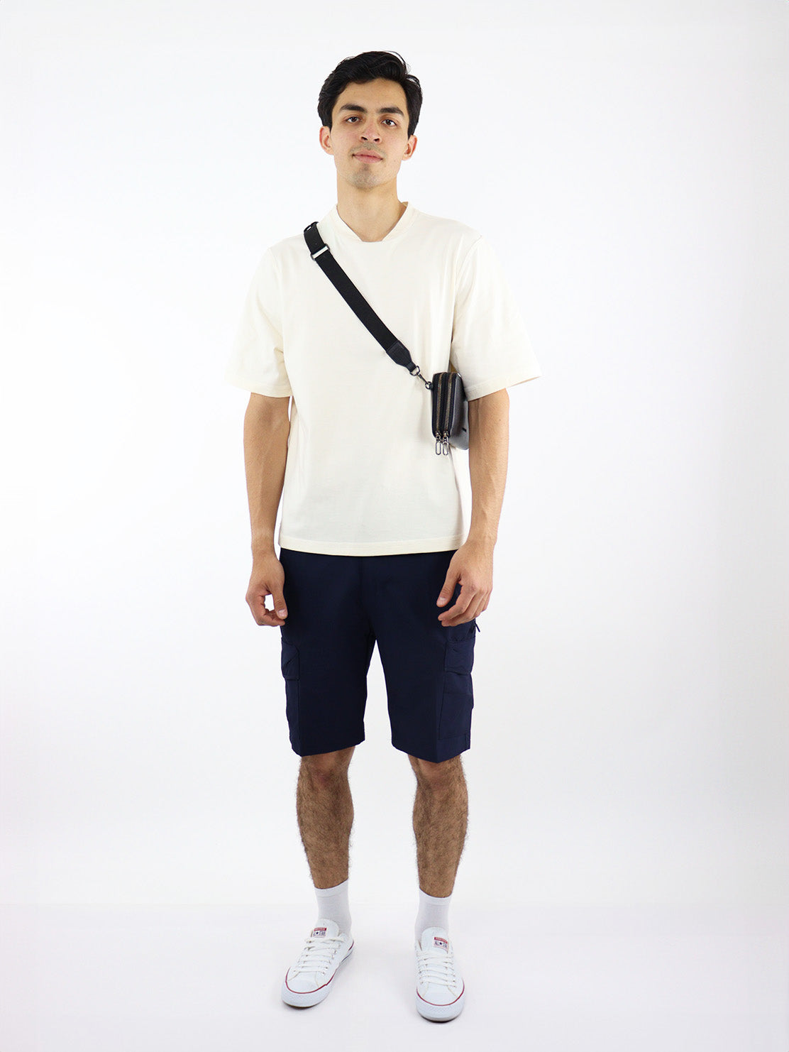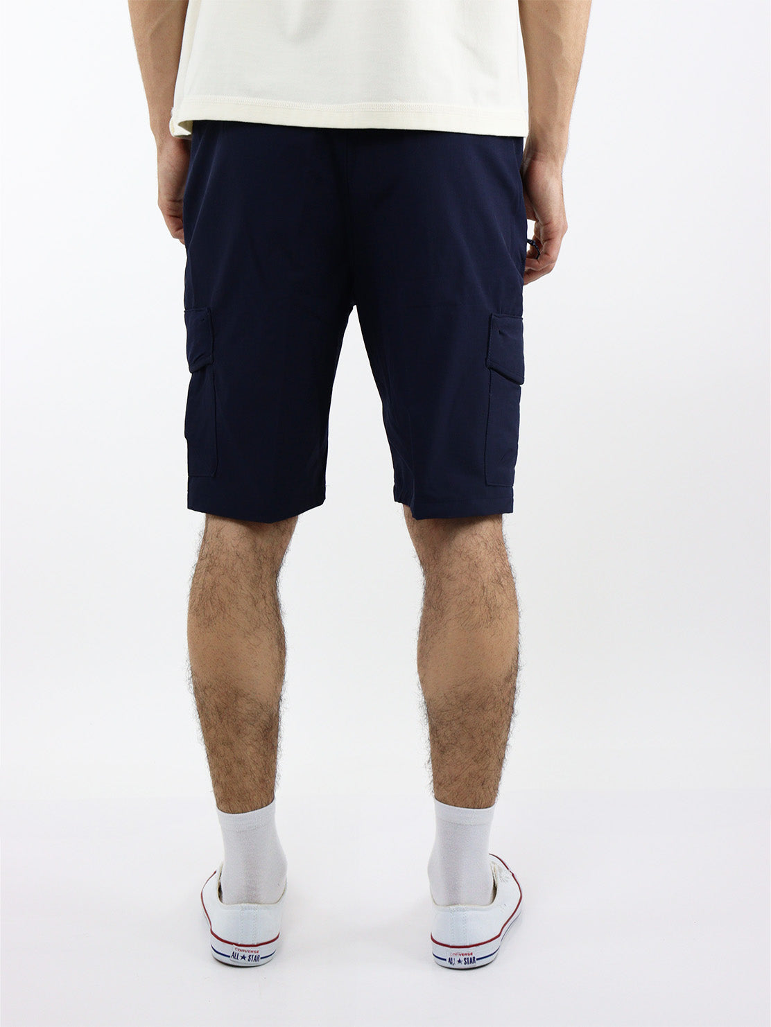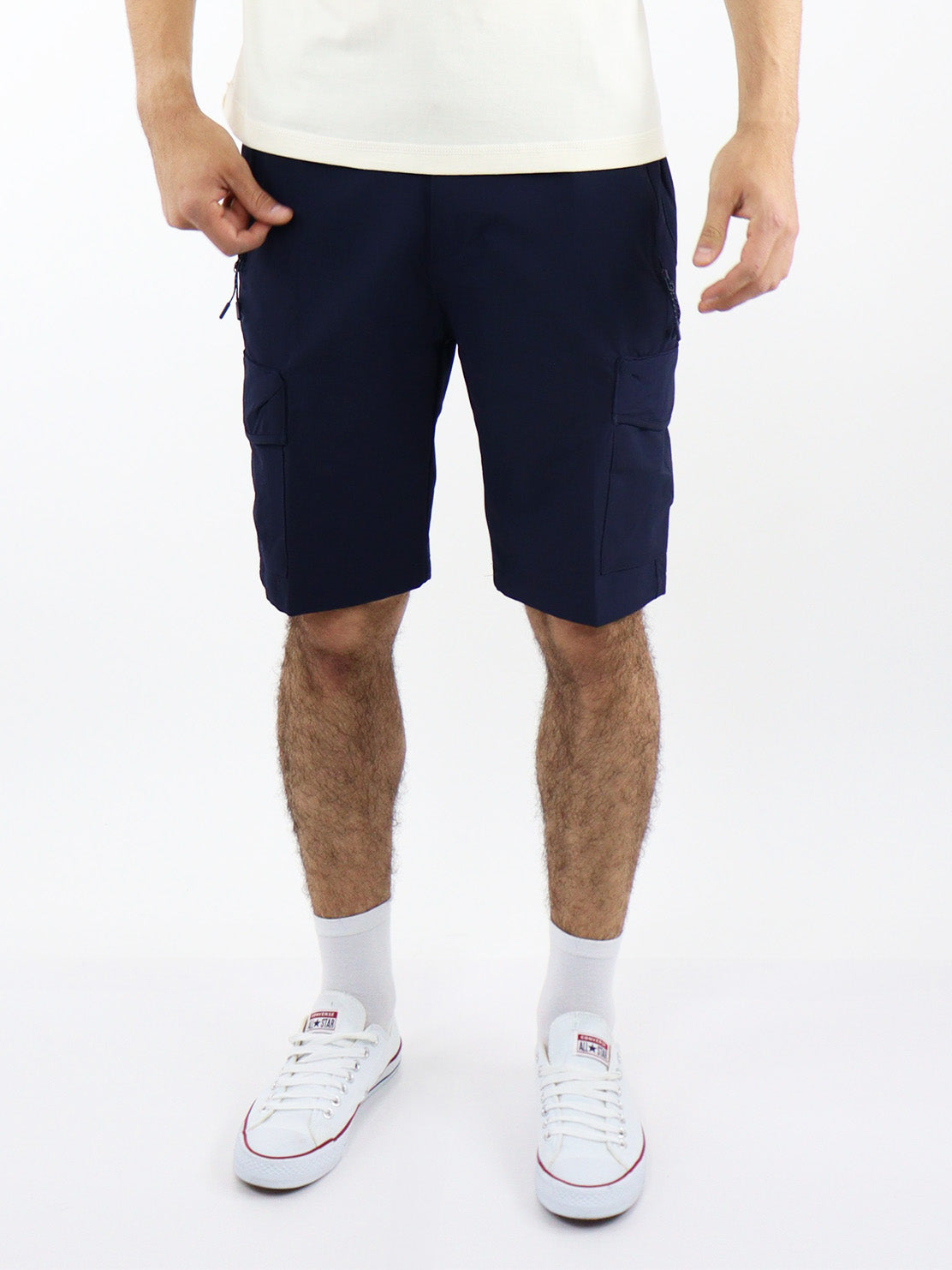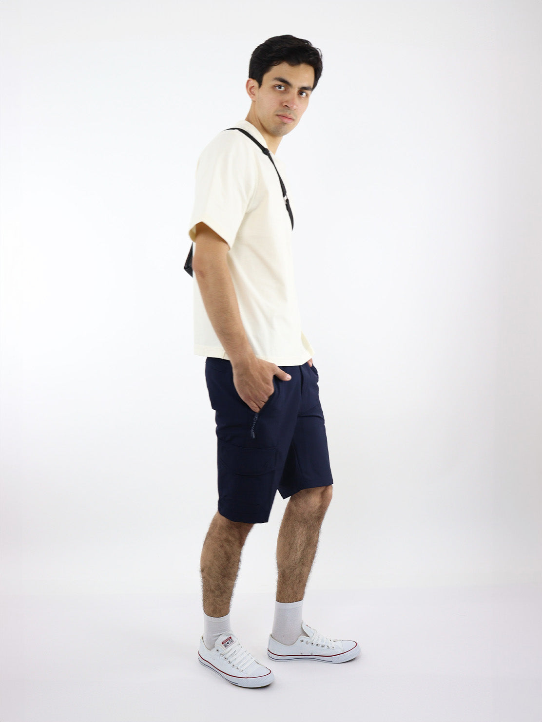 Bermuda cargo, con bolsillos cargo en los laterales. Cierre de cremallera y botón de color azul marino