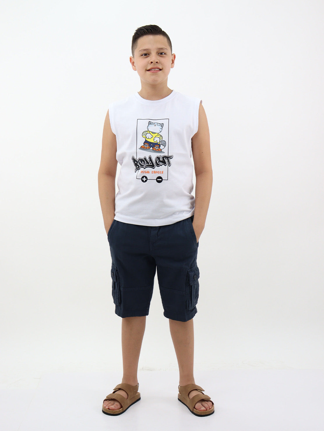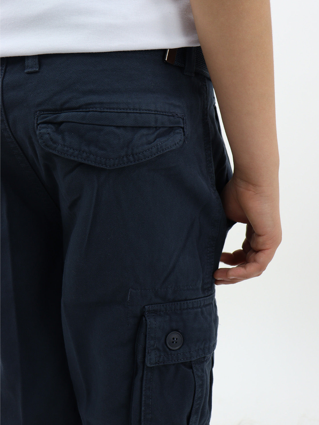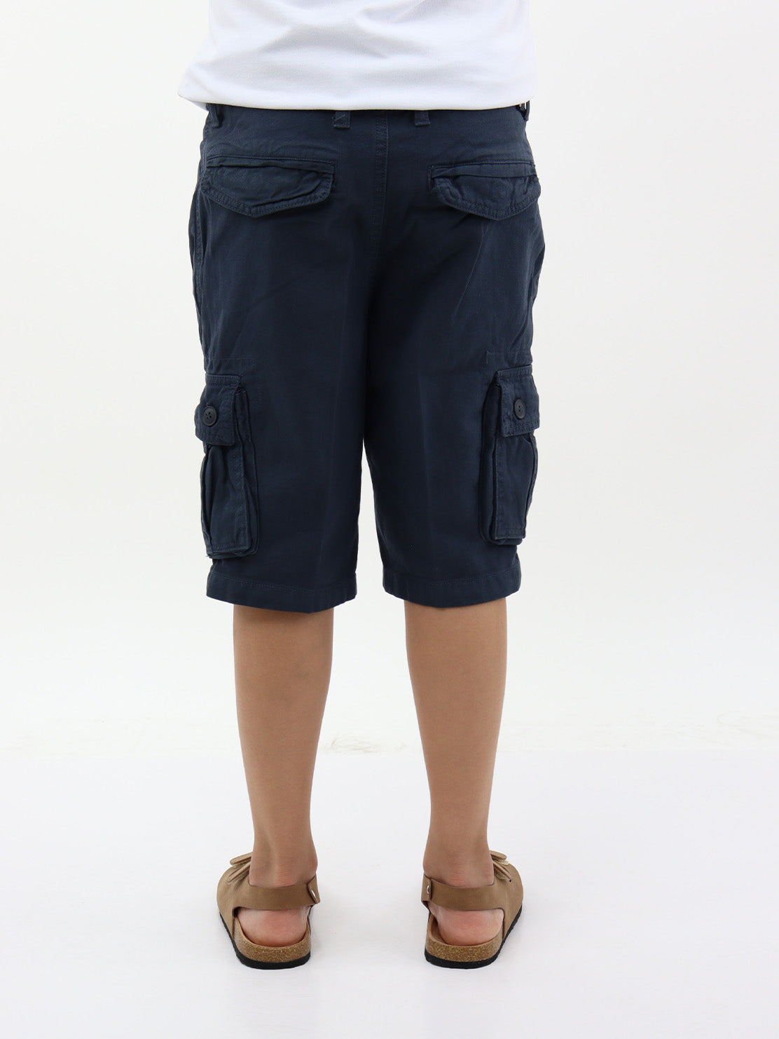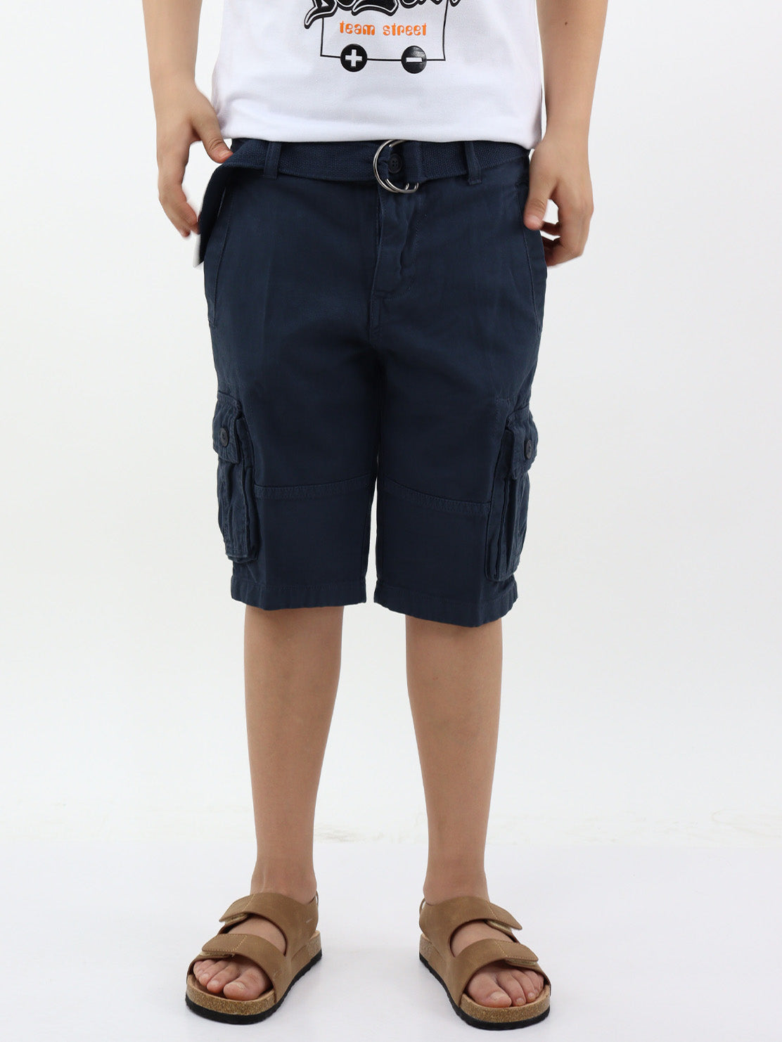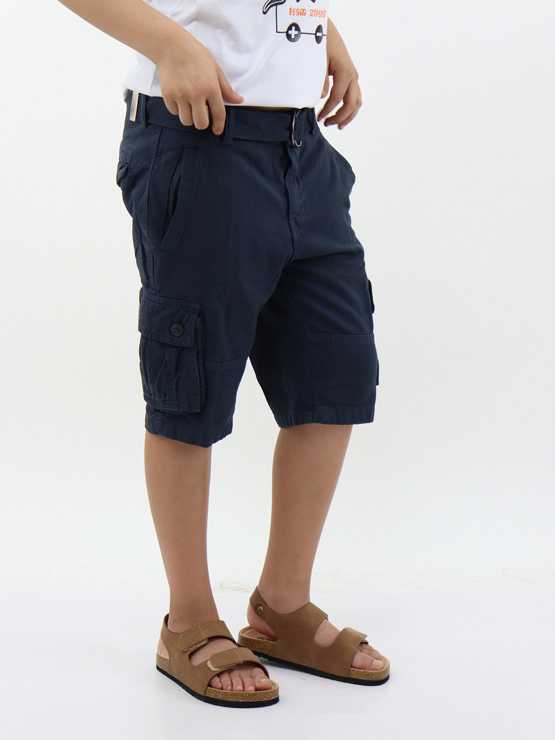 Bermuda cargo con cinturón, con bolsillos cargo en los laterales. Cierre de cremallera y botón de color azul
