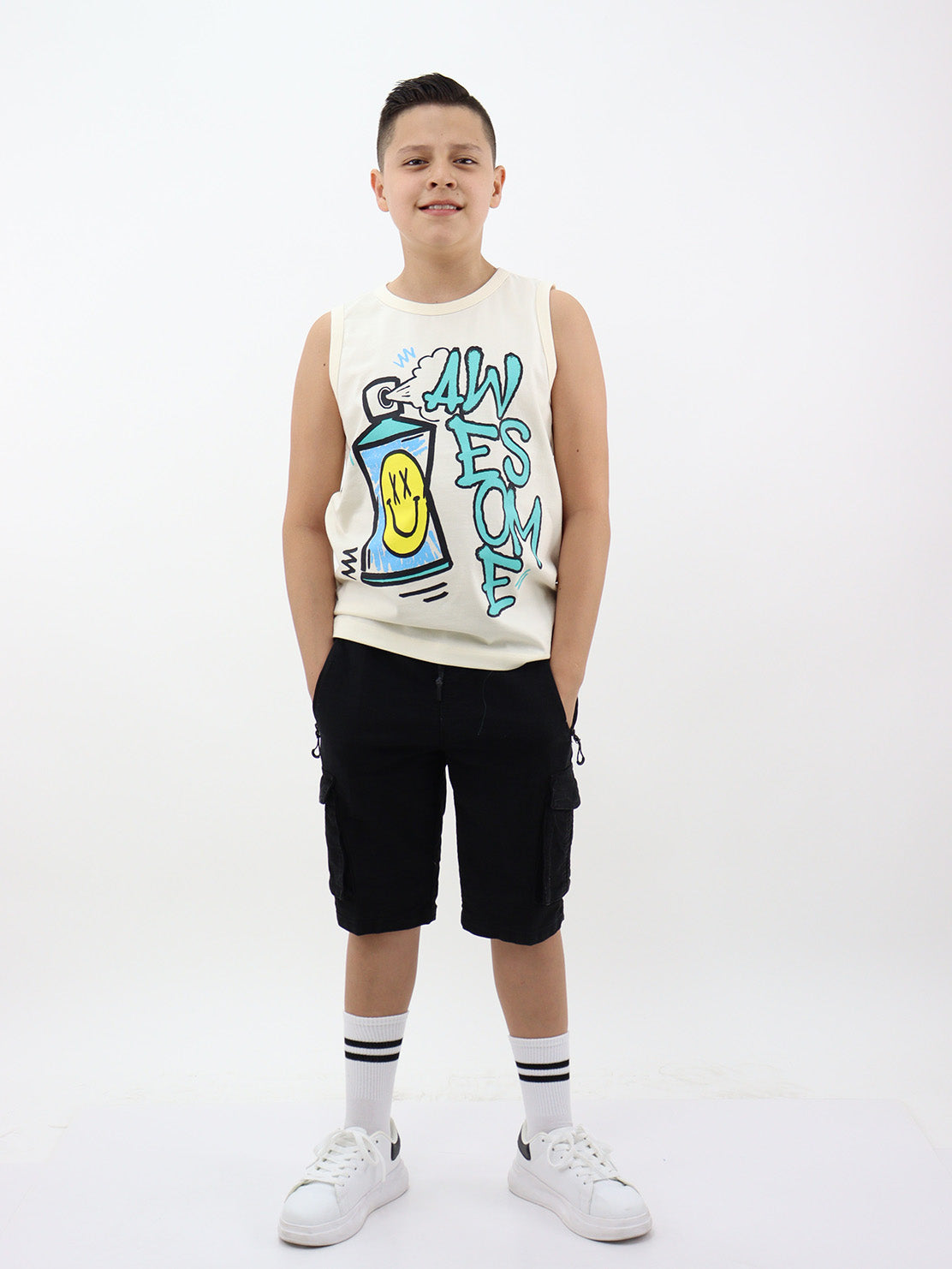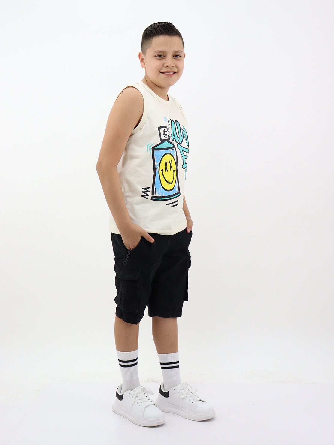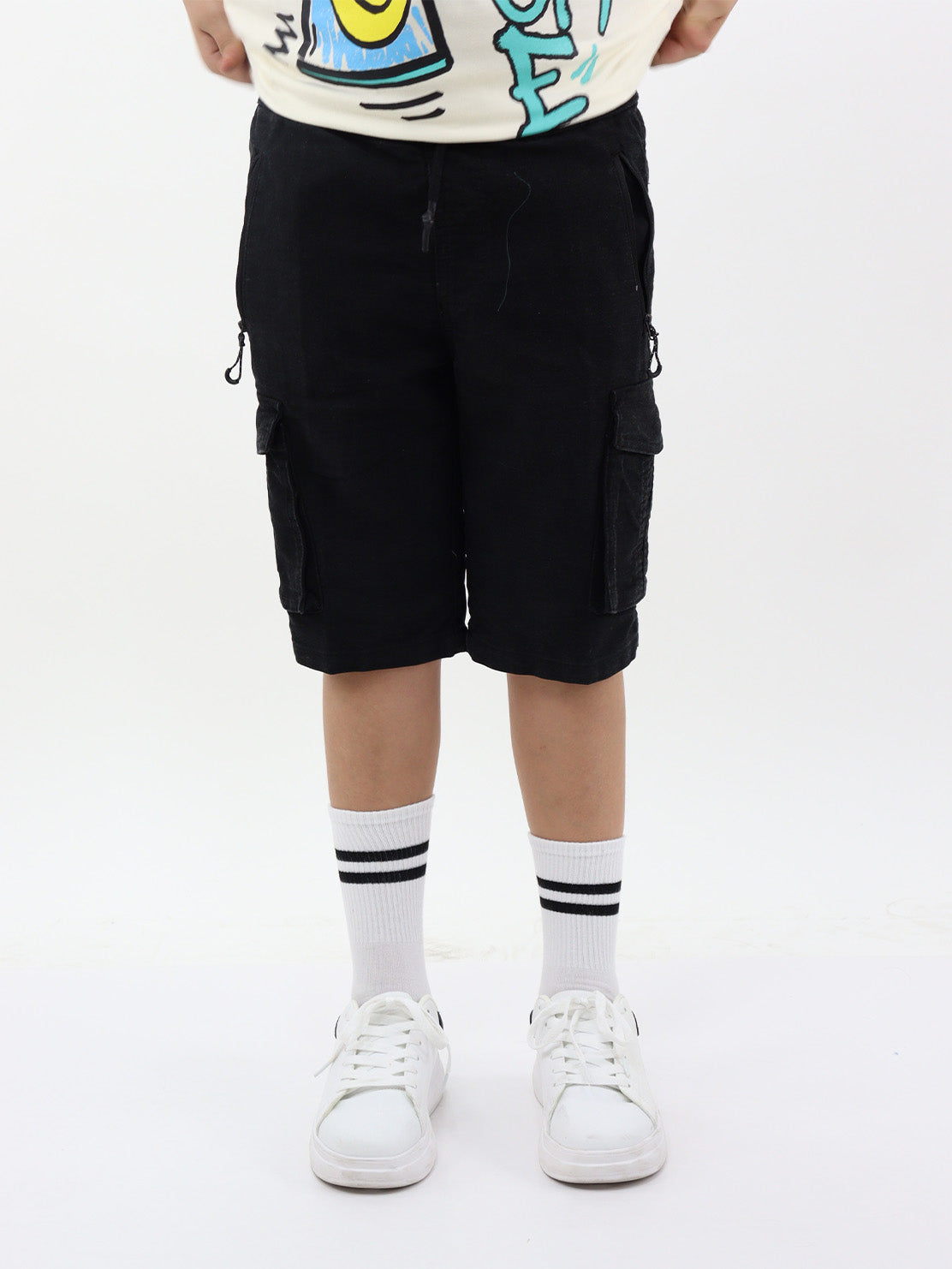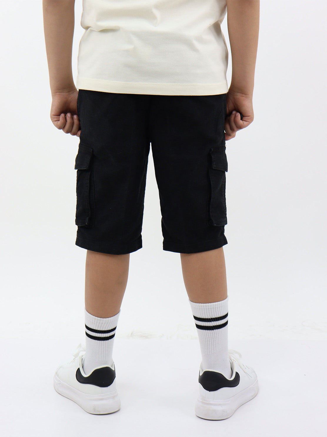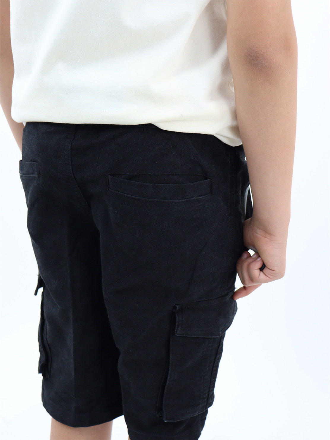 Bermuda cargo de gabardina color negro, con cinturilla elástica y cordón para ajustar. Detalle de bolsillos en la espalda.