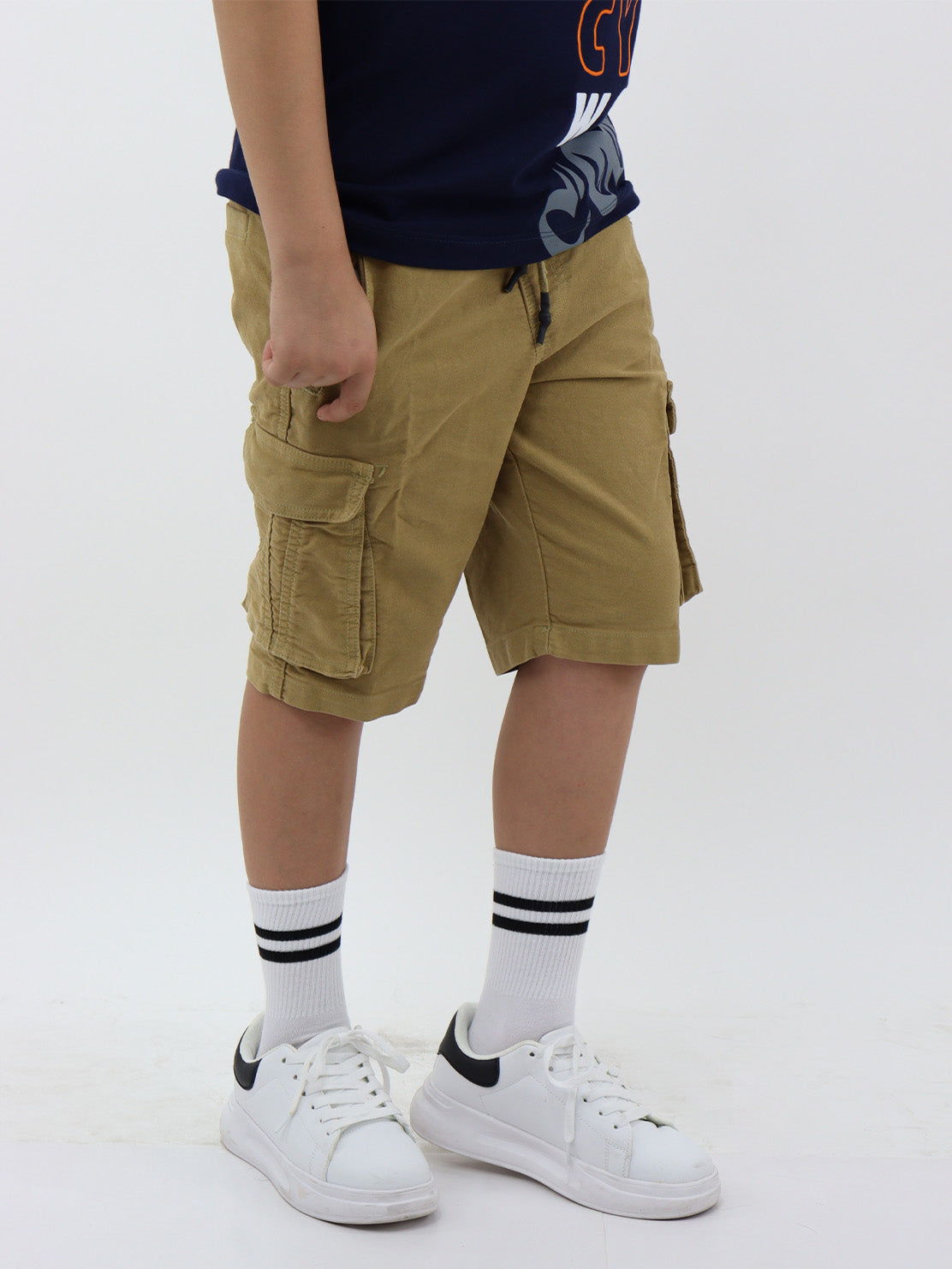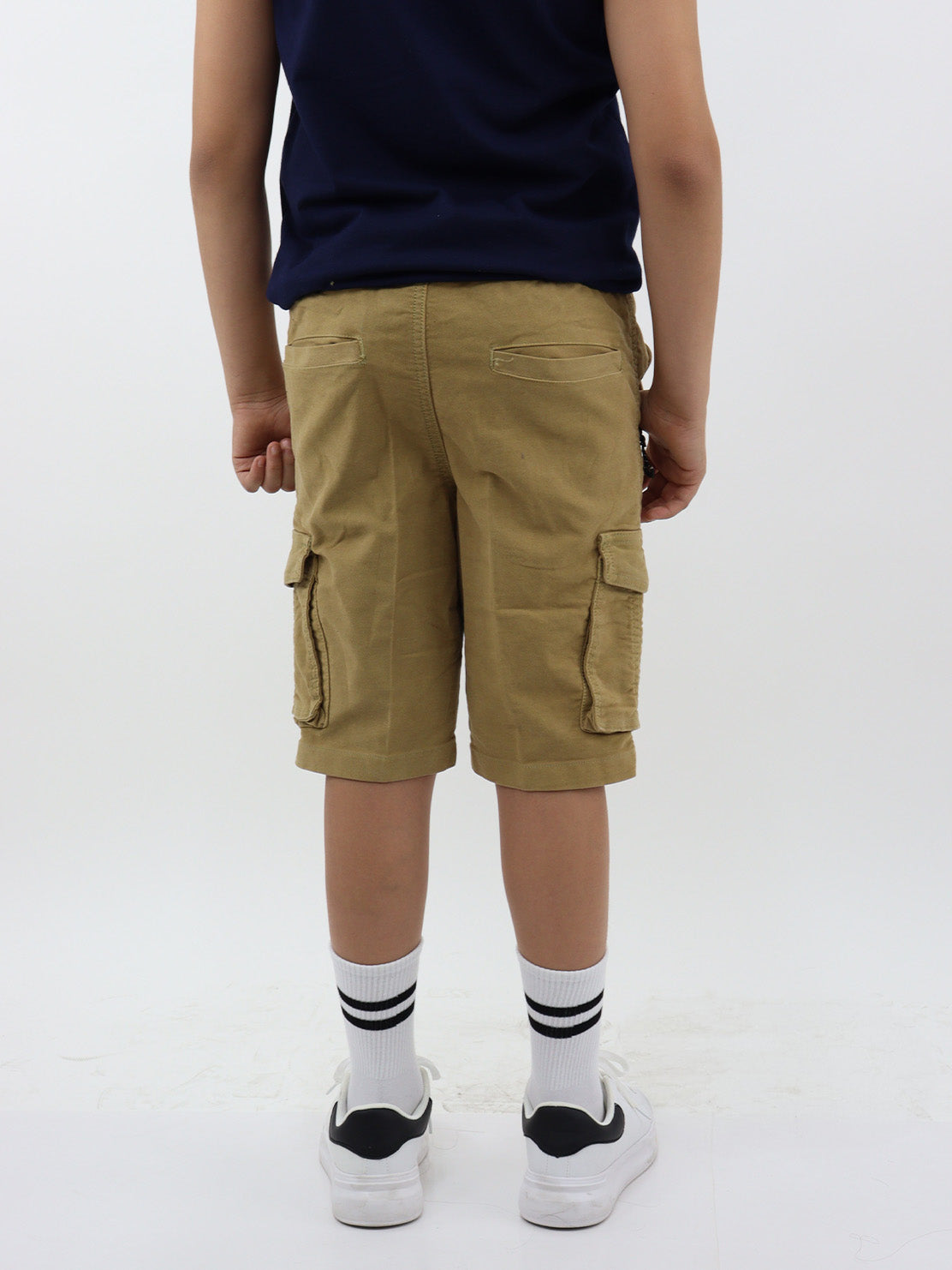 Bermuda cargo de gabardina color khaki, con cinturilla elástica y cordón para ajustar. Detalle de bolsillos en la espalda.
