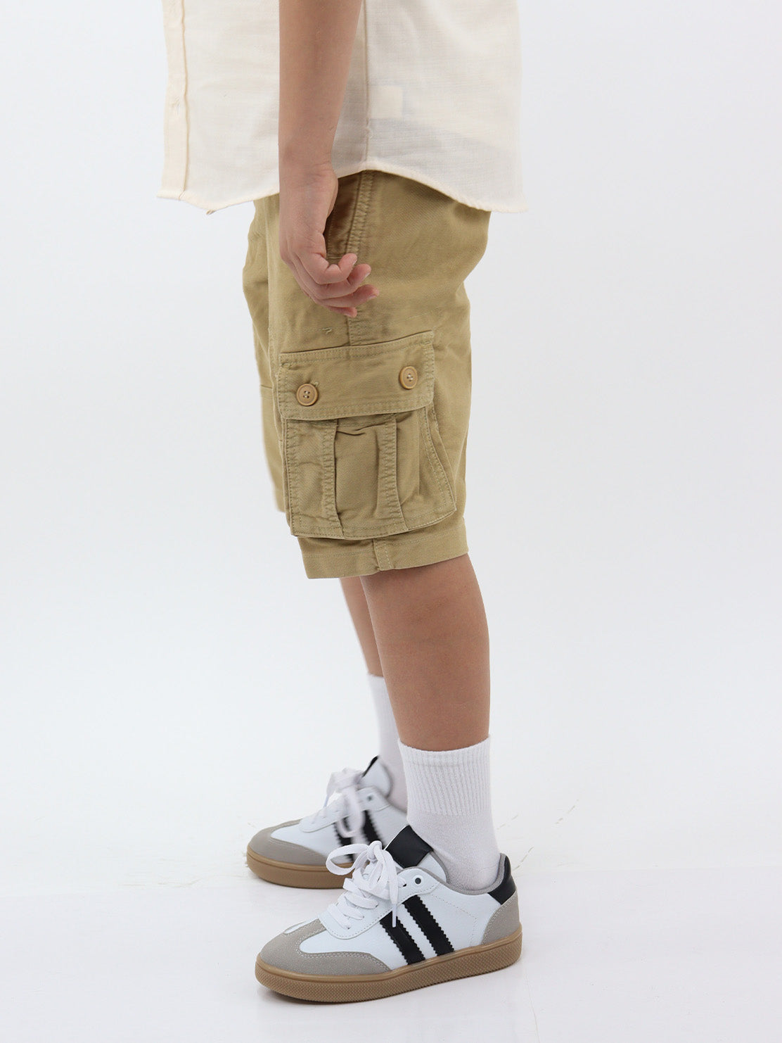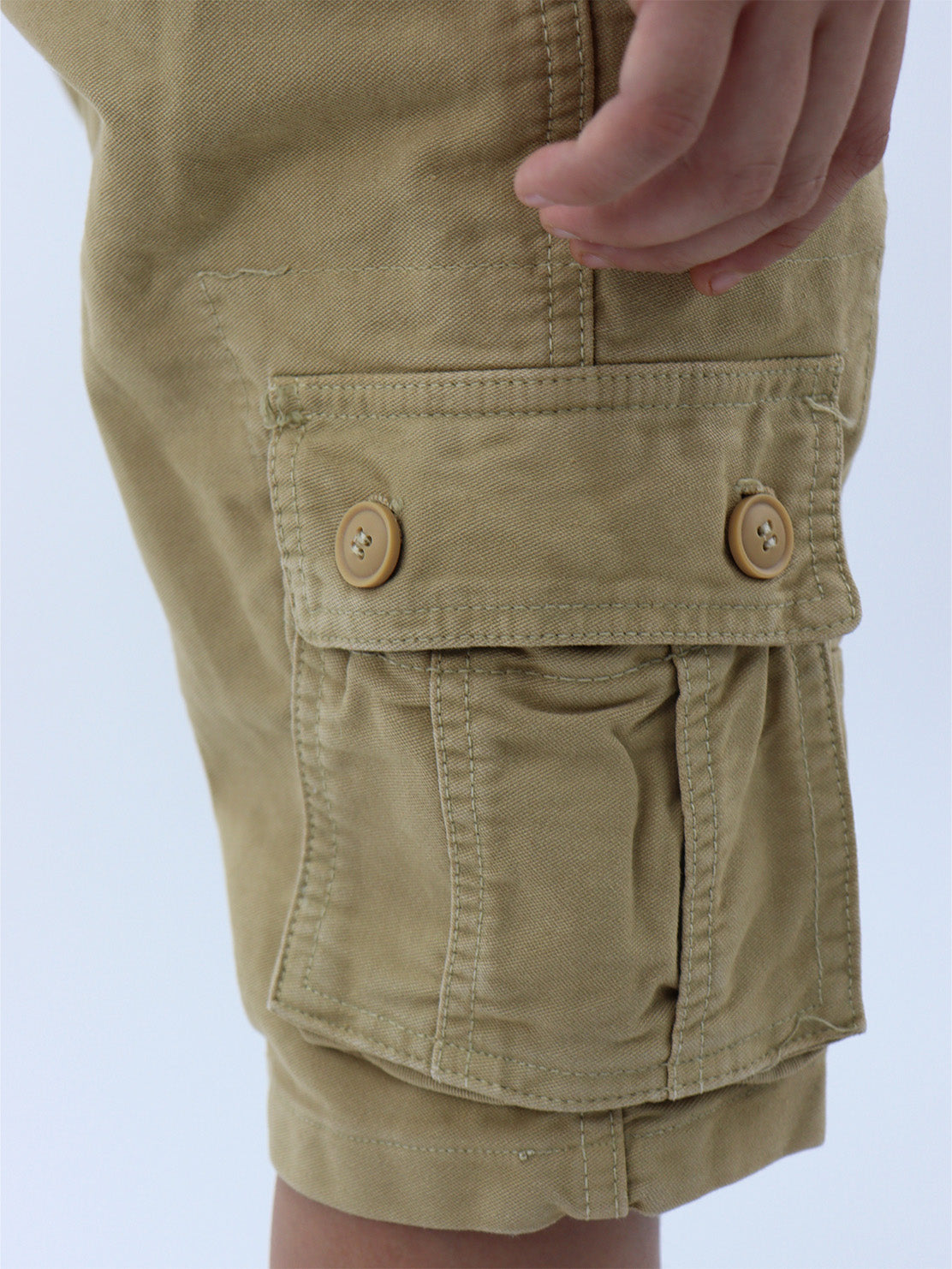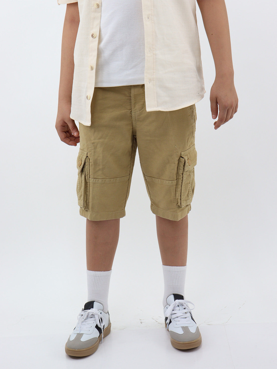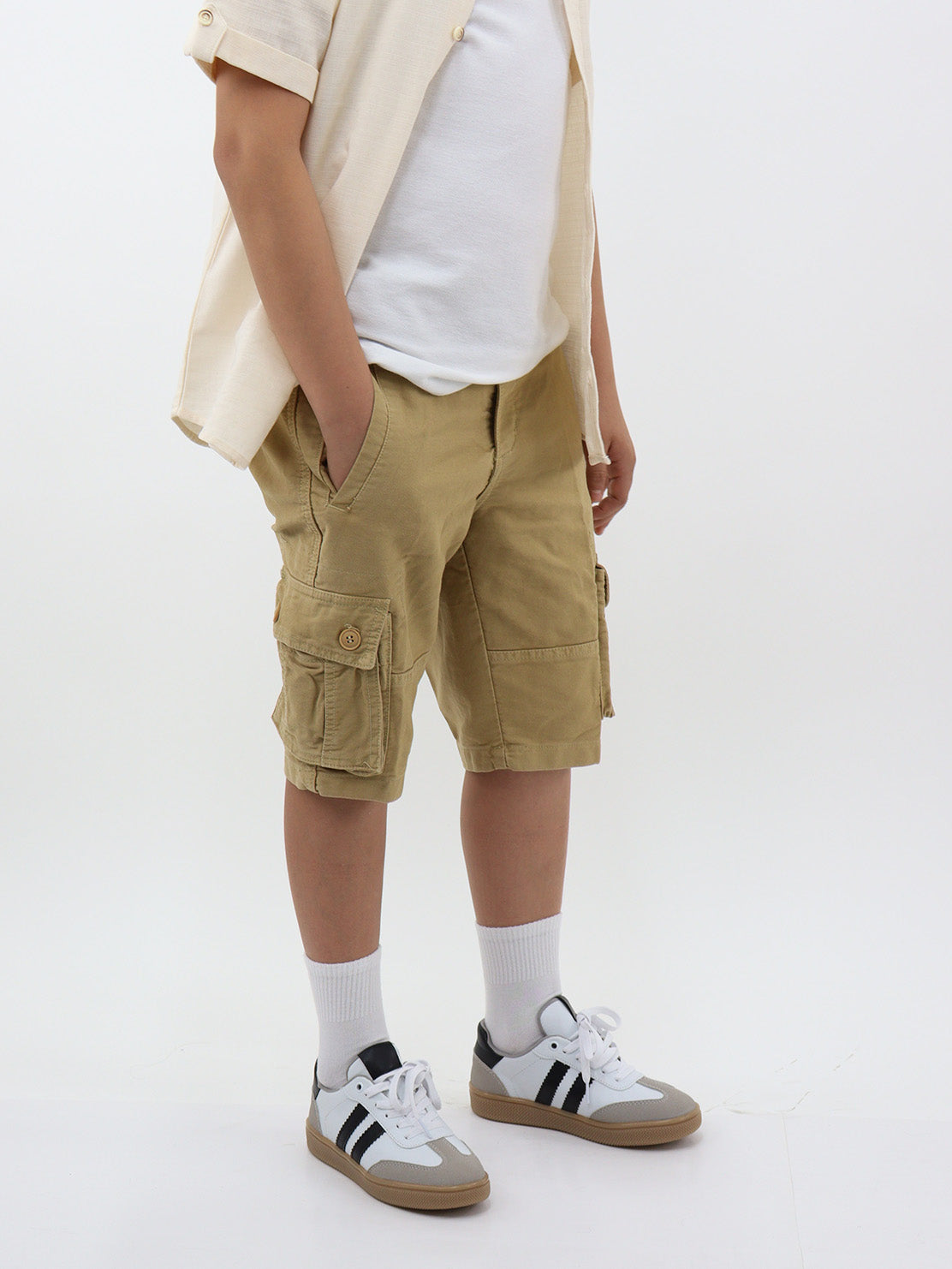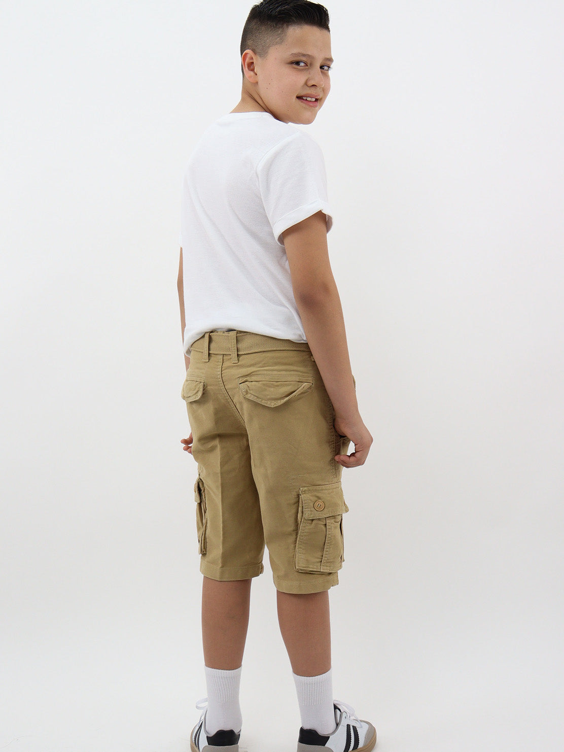 Bermuda cargo con cinturón, con bolsillos cargo en los laterales. Cierre de cremallera y botón de color camel