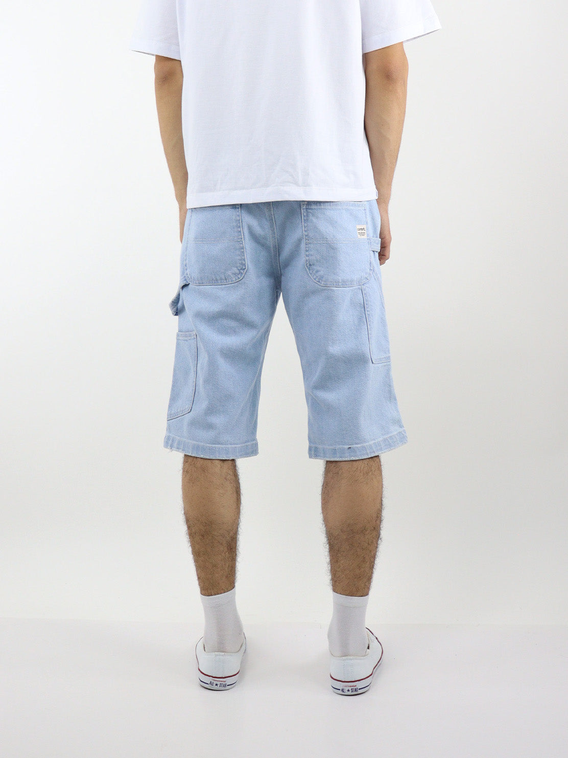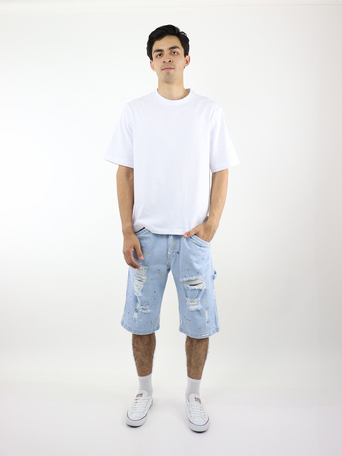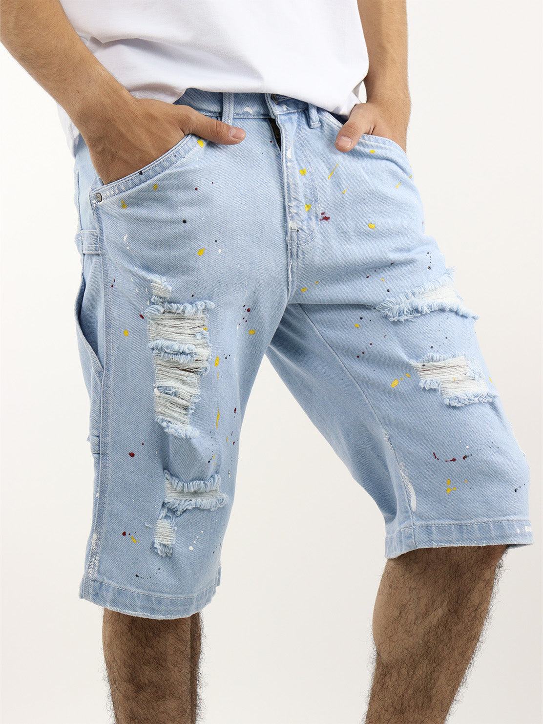 Bermuda con destrucción y pigmento, con bolsillos en la parte delantera y trasera, cierre de botón y cremallera. Lavado azul claro, ligeramente ensuciado, aspecto usado.