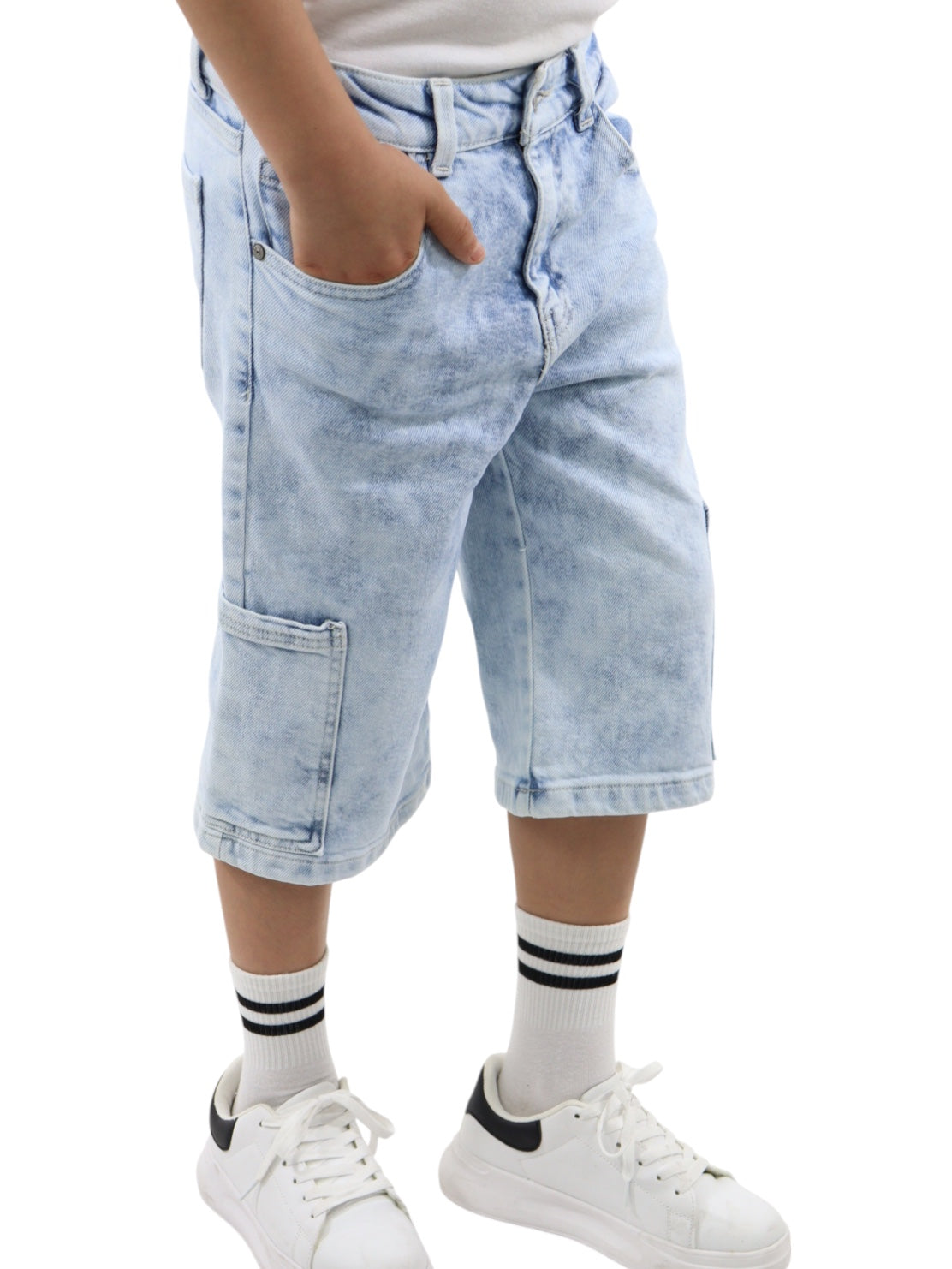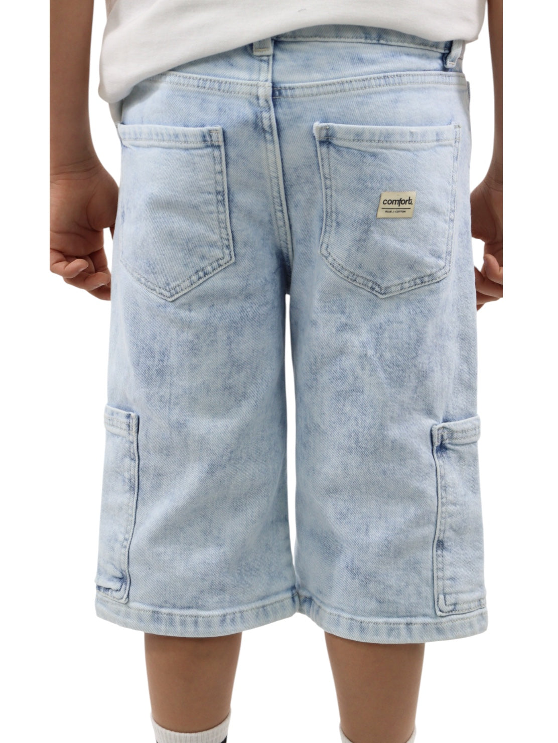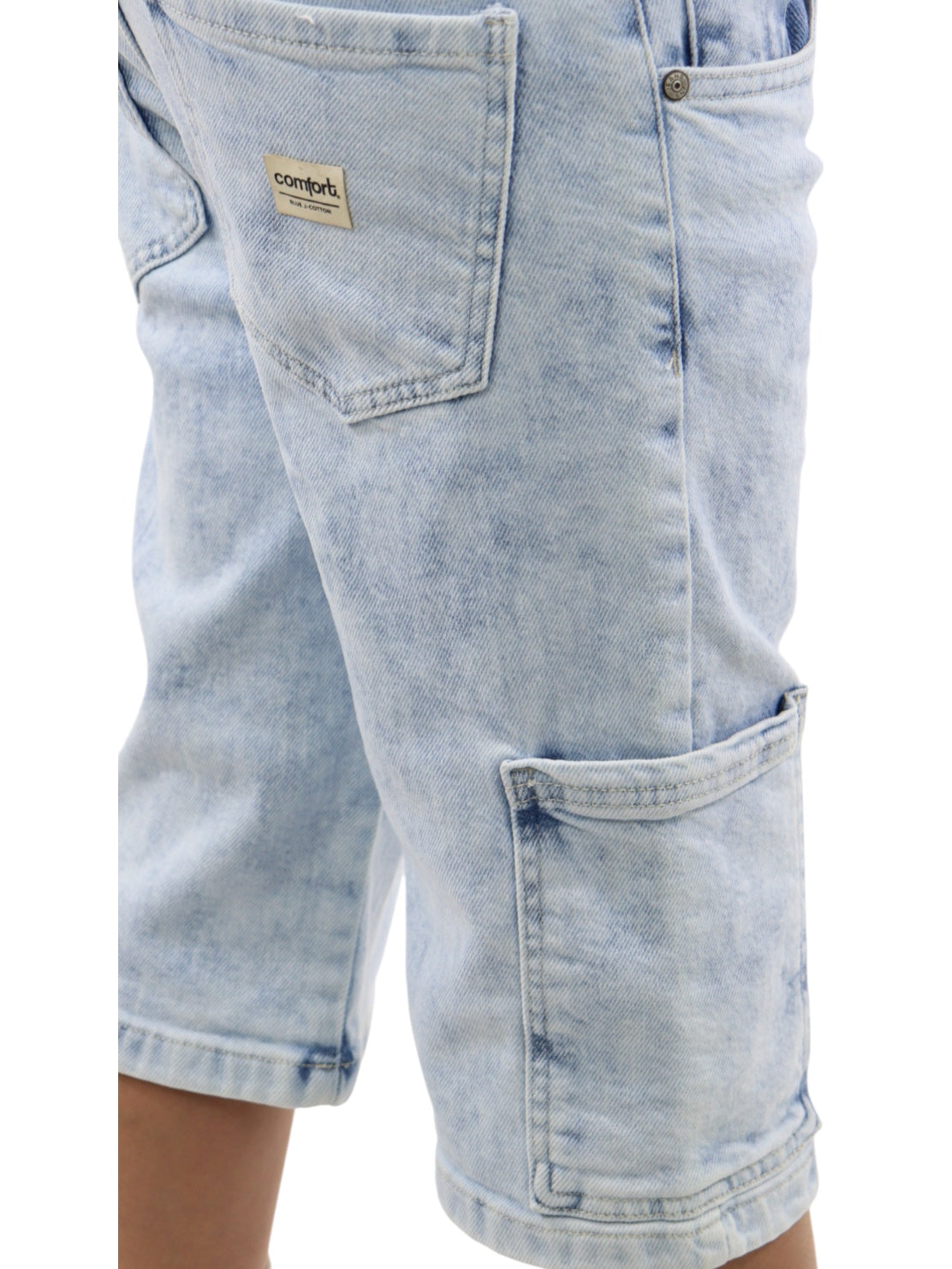 Bermuda cargo de mezclilla, con bolsillos en la parte delantera y trasera, cierre de botón y cremallera. Lavado azul claro con snow