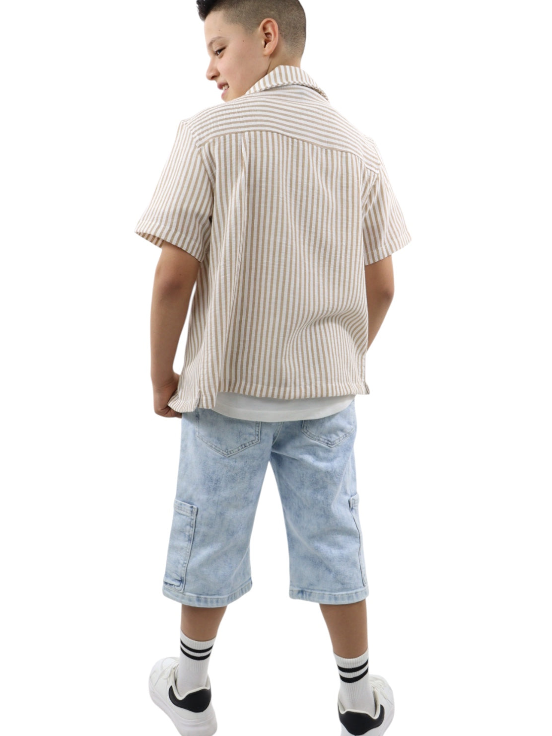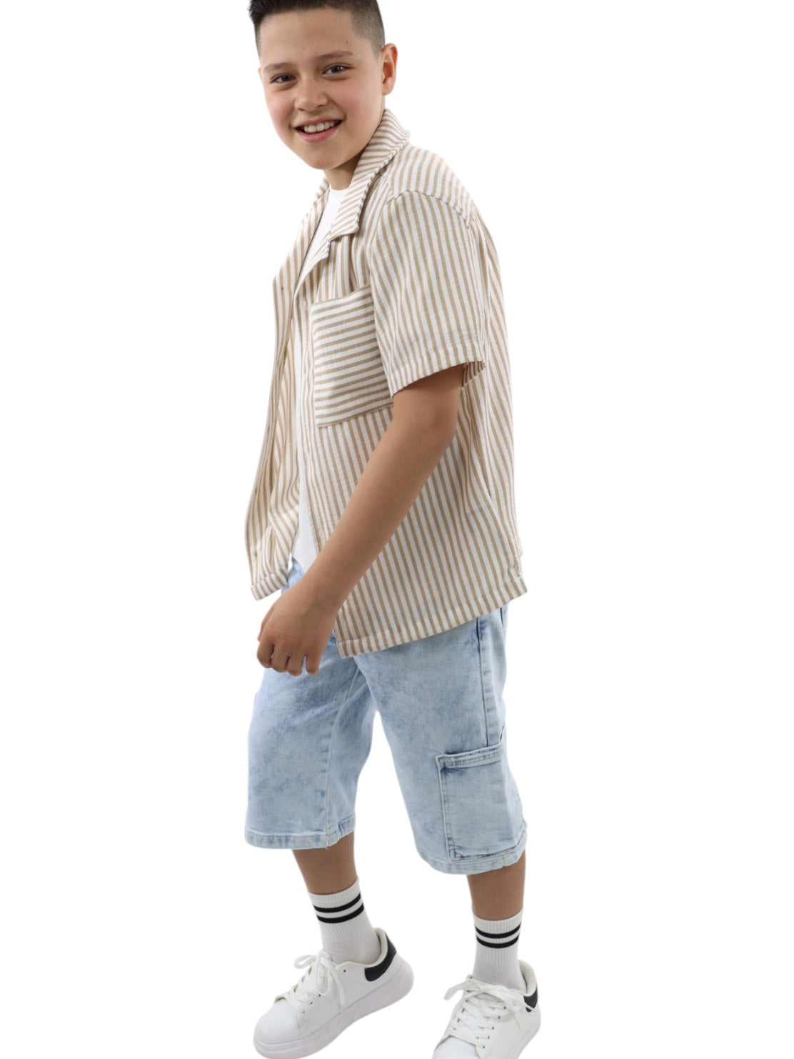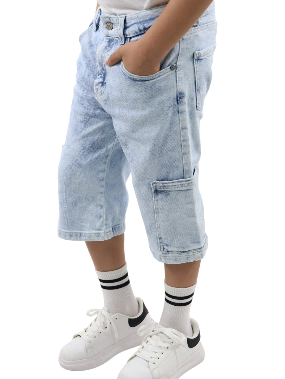 Bermuda cargo de mezclilla, con bolsillos en la parte delantera y trasera, cierre de botón y cremallera. Lavado azul claro con snow