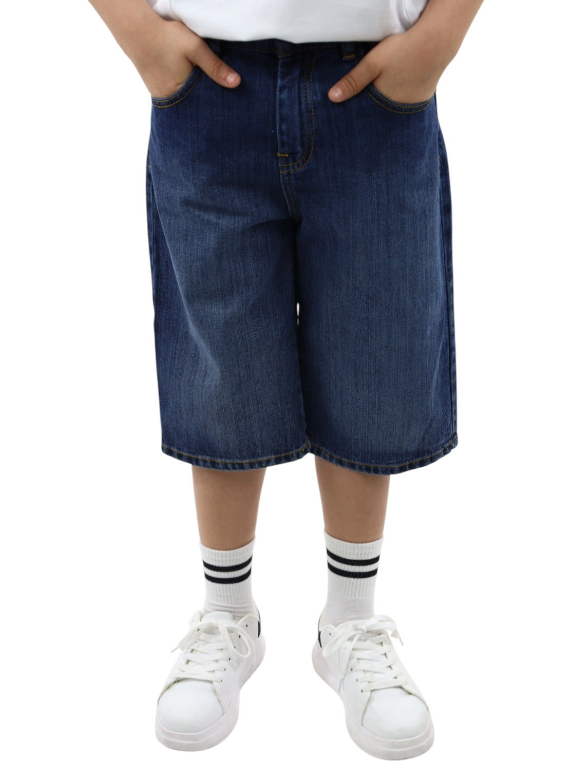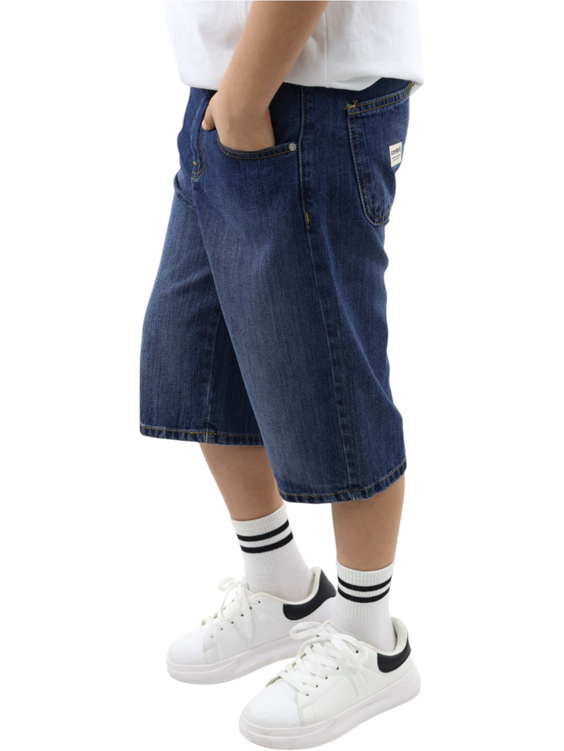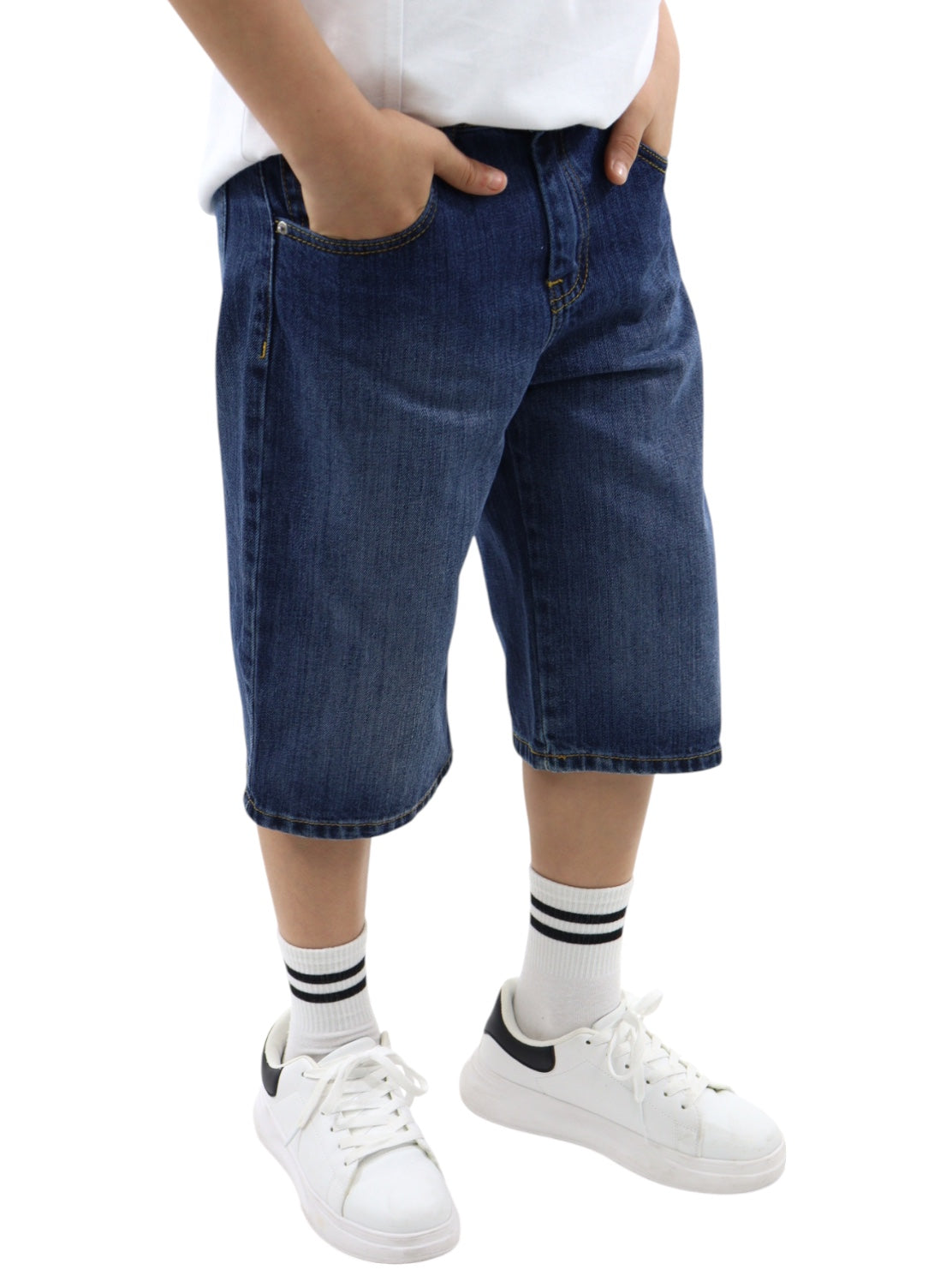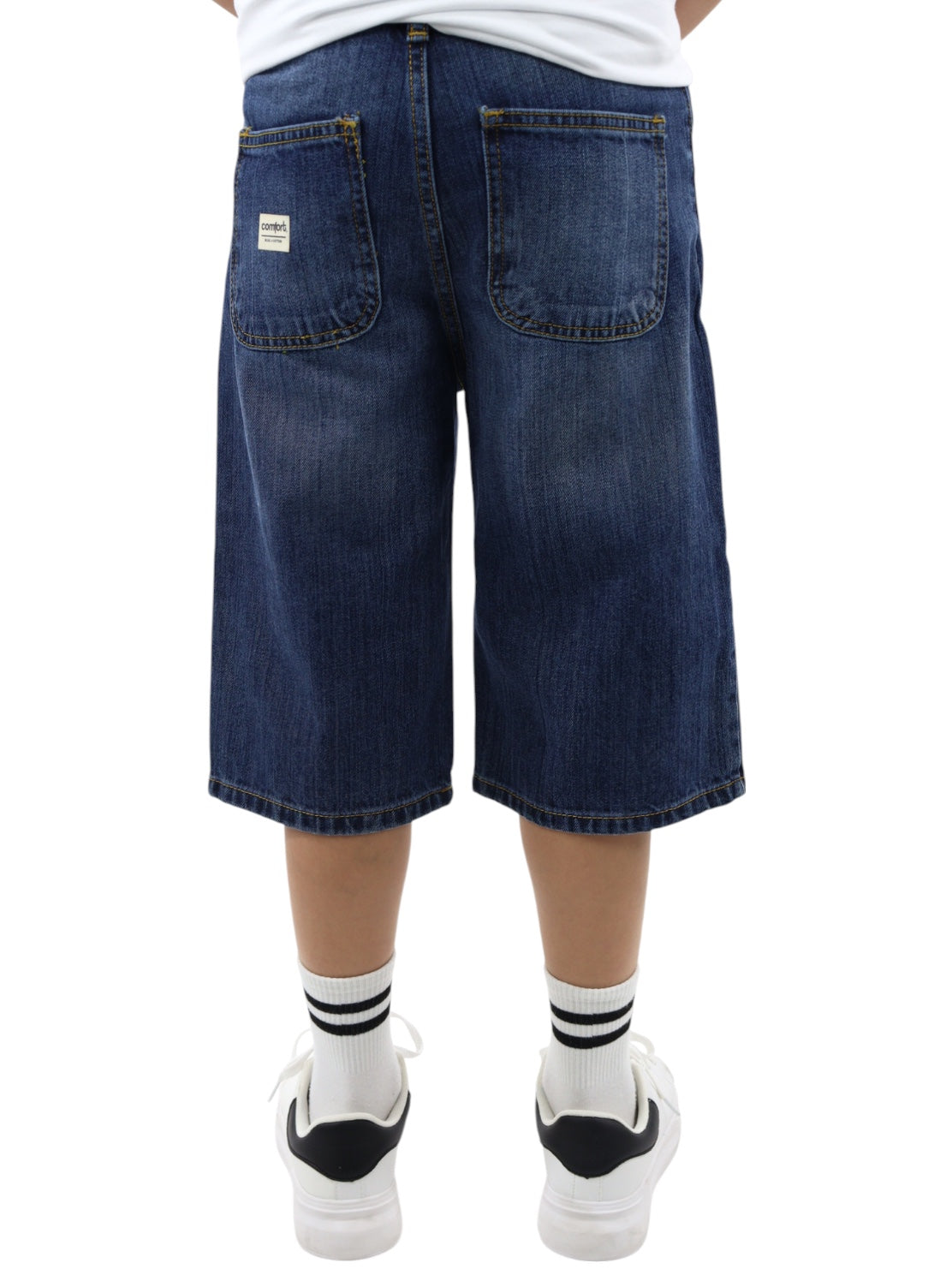 Bermuda cargo de mezclilla, con bolsillos en la parte delantera y trasera, cierre de botón y cremallera. Lavado azul oscuro