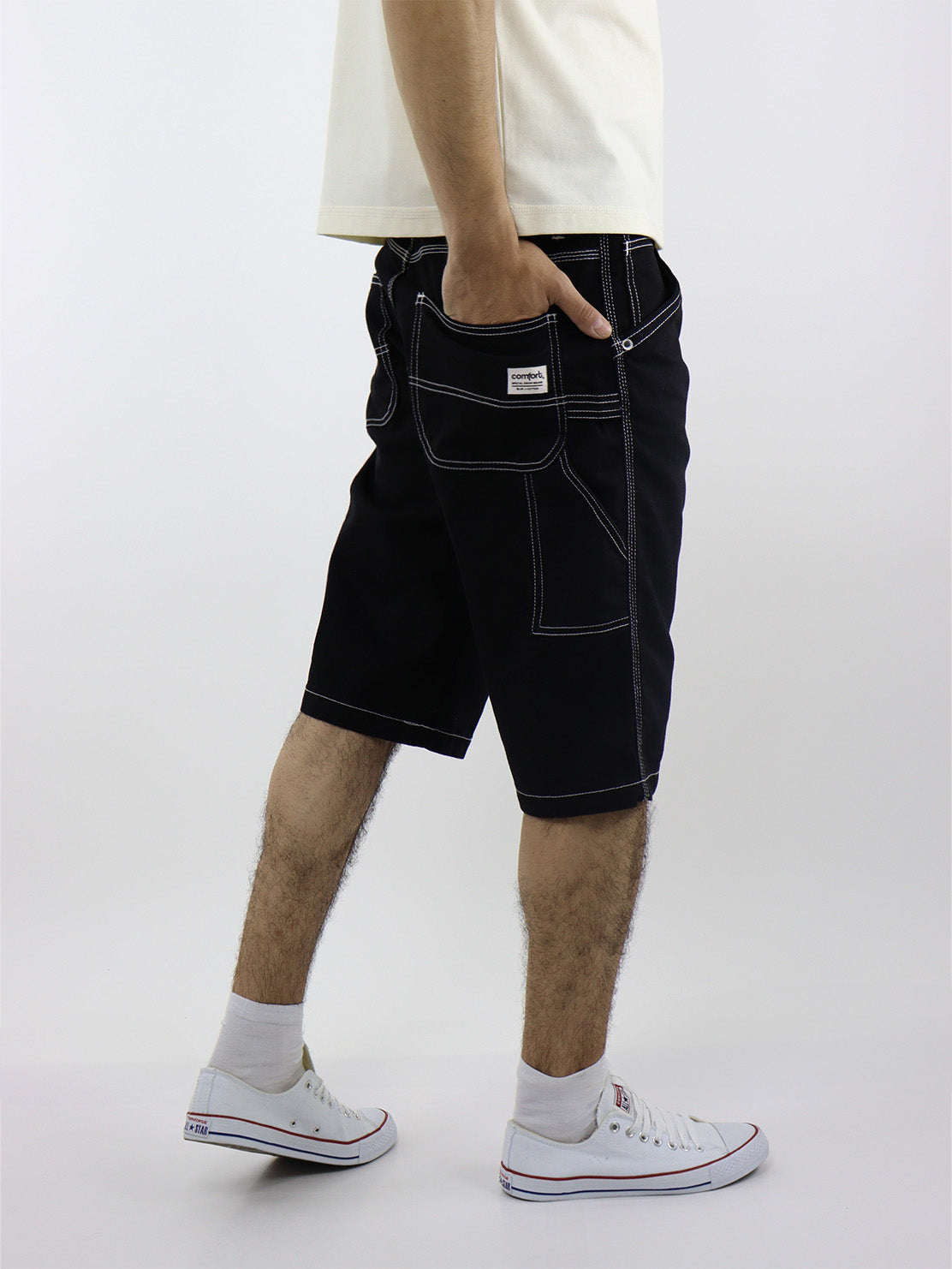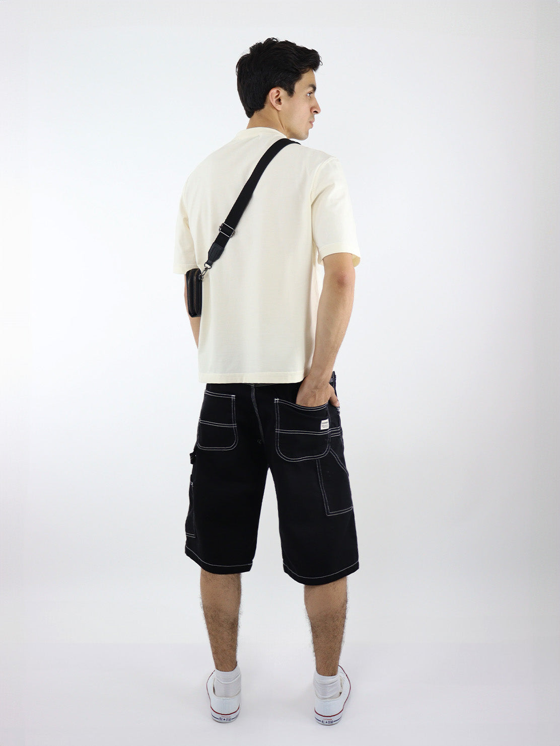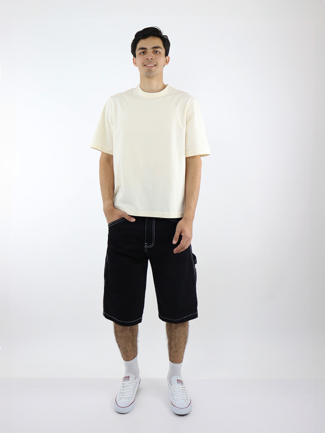 Bermuda de mezclilla de talle alto, lavado negro con costuras al contraste blancas, con cierre de botón y cremallera.