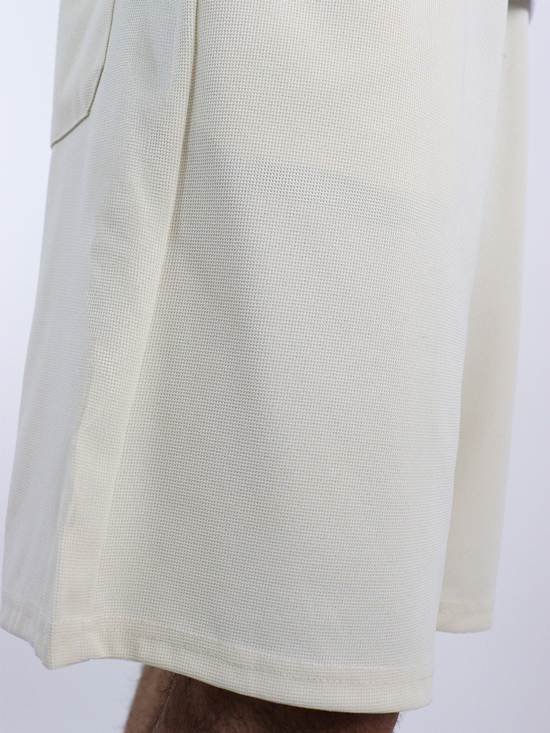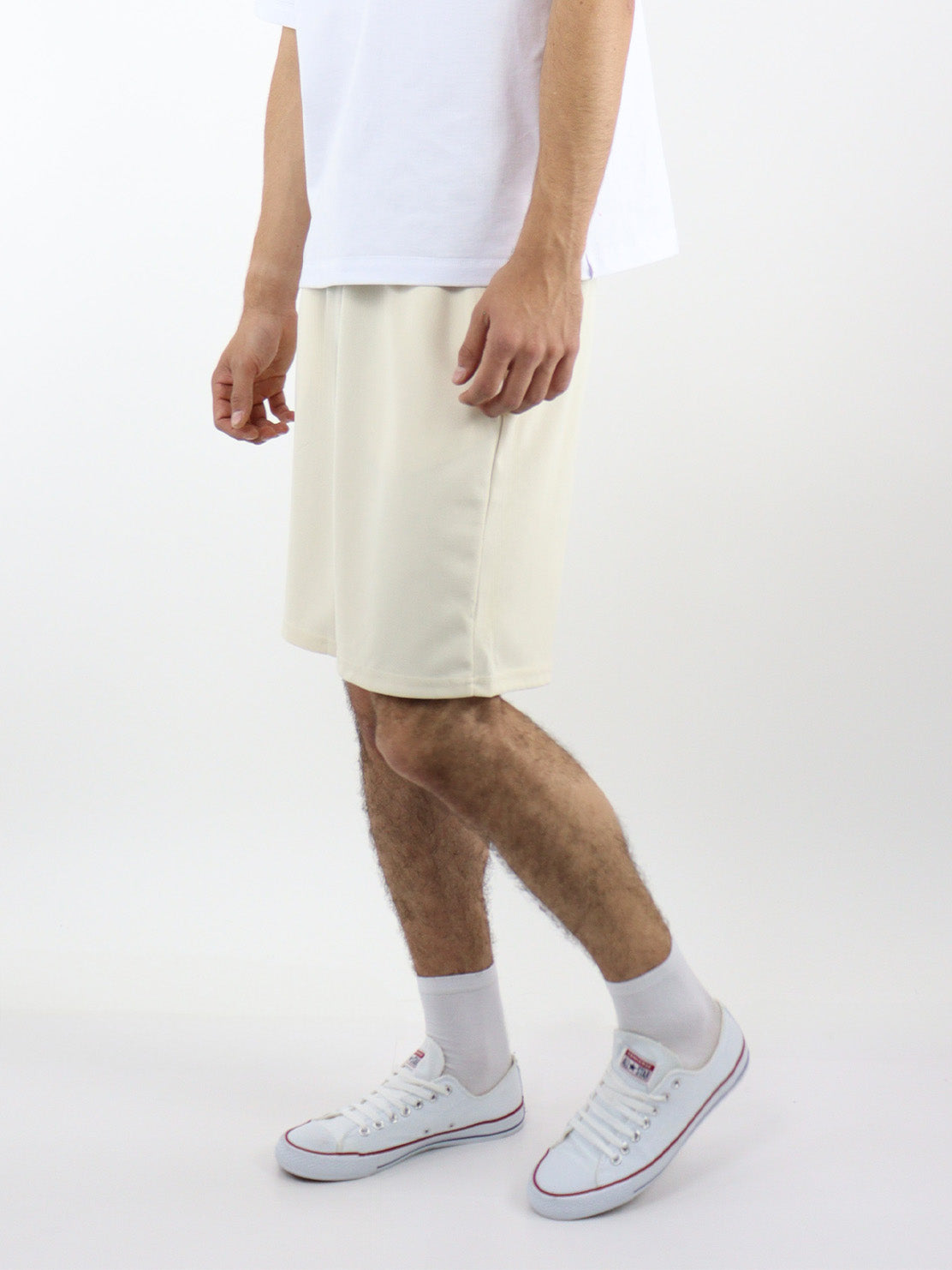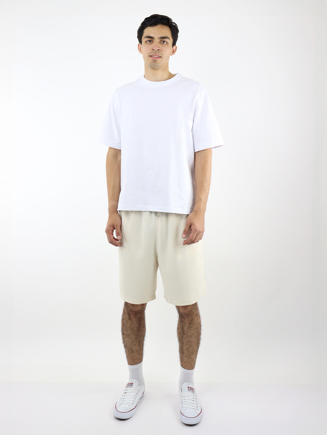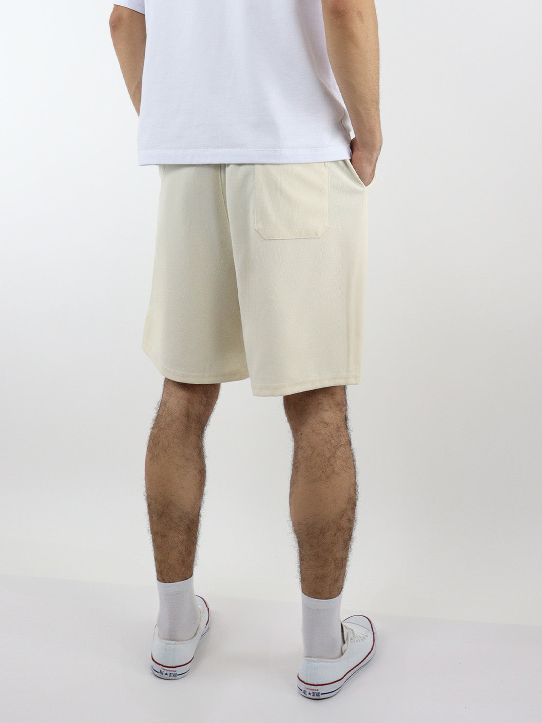 Pantalones cortos de tela ligera en tono beige, con cinturilla elástica y cordón para ajustar. Detalle de bolsillo en la espalda.