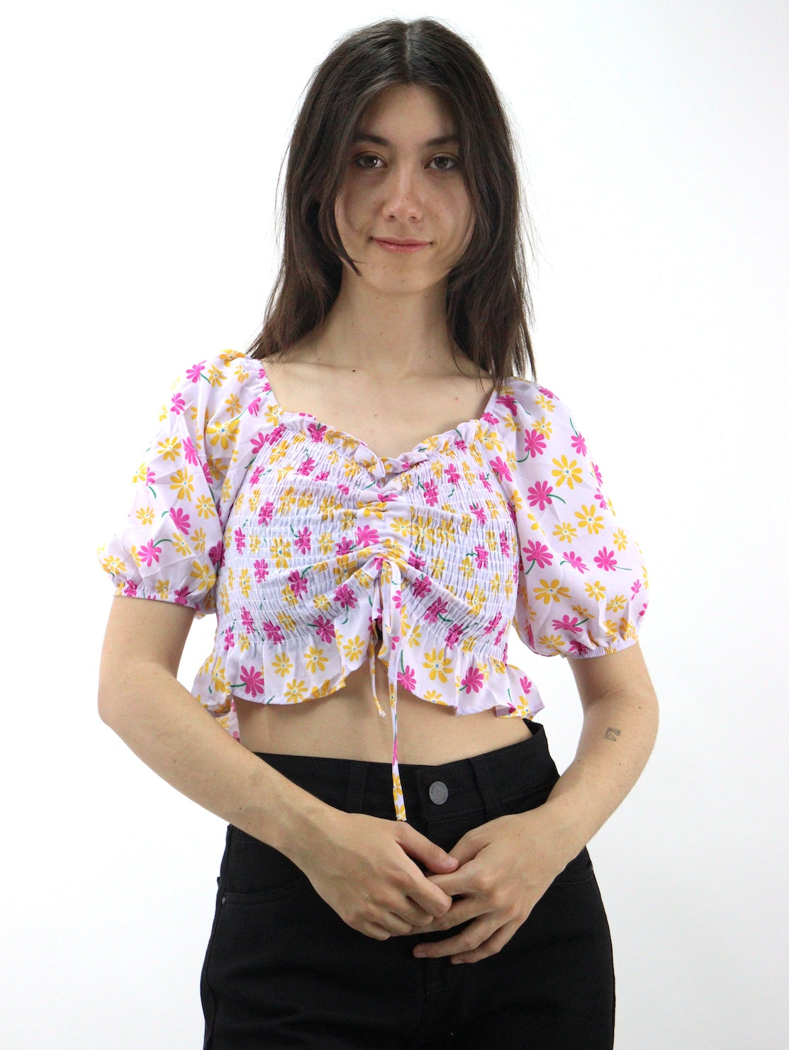 Blusa con estampado floral, cordón delantero, pecho con fruncido de manga farol