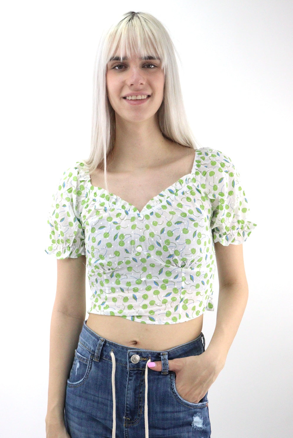 Blusa estampada de cereza con hombros descubiertos