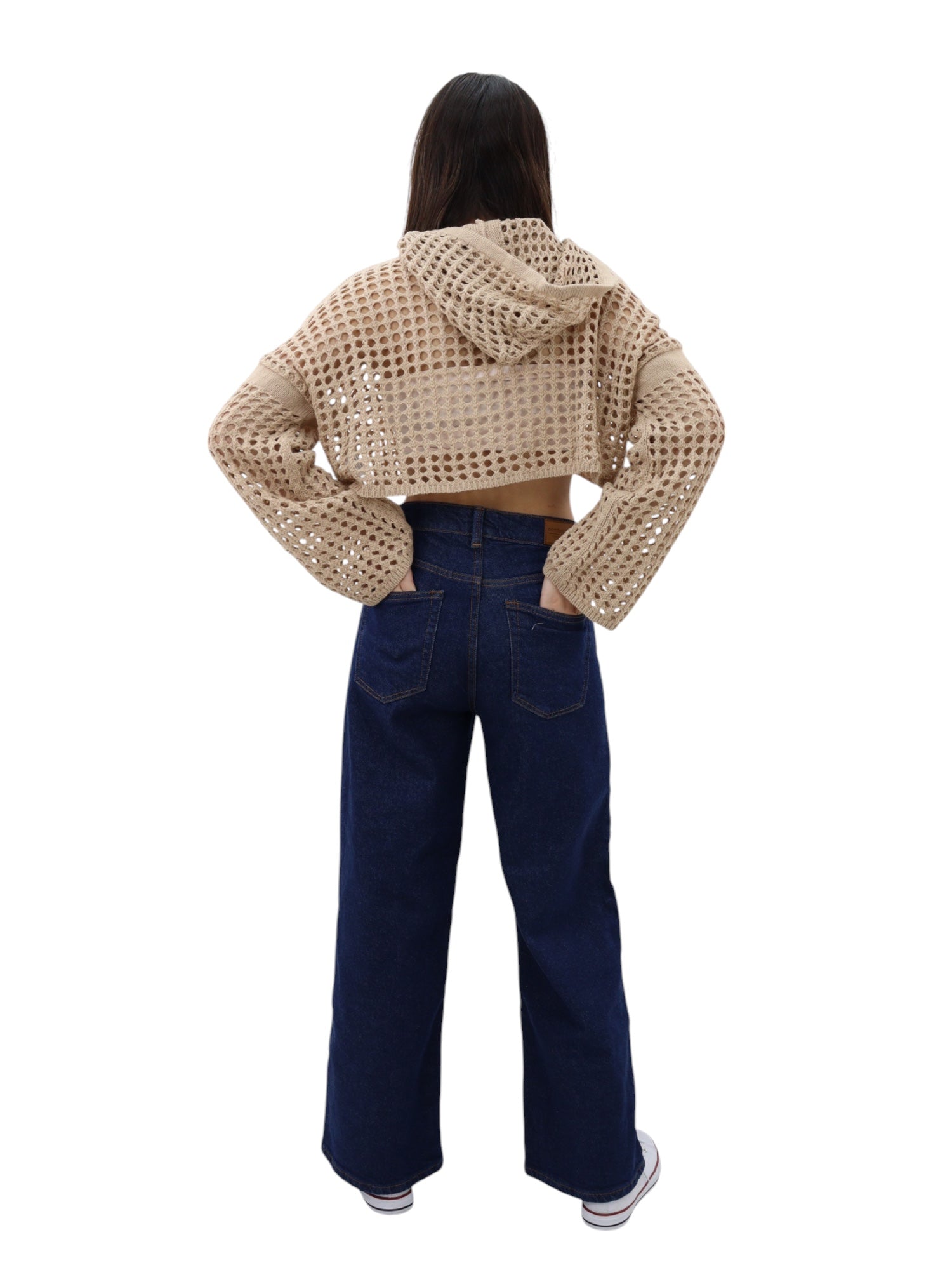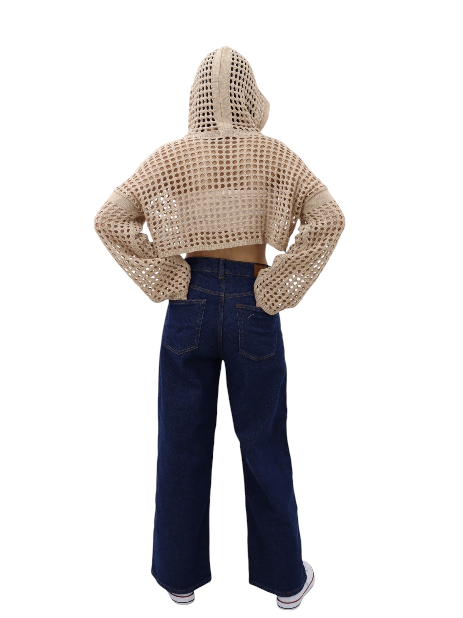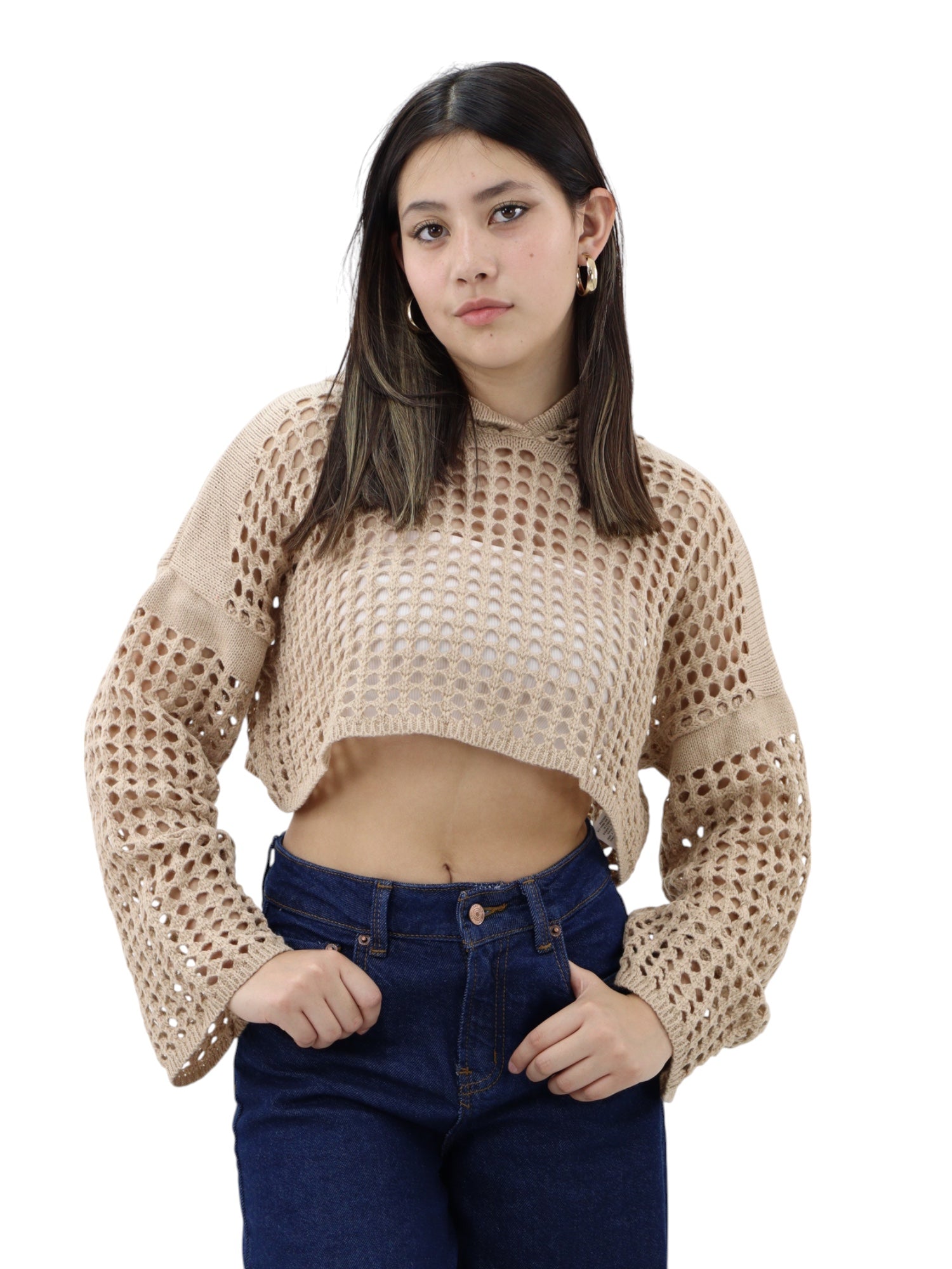Blusa manga larga tejida de color camel con capucha para mujer, uso casual diario
