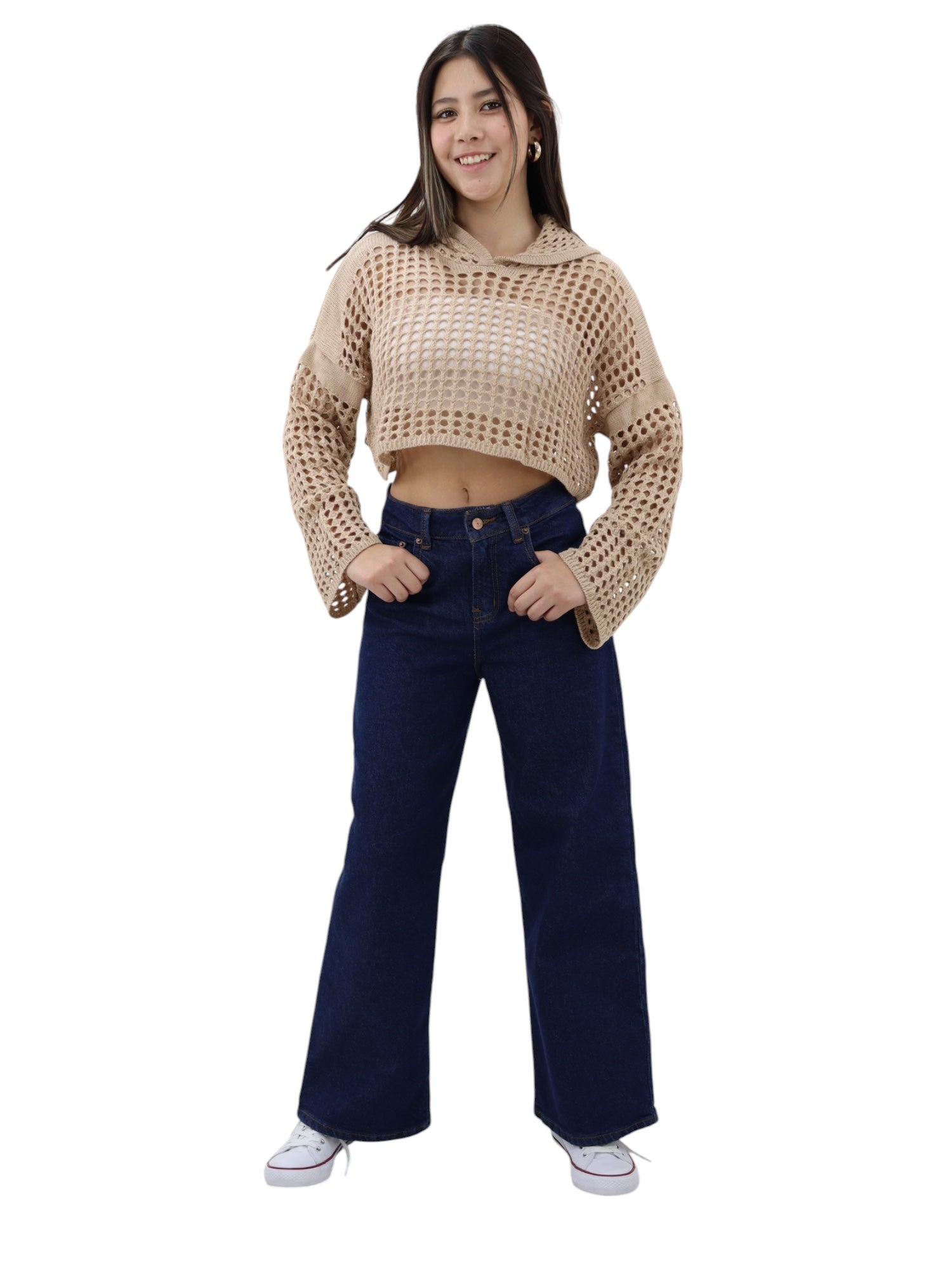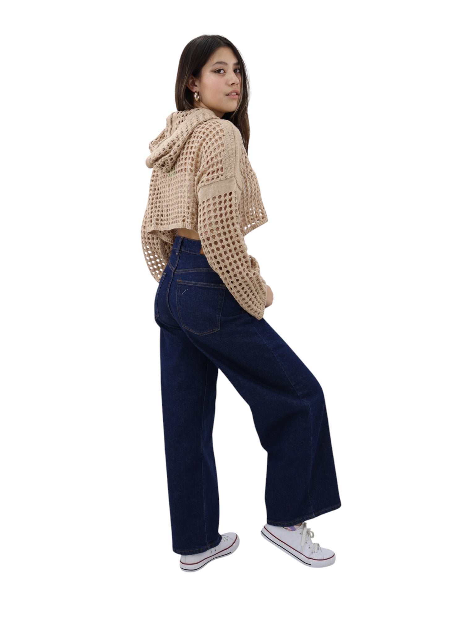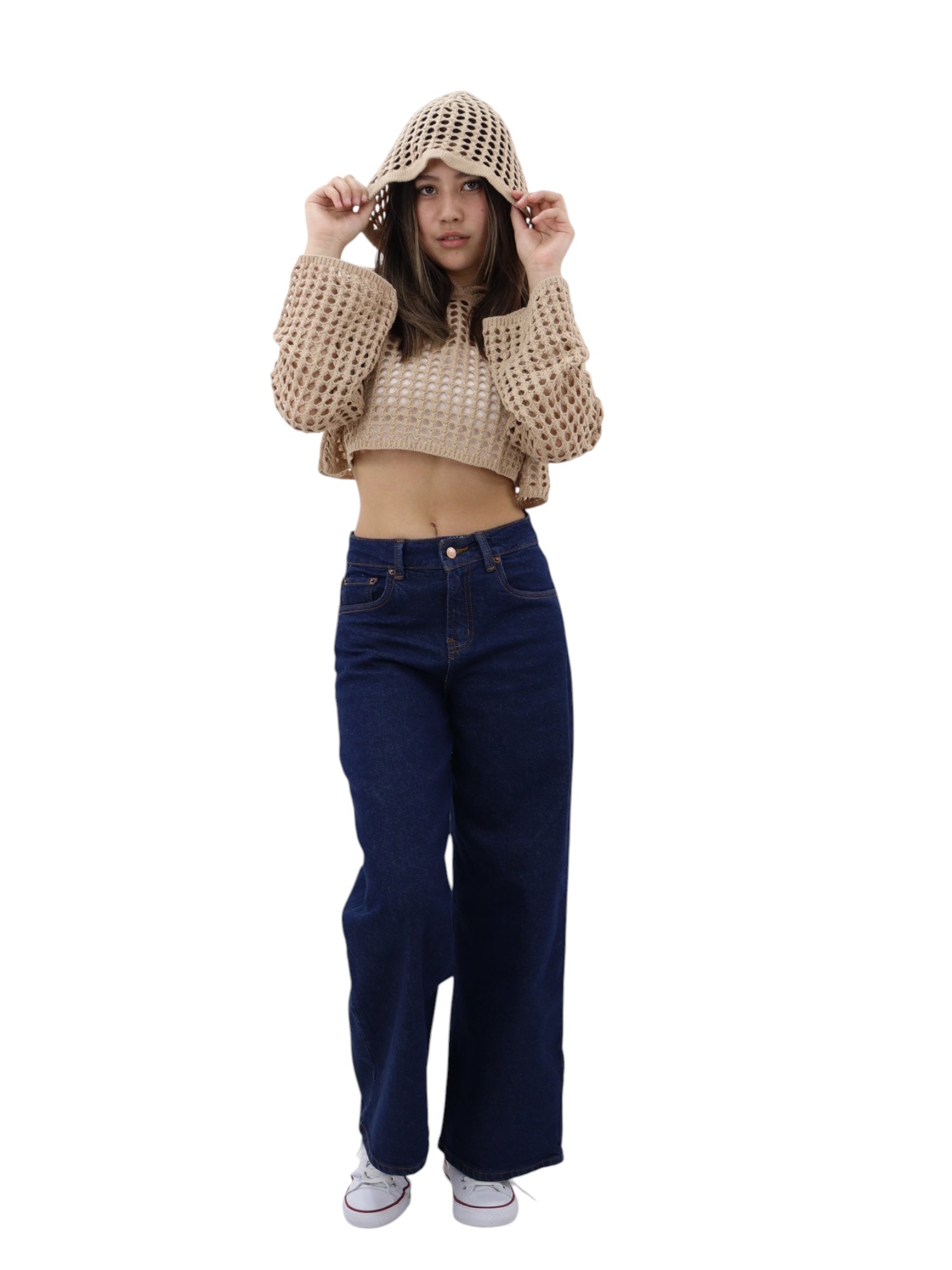 Blusa manga larga tejida de color camel con capucha para mujer, uso casual diario