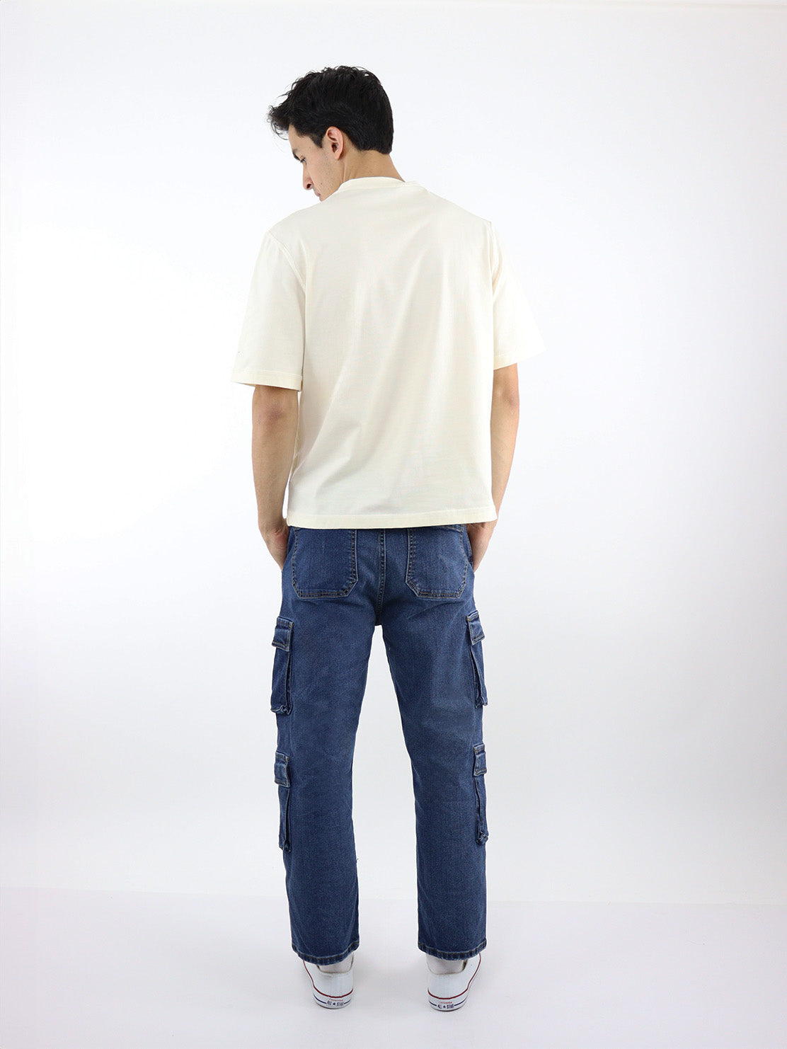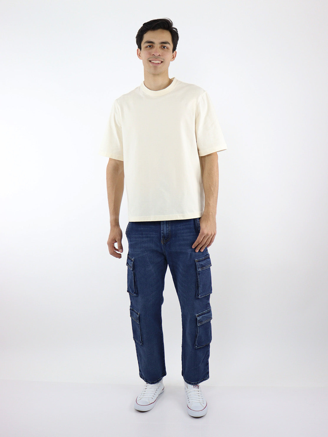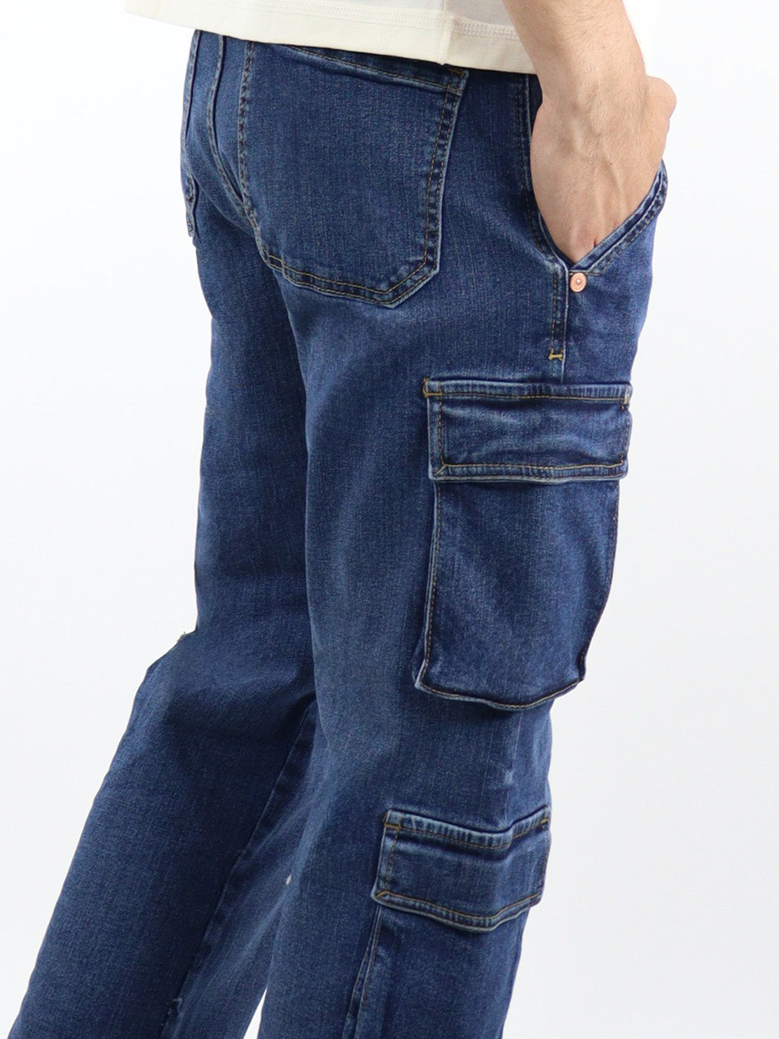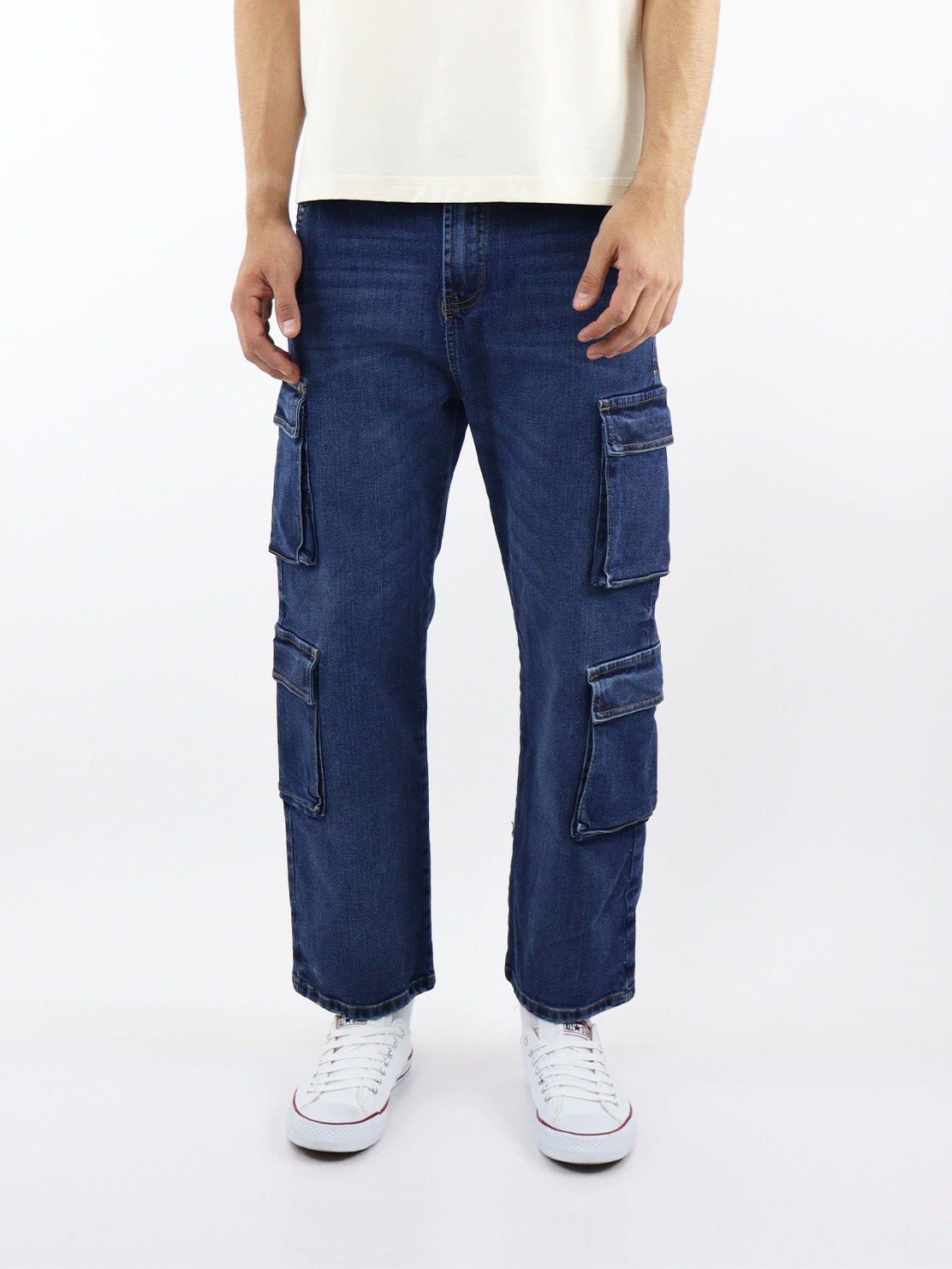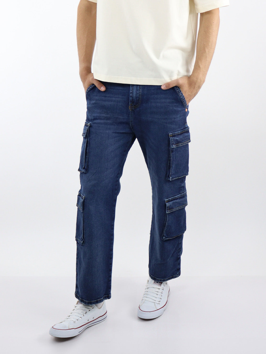 Baggy cargo con stretch lavado oscuro. Dos bolsillos laterales en ambas piernas, con tapeta, cierre de botón y cremallera.