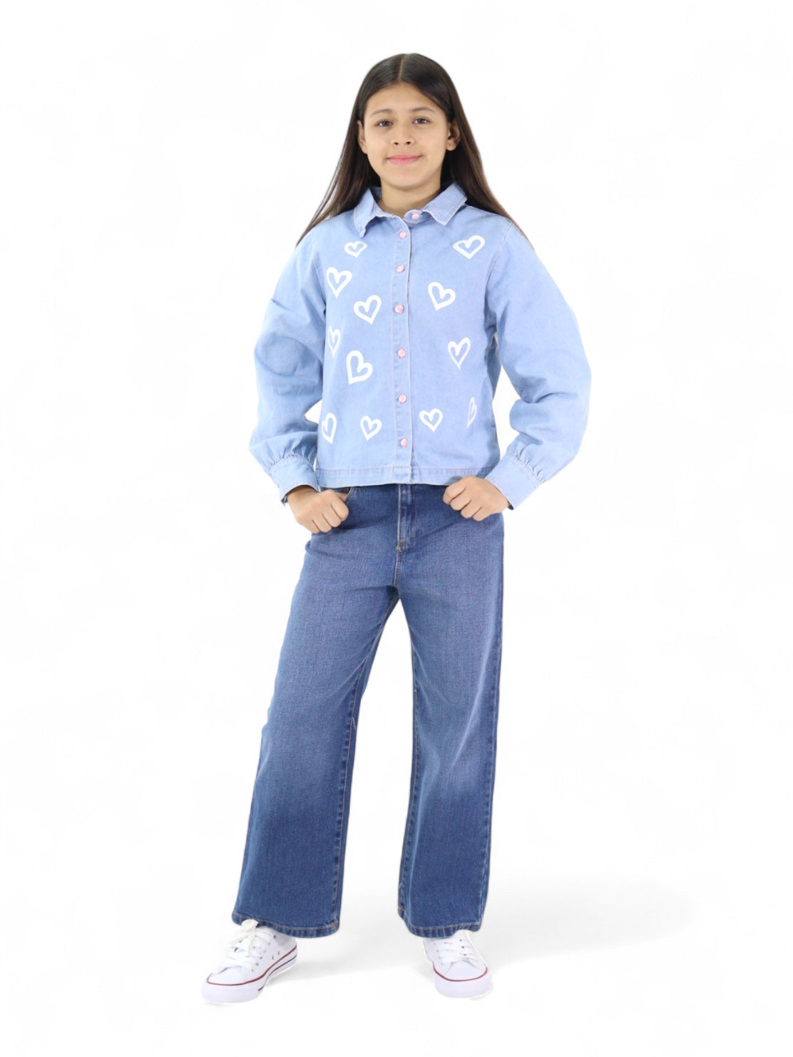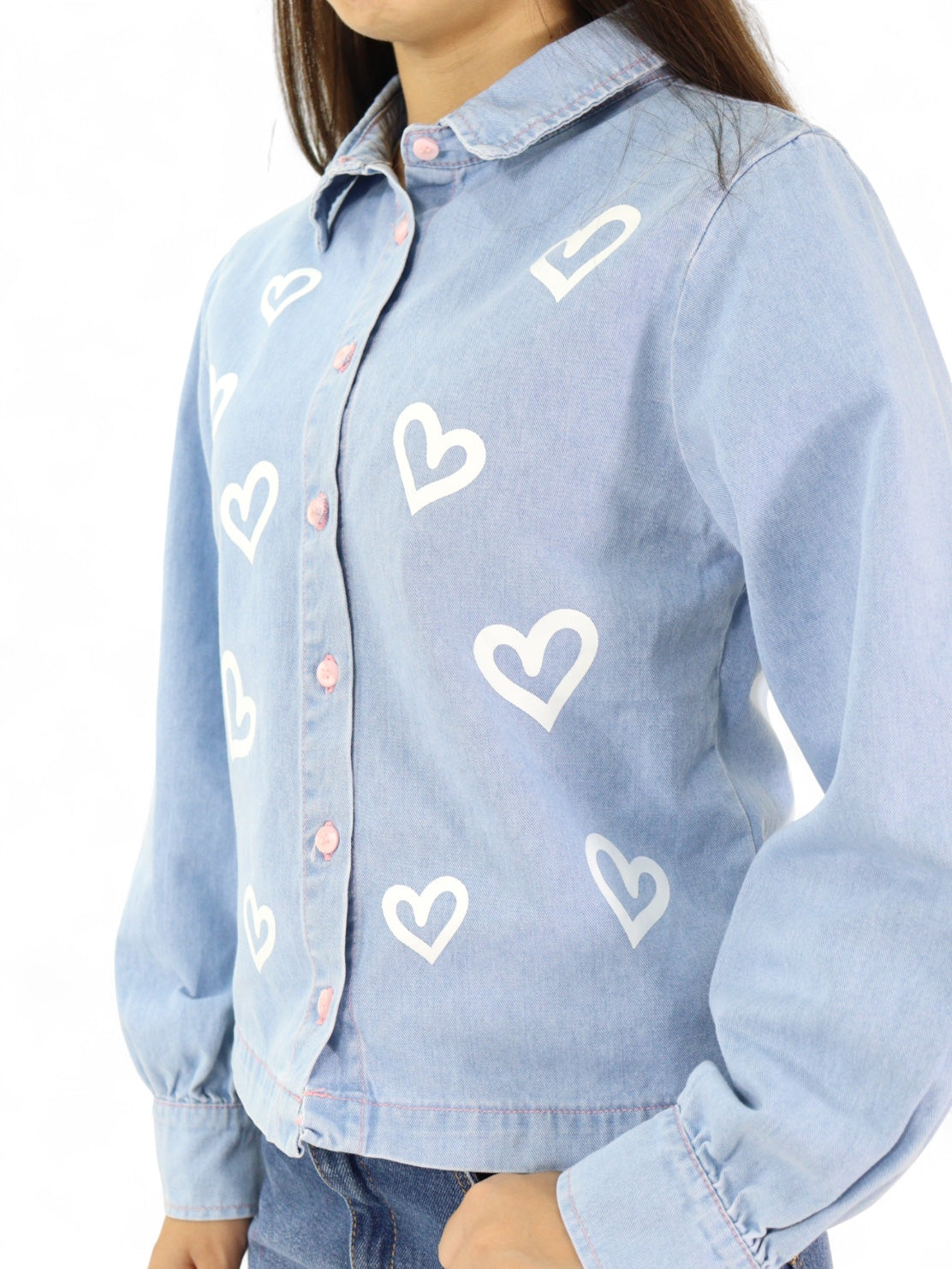 Camisa crop de mezclilla, lavado azul claro, print de corazones