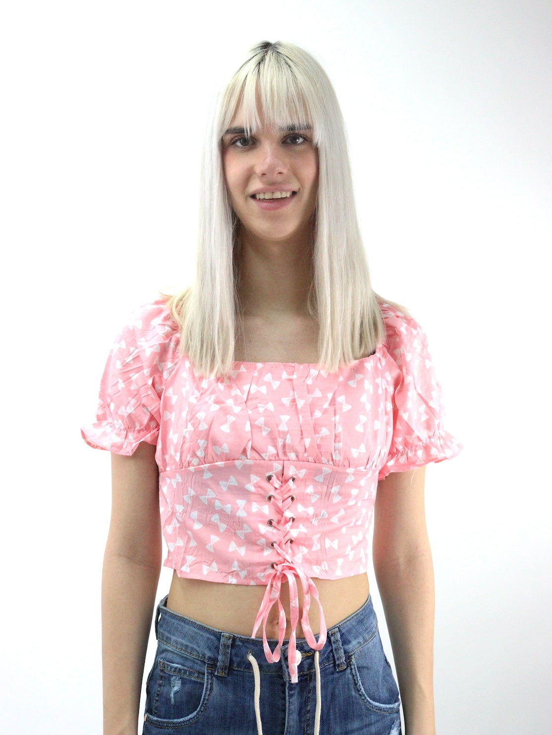 Camisa crop de hombros descubiertos con cordón y estampado de moños (VARIOS COLORES)