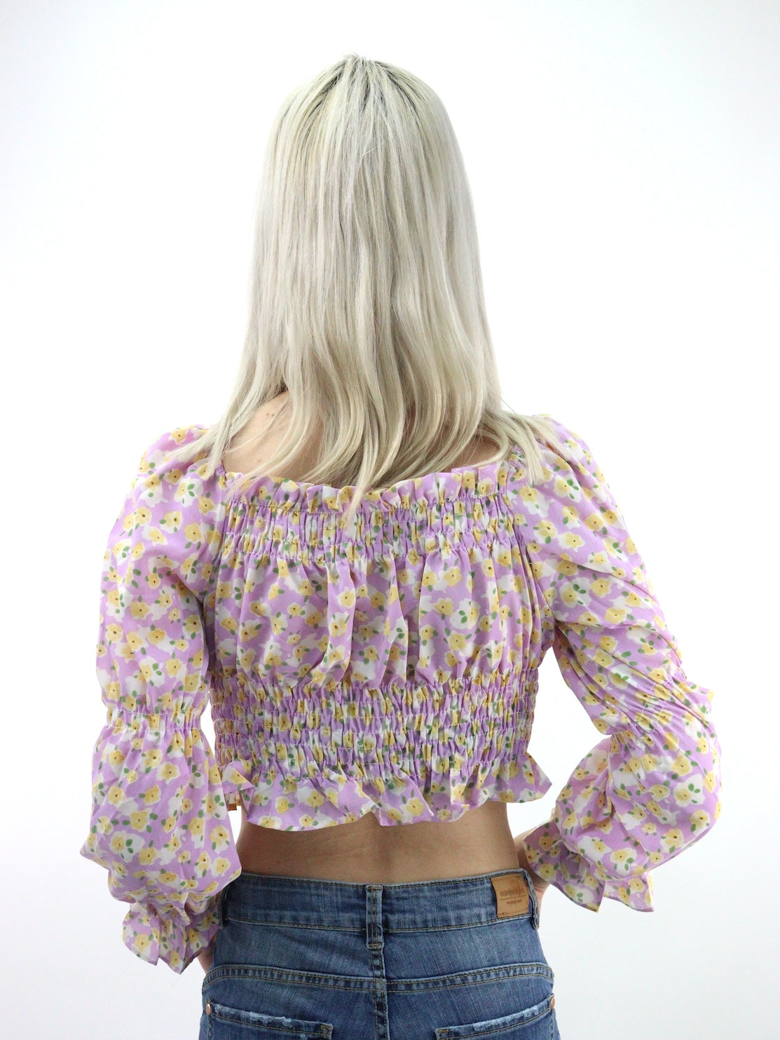 Camisa manga larga de hombros descubiertos con diseño de flores y fruncido