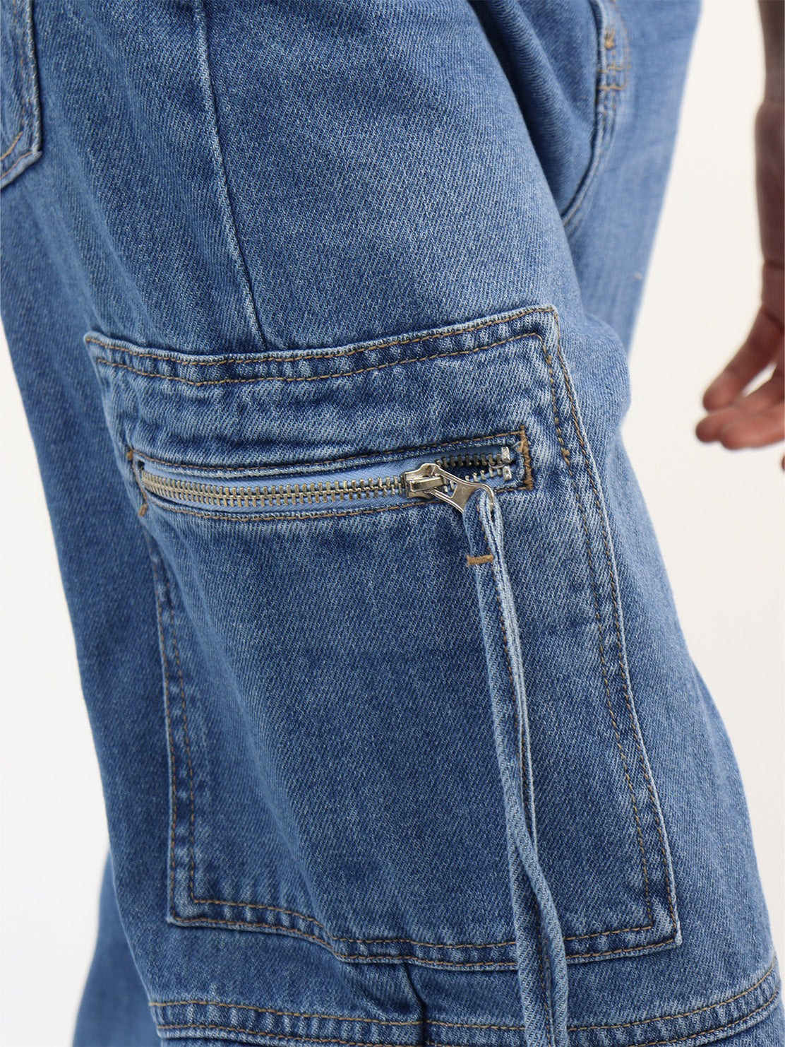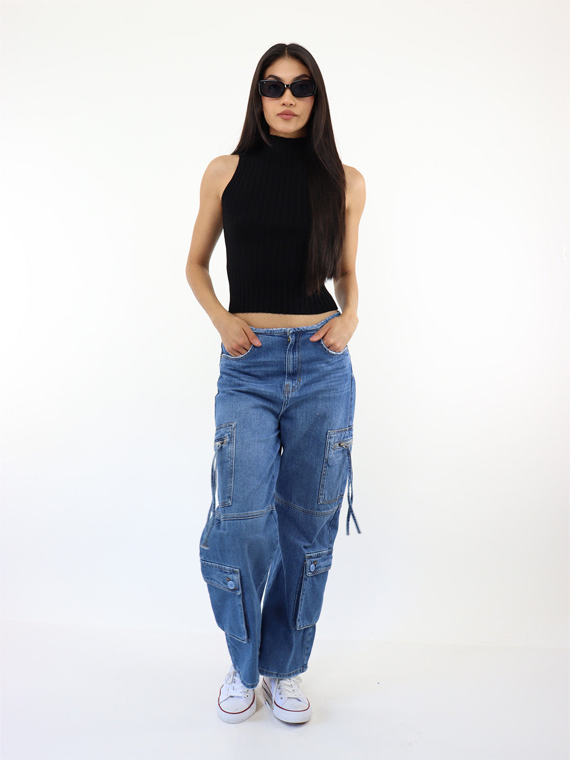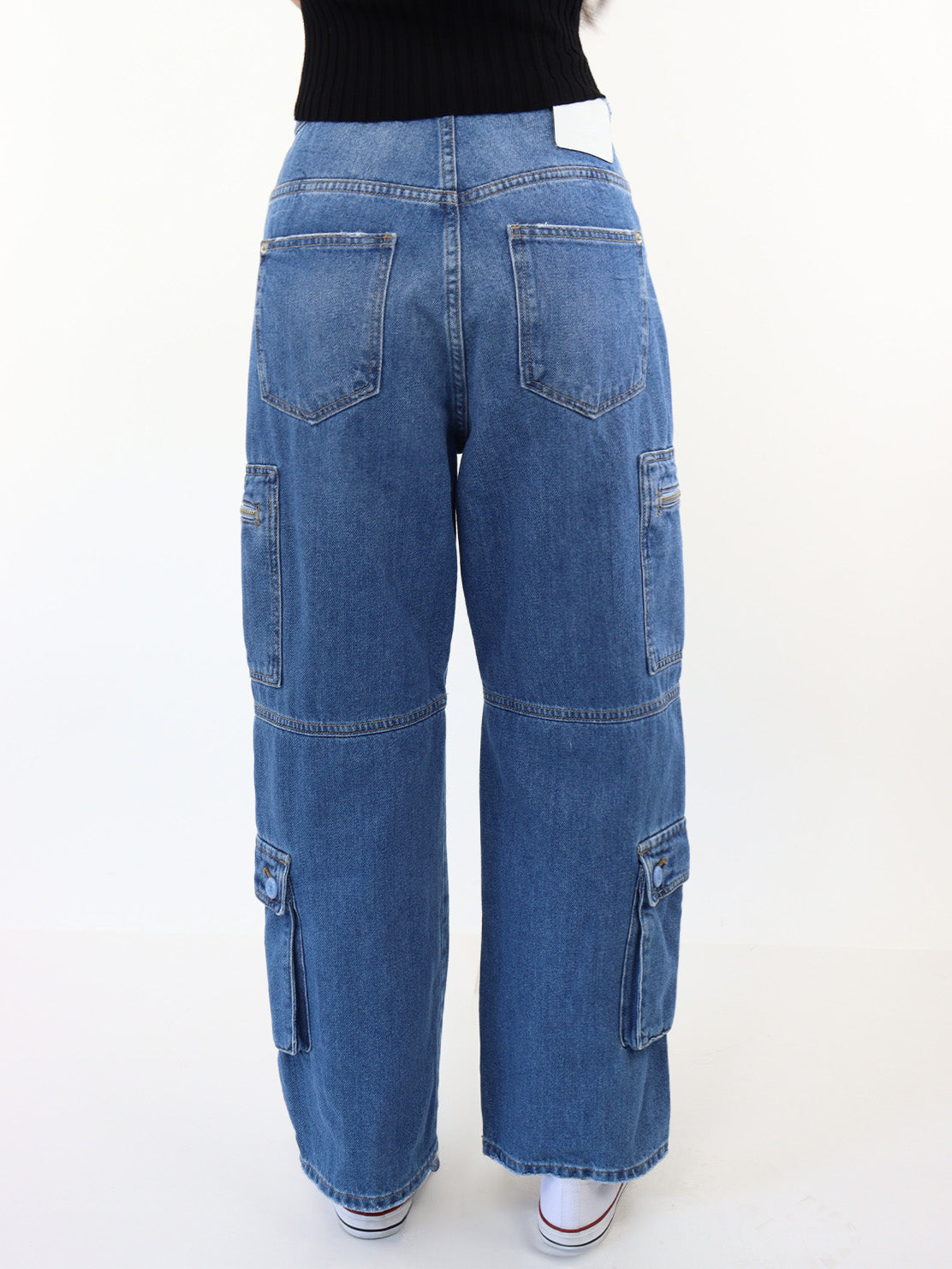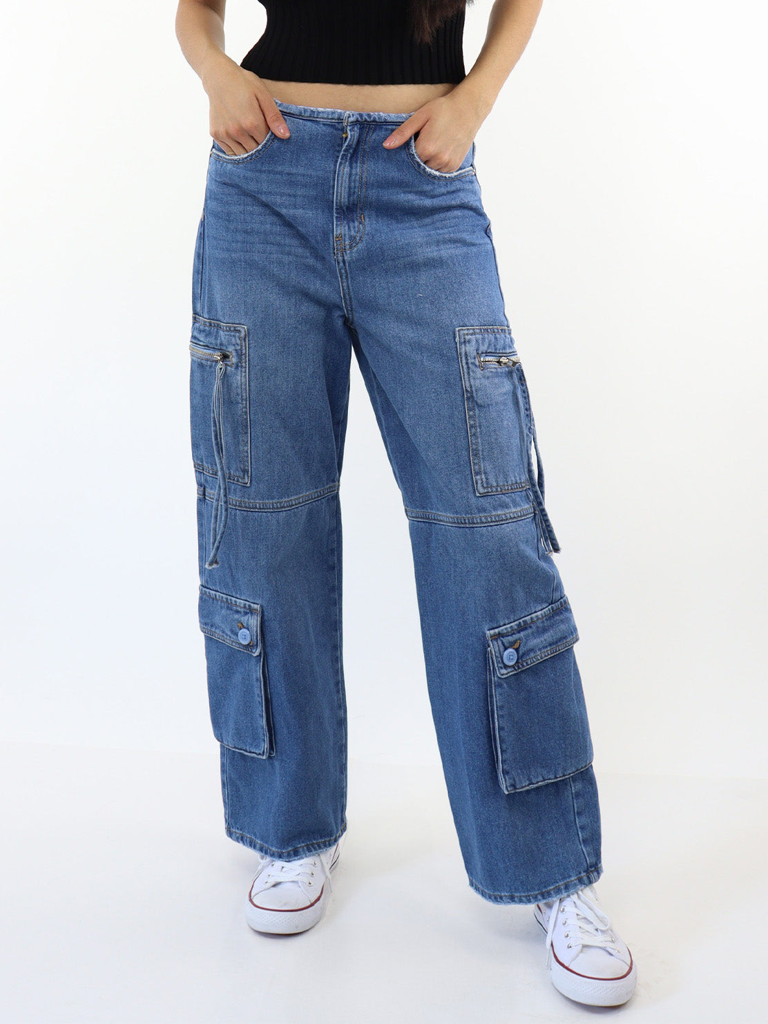 Jeans cargo de talle alto azul medio, con bolsillos en la parte delantera y trasera, cierre de botón y cremallera, bolsillos de sobre en la pernera con tapa y pierna recta.