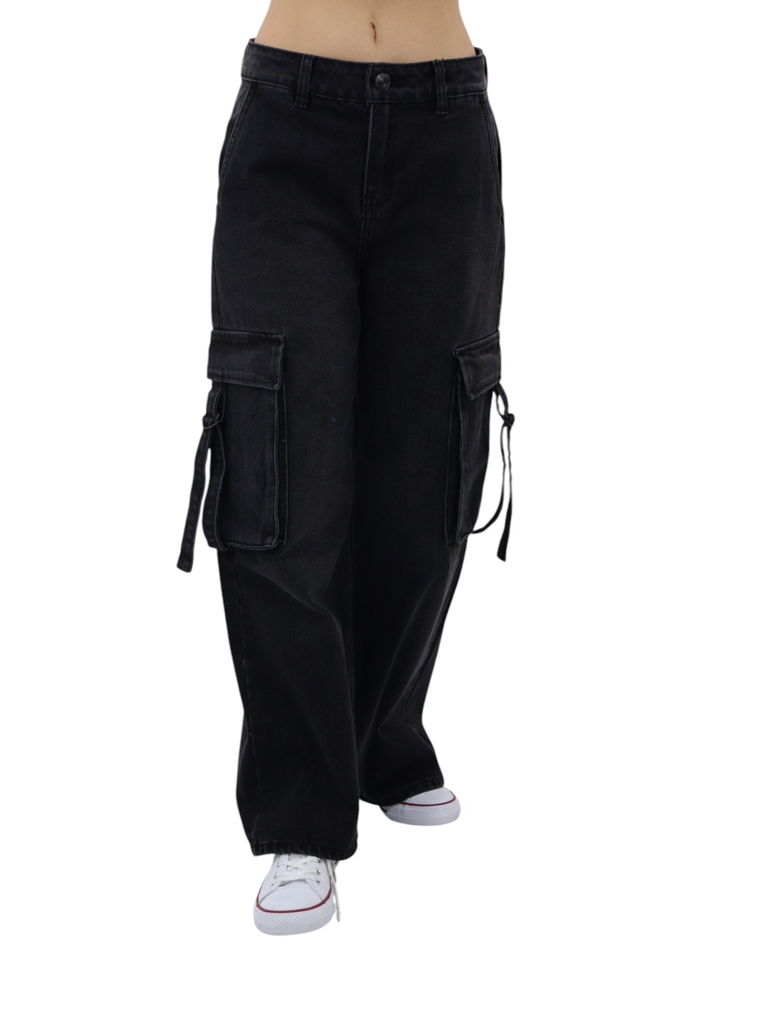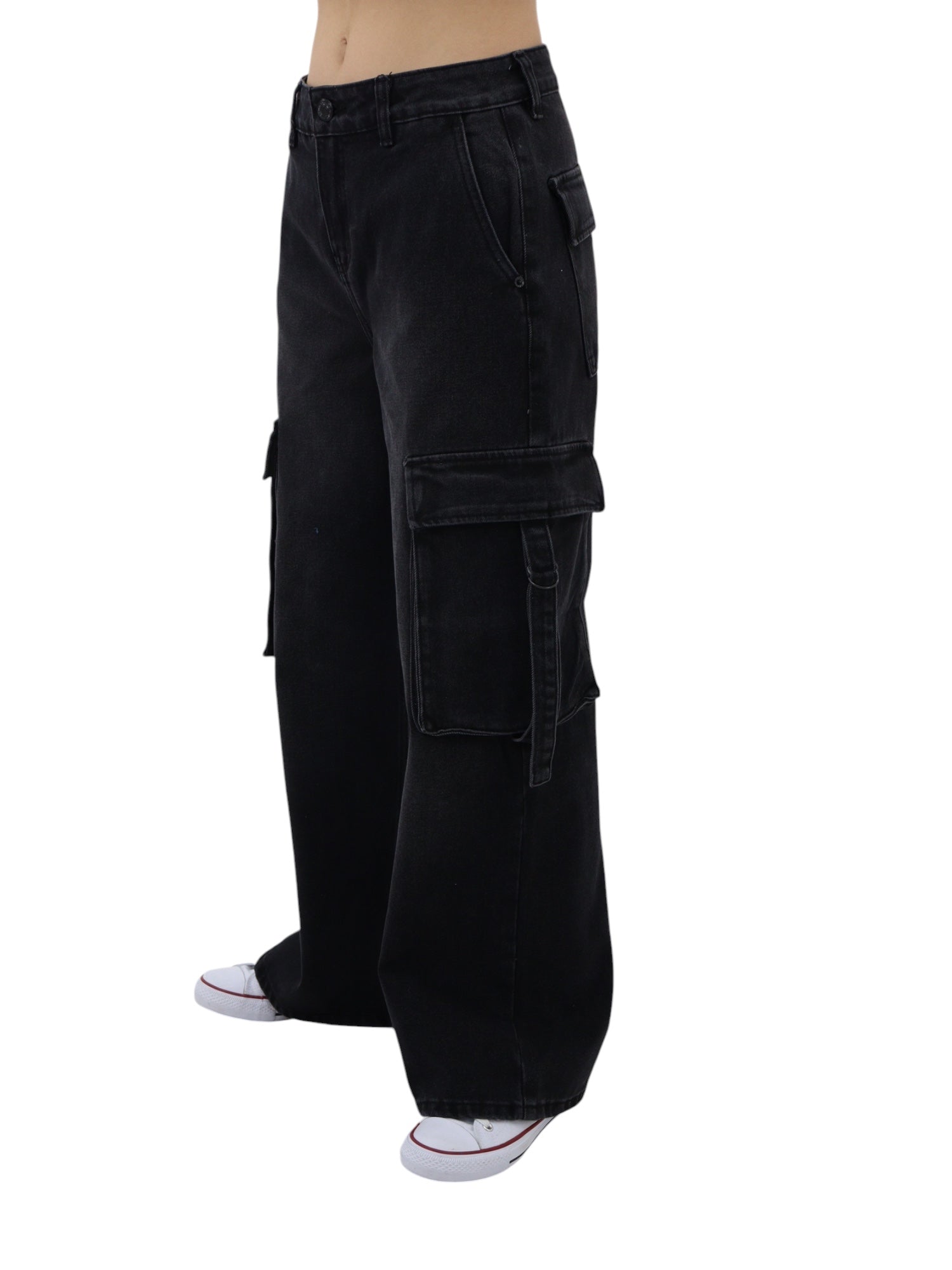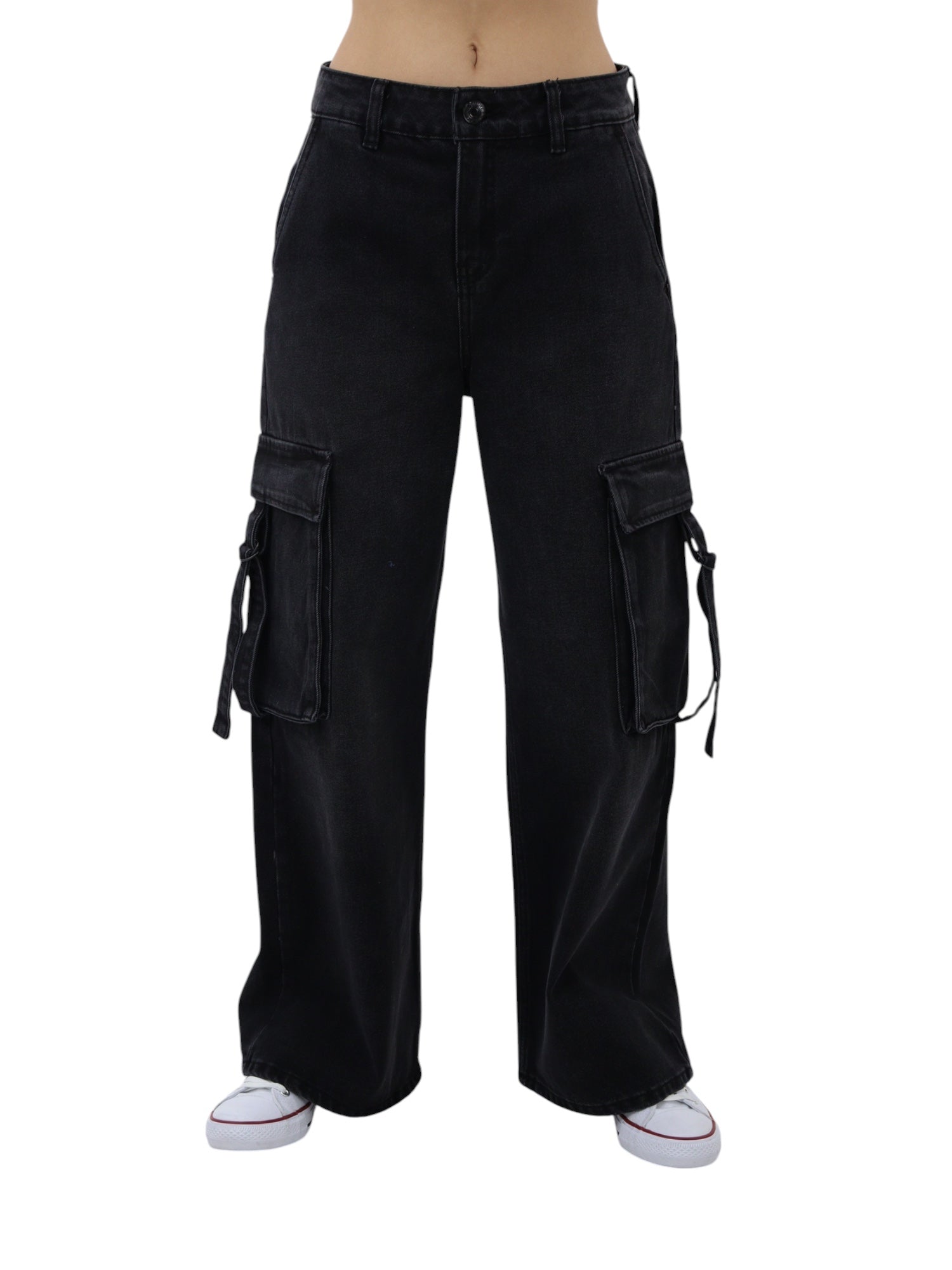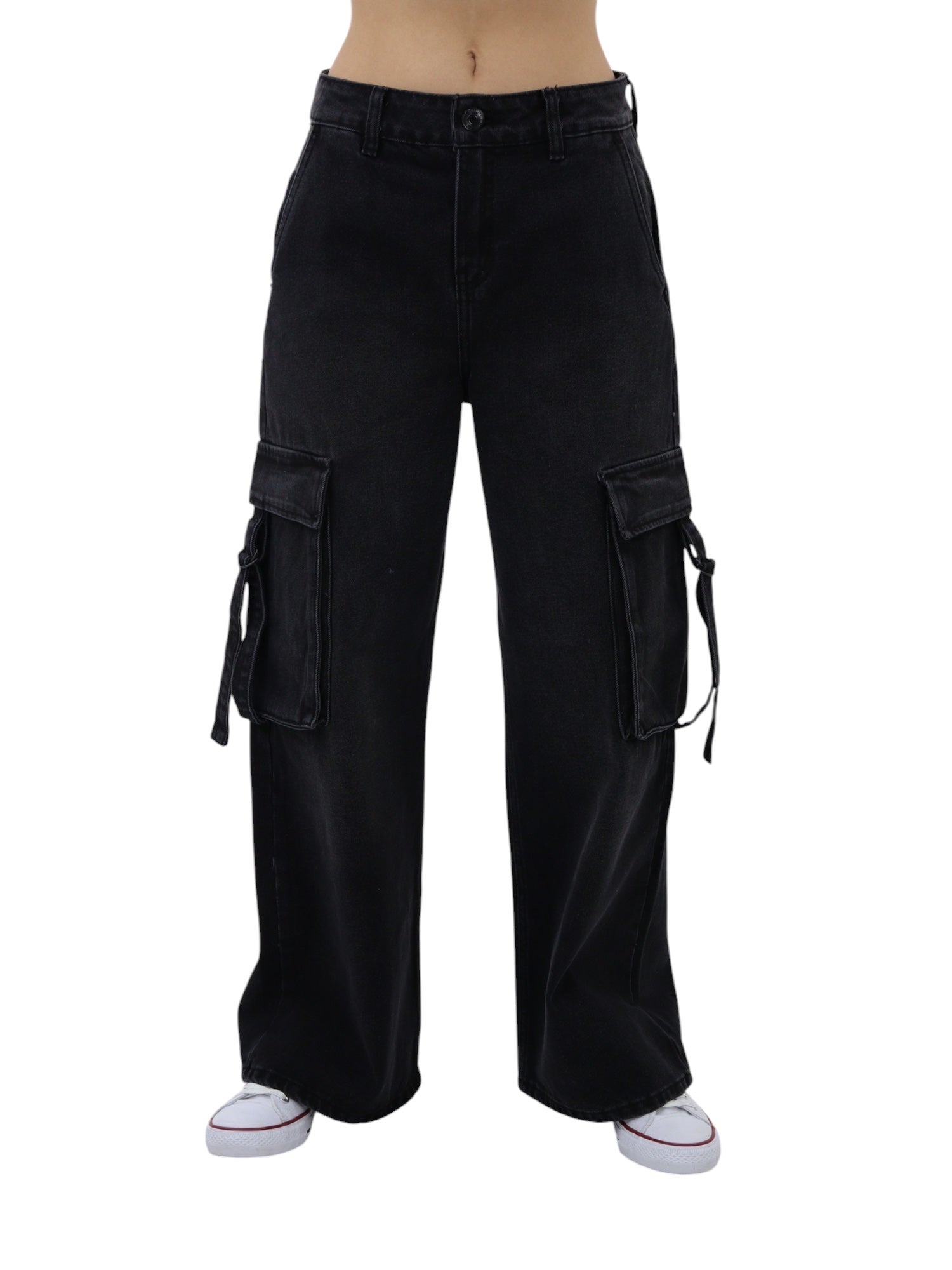 Jeans cargo de talle medio, con bolsillos de tapeta en la pernera, con cintura con trabillas, cierre de botón y zipper y confeccionados en algodón