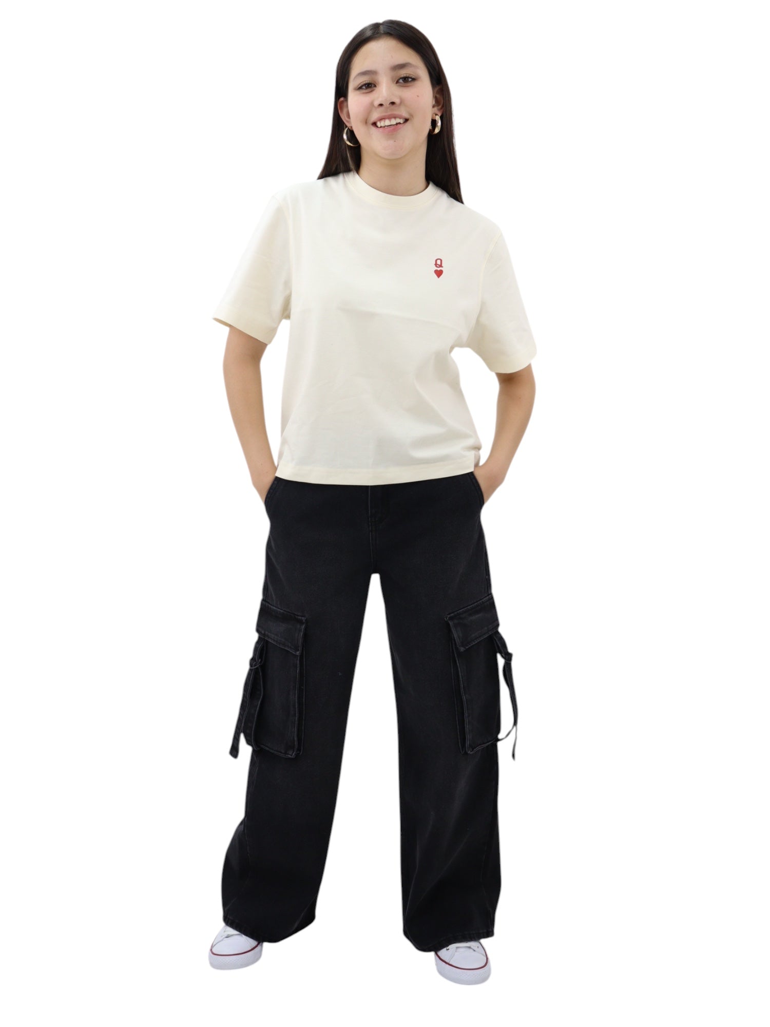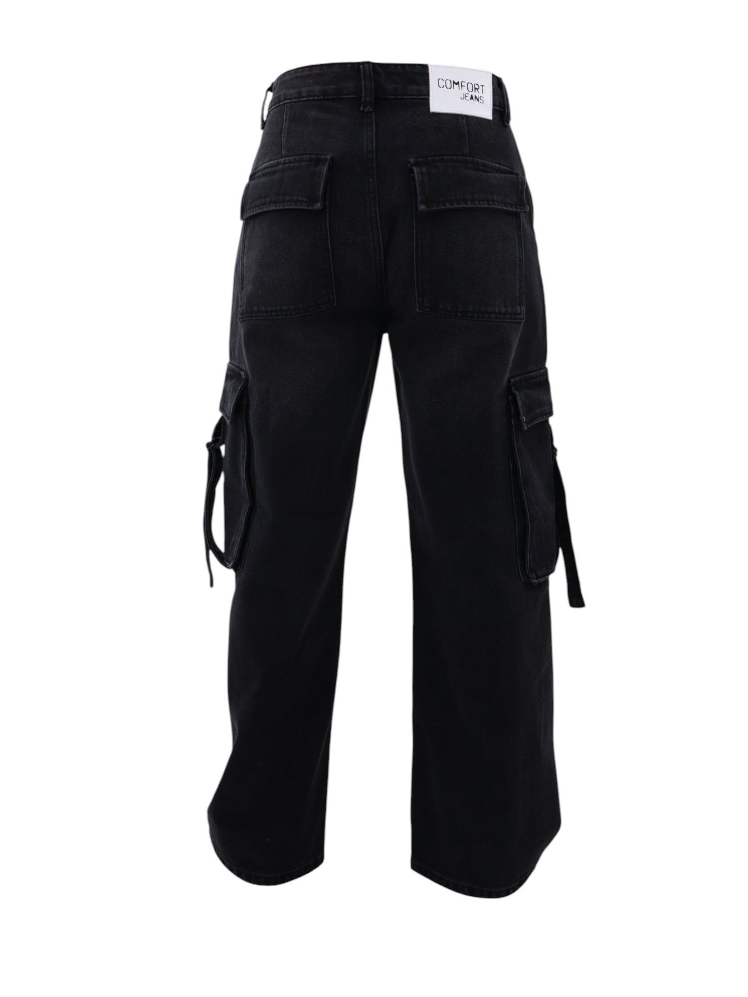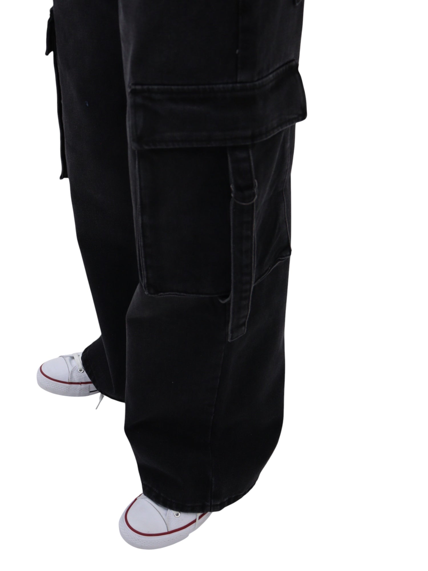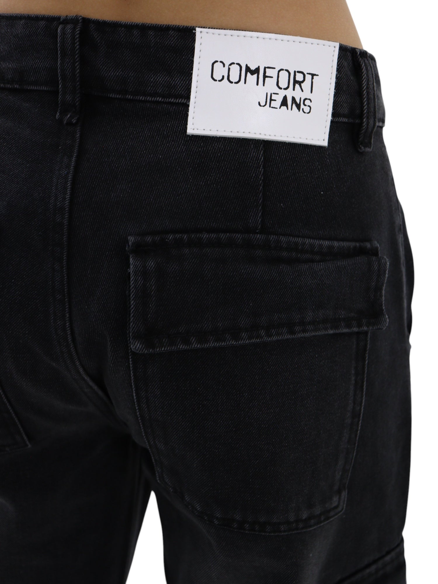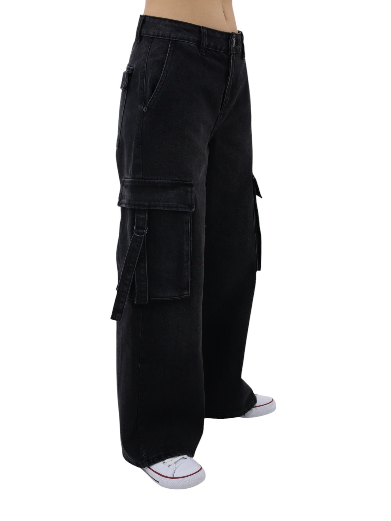 Jeans cargo de talle medio, con bolsillos de tapeta en la pernera, con cintura con trabillas, cierre de botón y zipper y confeccionados en algodón