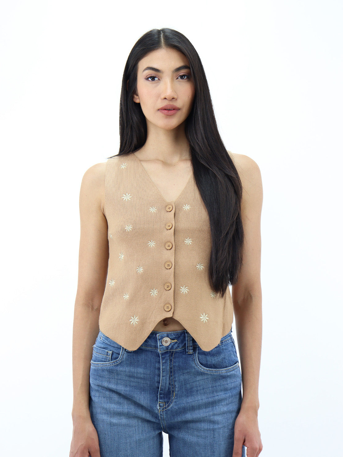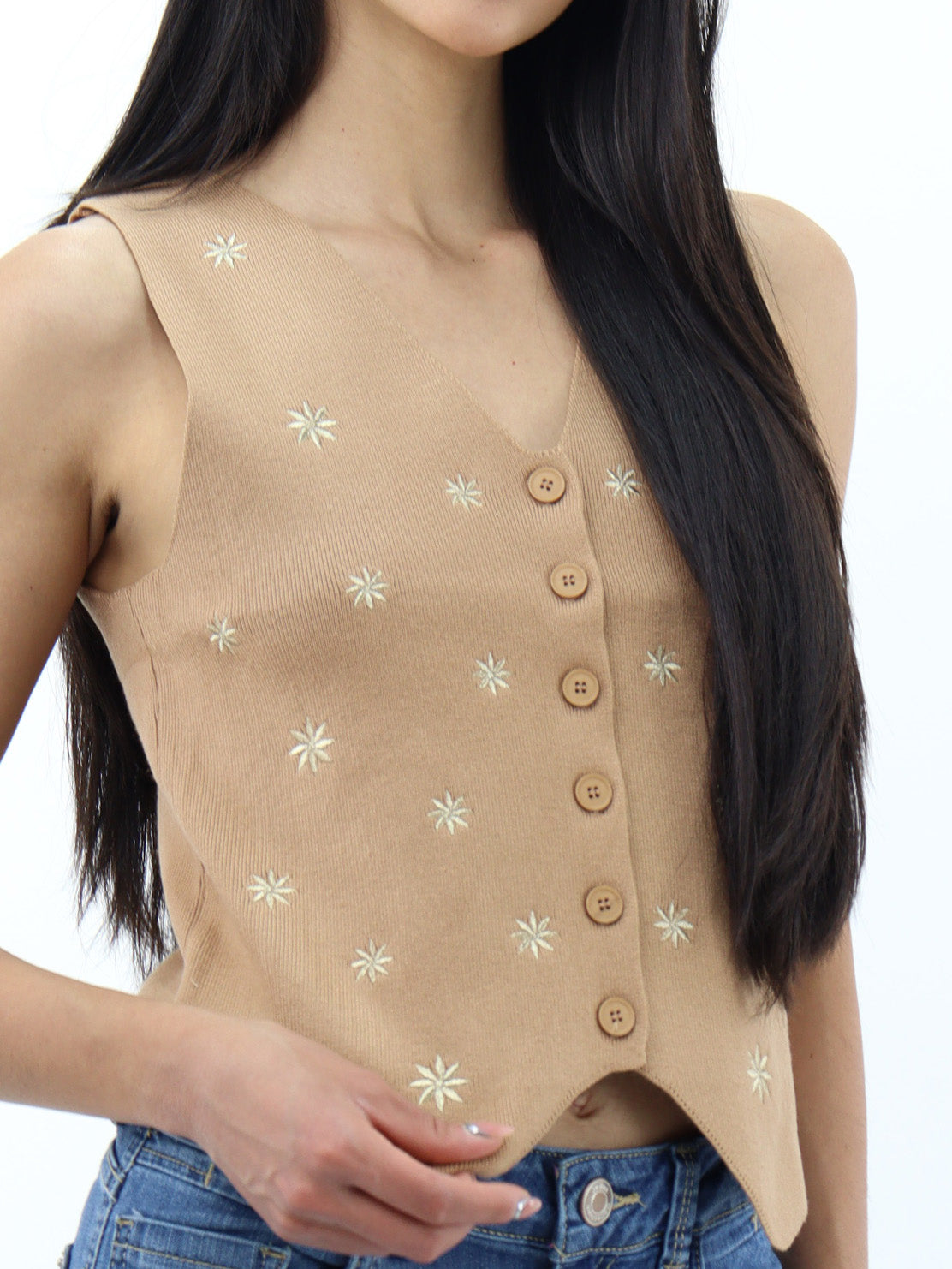 Chaleco de color khaki en cuello V con detalle de flores