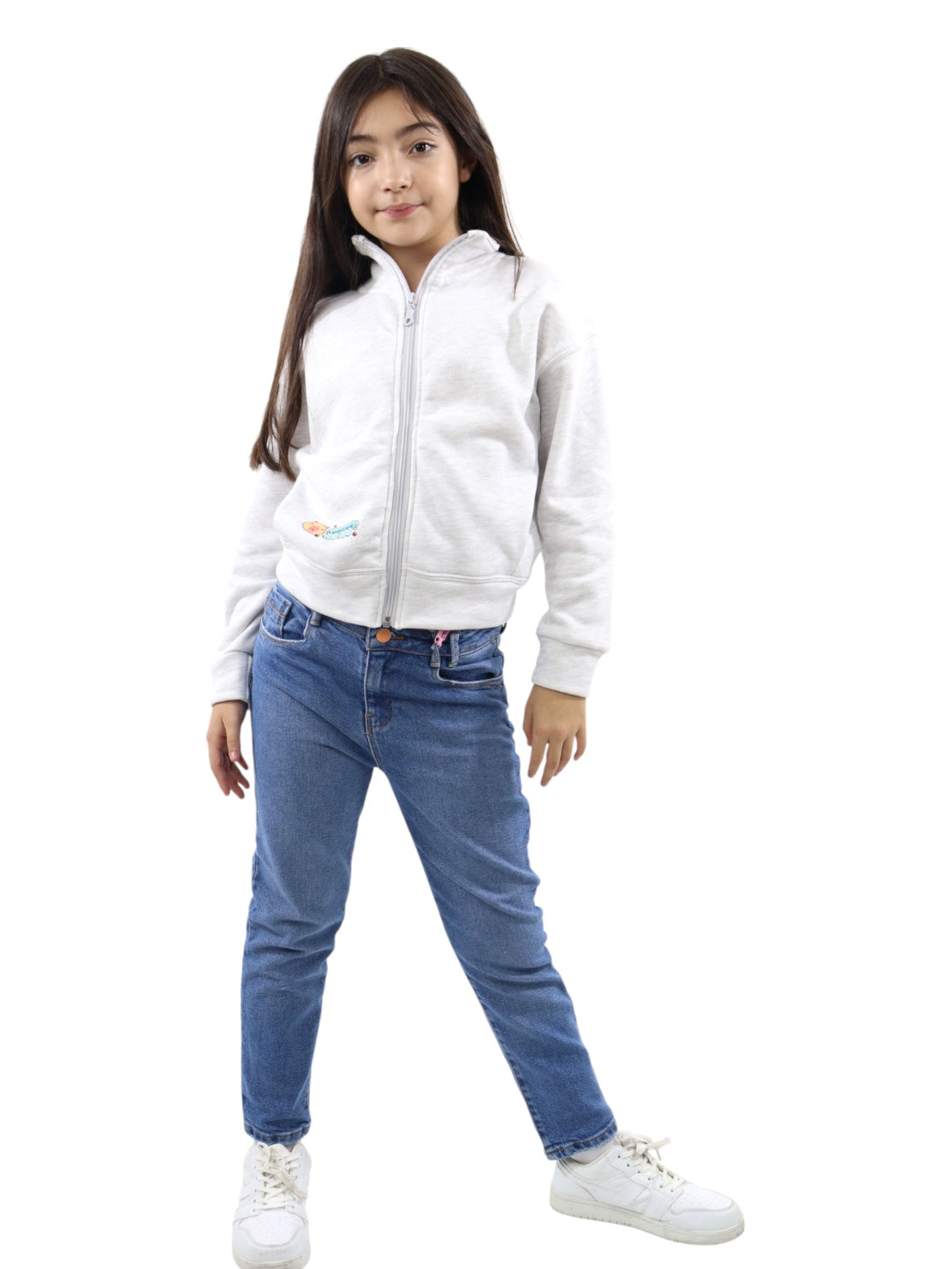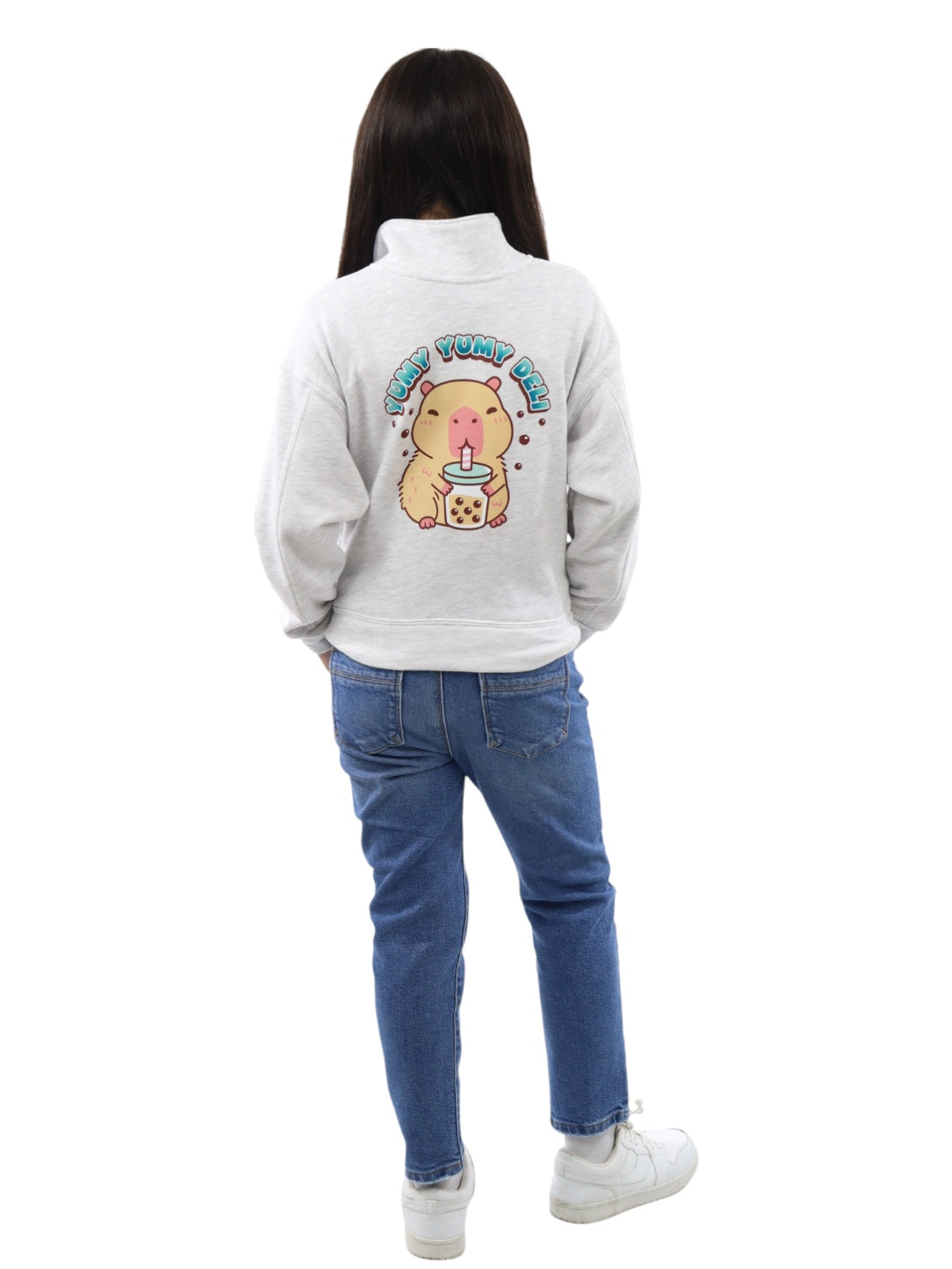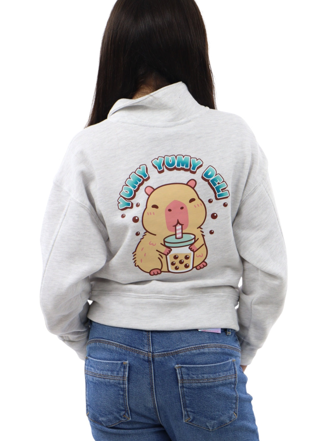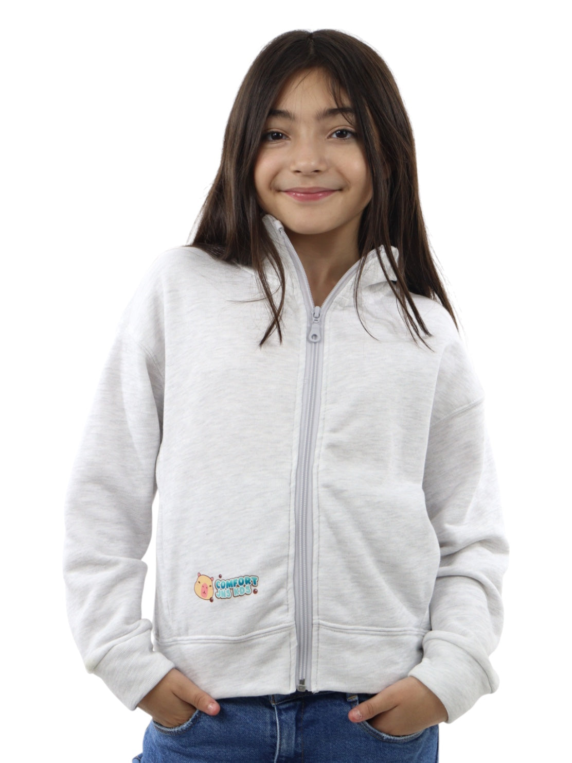Chamarra con cremallera de color gris jaspe, con estampado de capibara