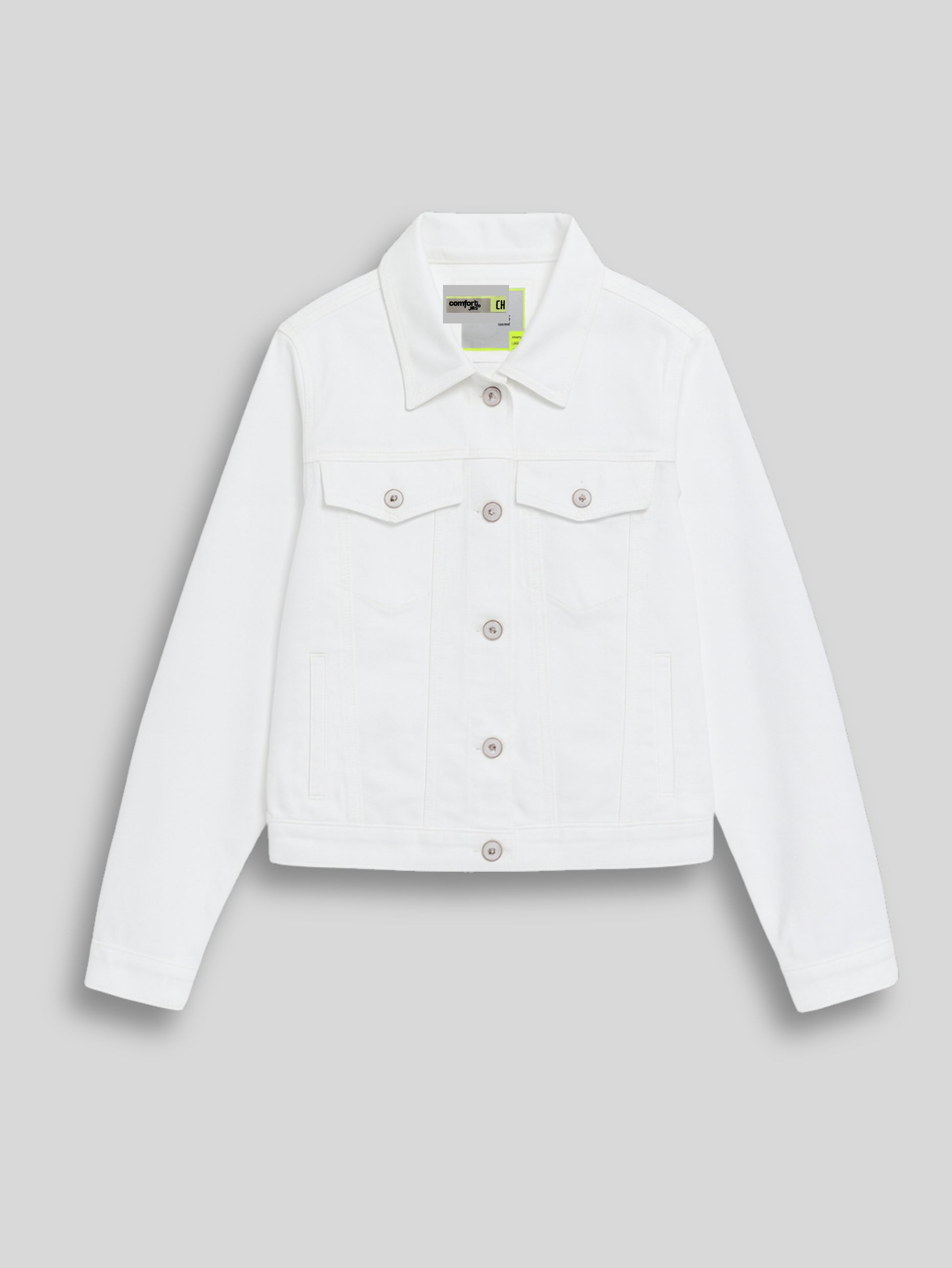 Chamarra de mezclilla en color blanco con cierre de botón