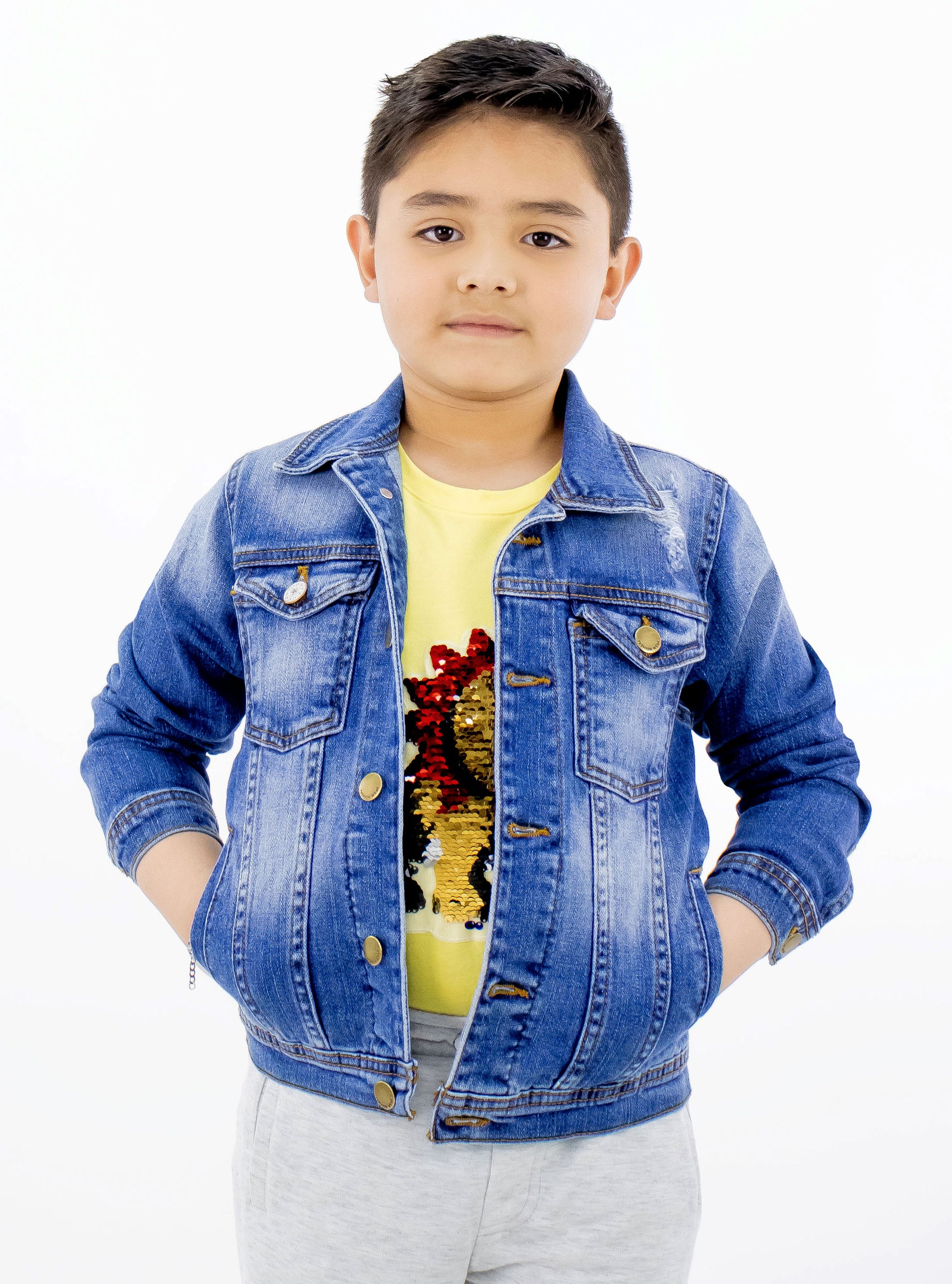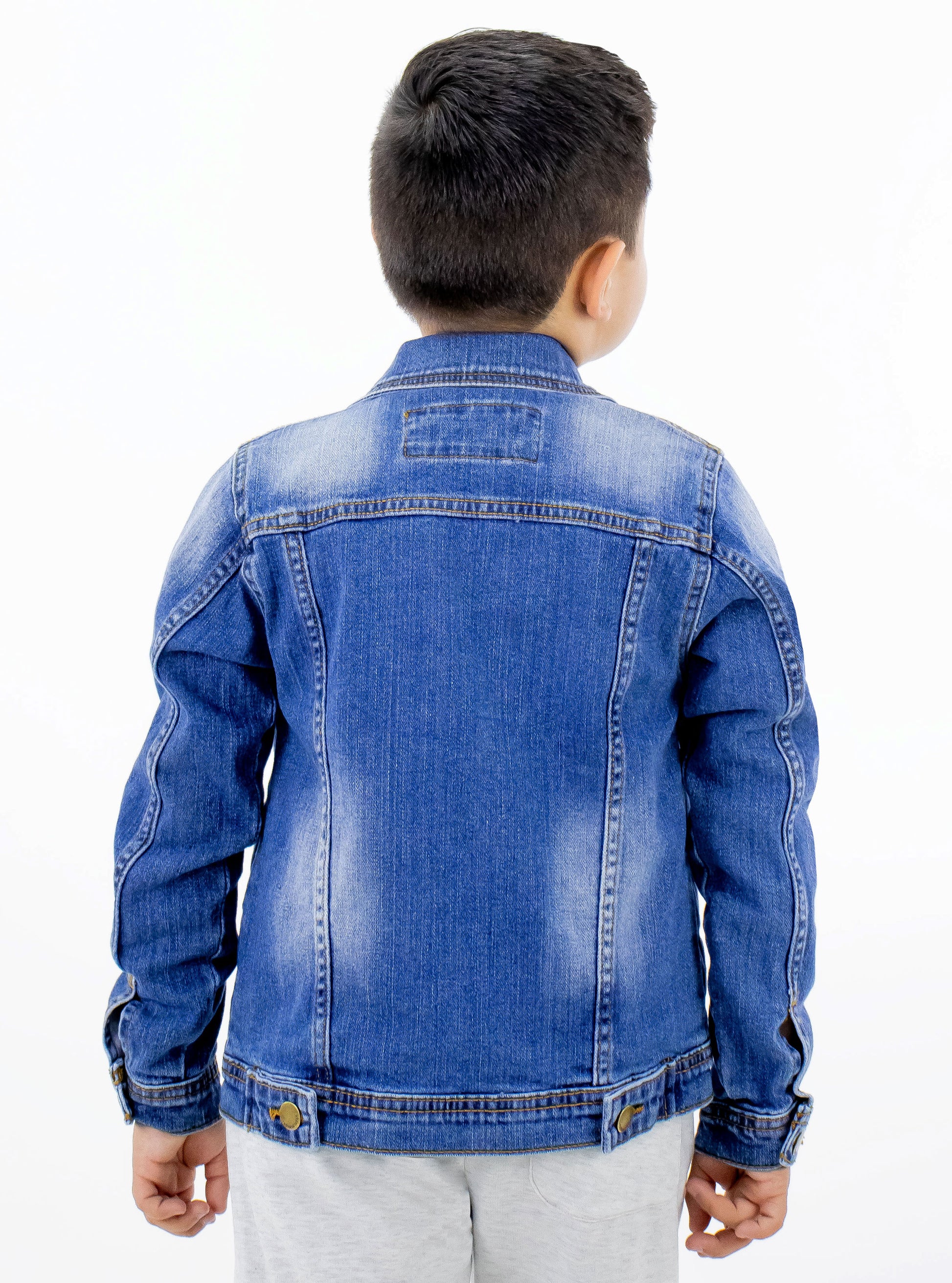 Chamarra de mezclilla stretch de color azul medio con destrucción.