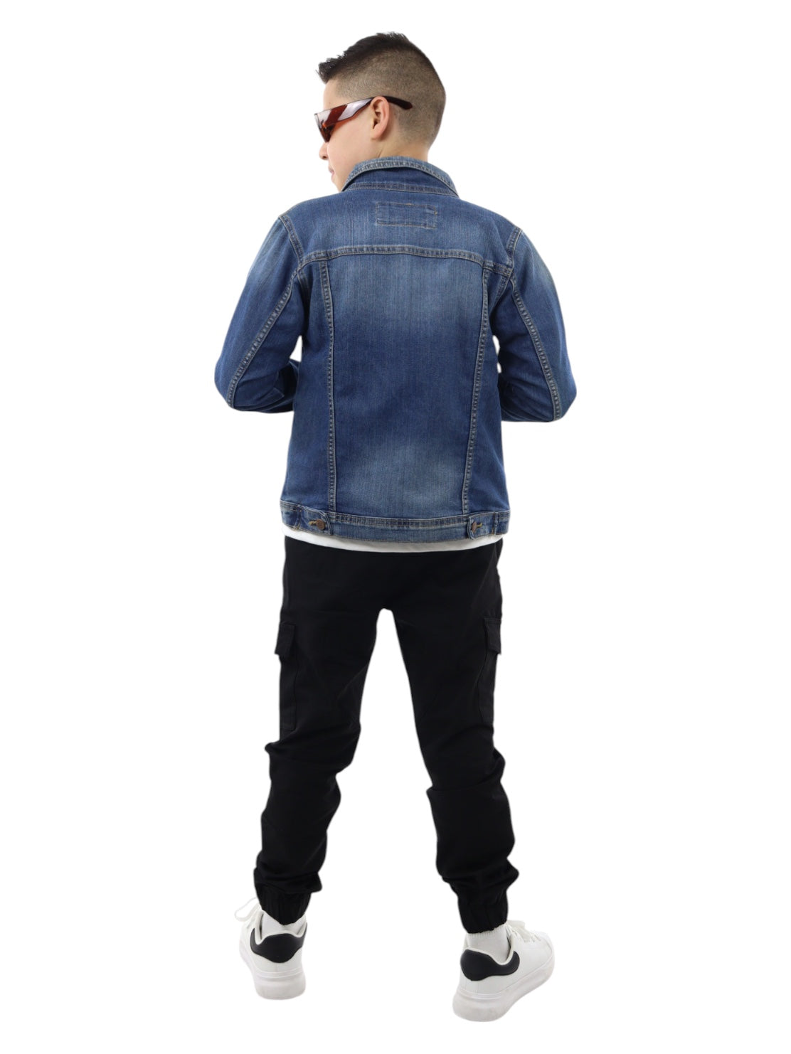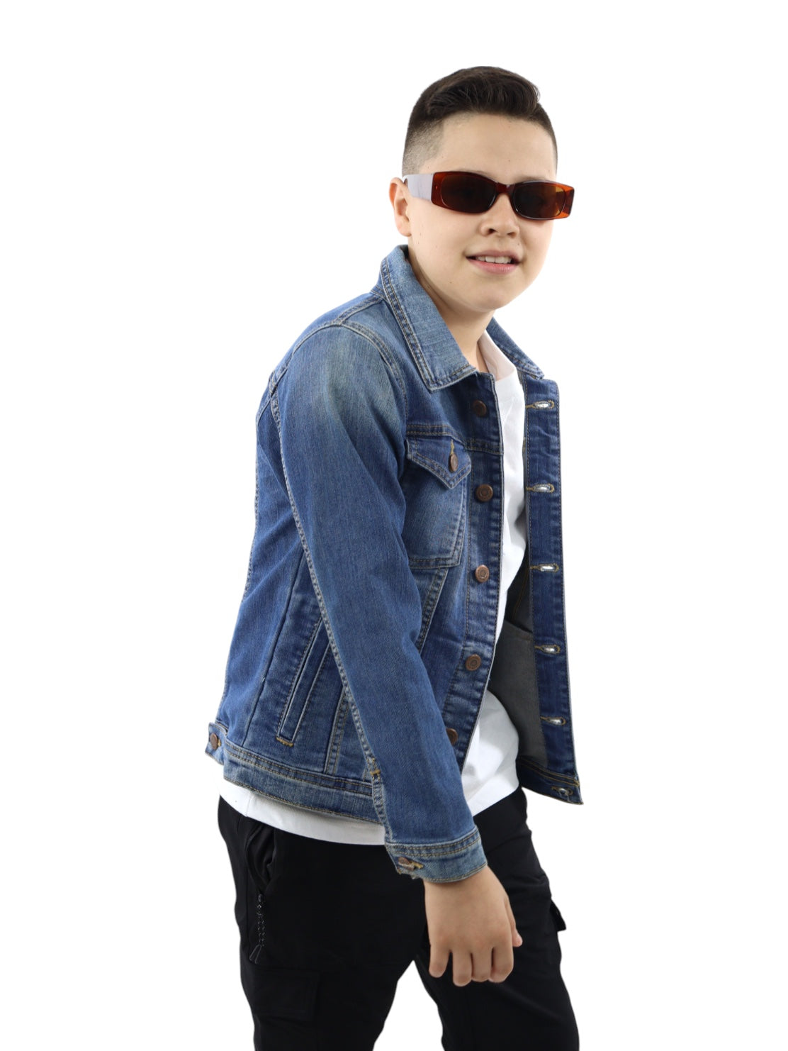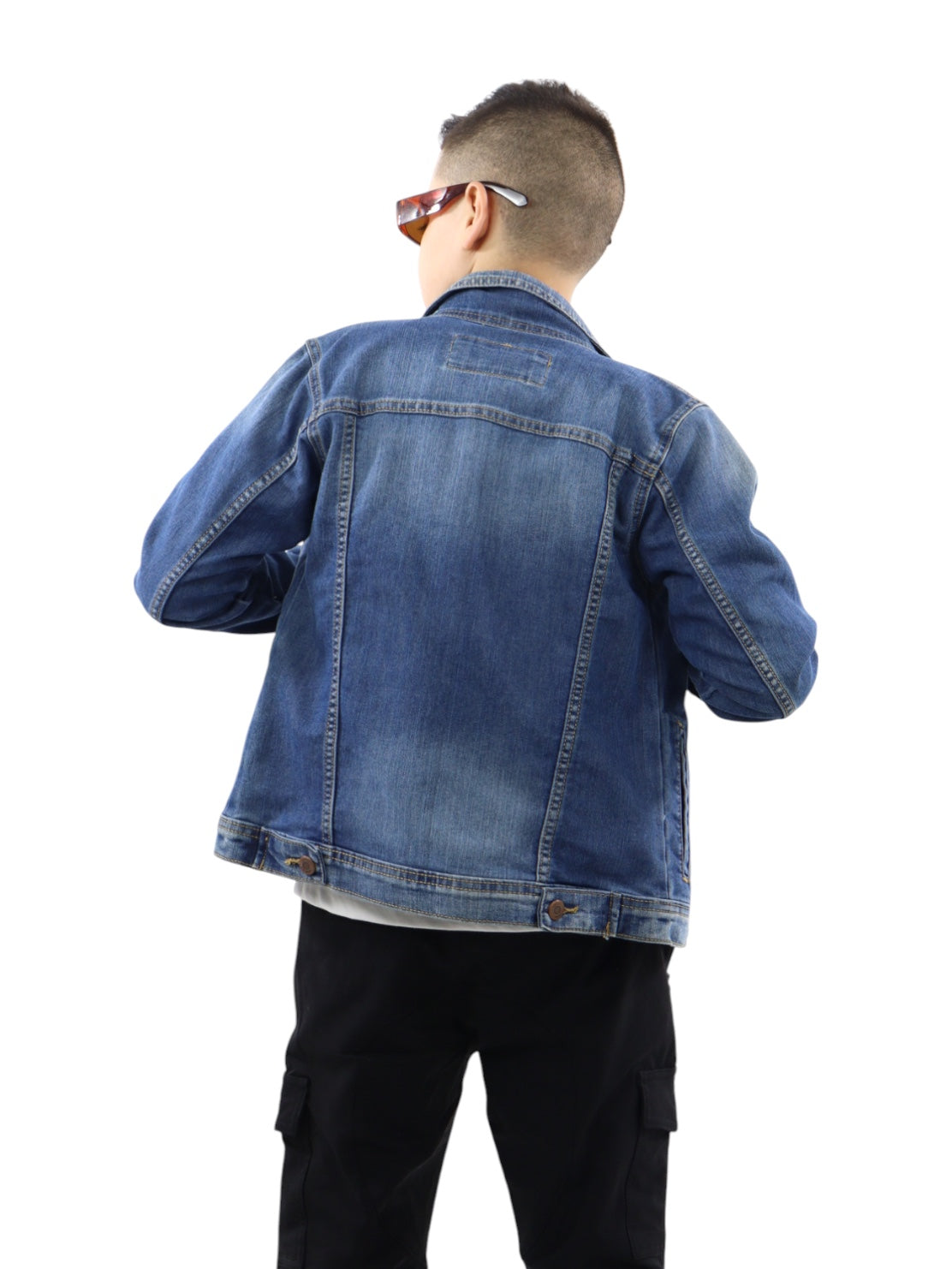 Chamarra vaquera básica. Lavado medio-oscuro, ligeramente ensuciado, de aspecto usado tipo vintage. Cierre con botones.