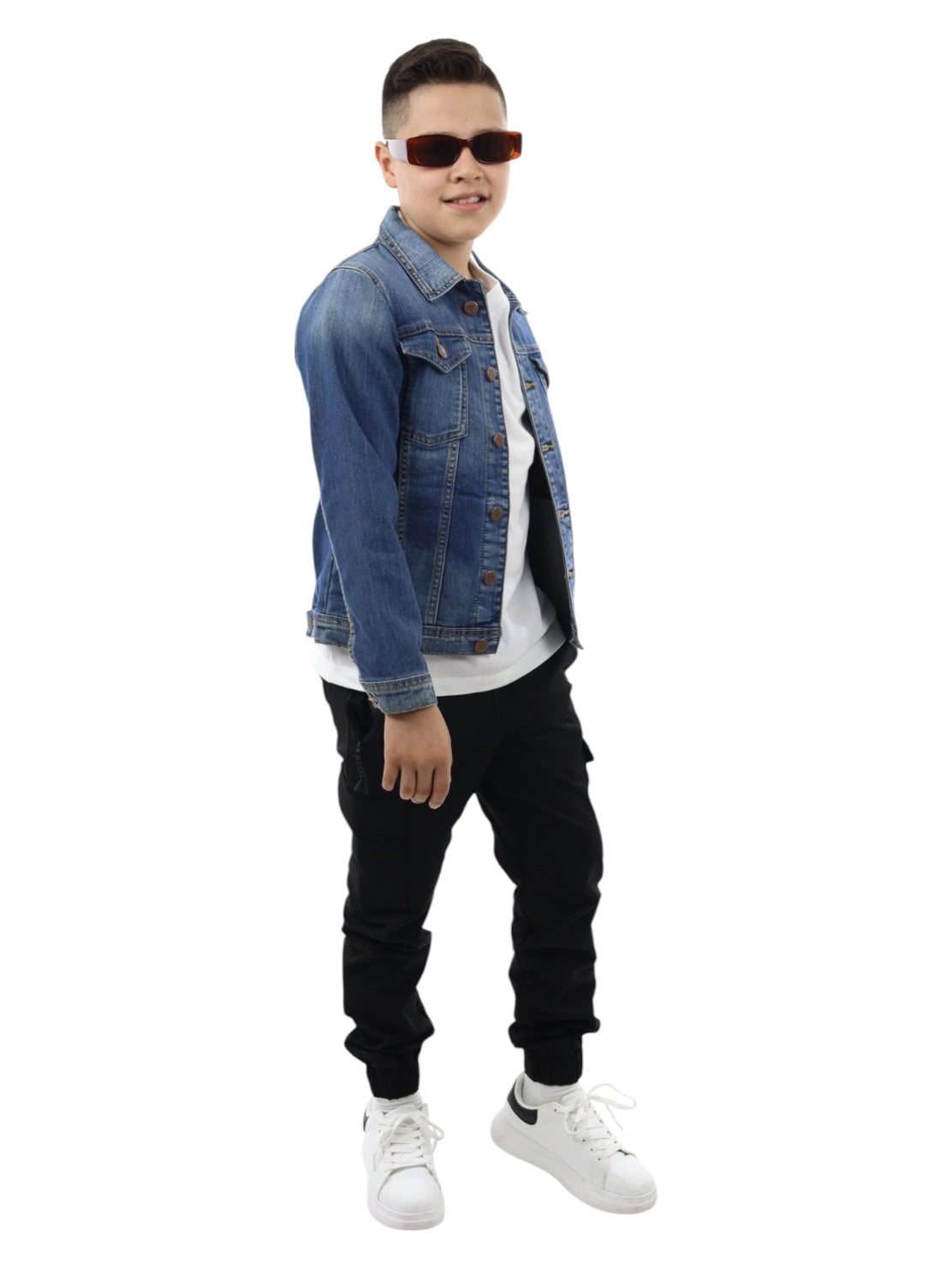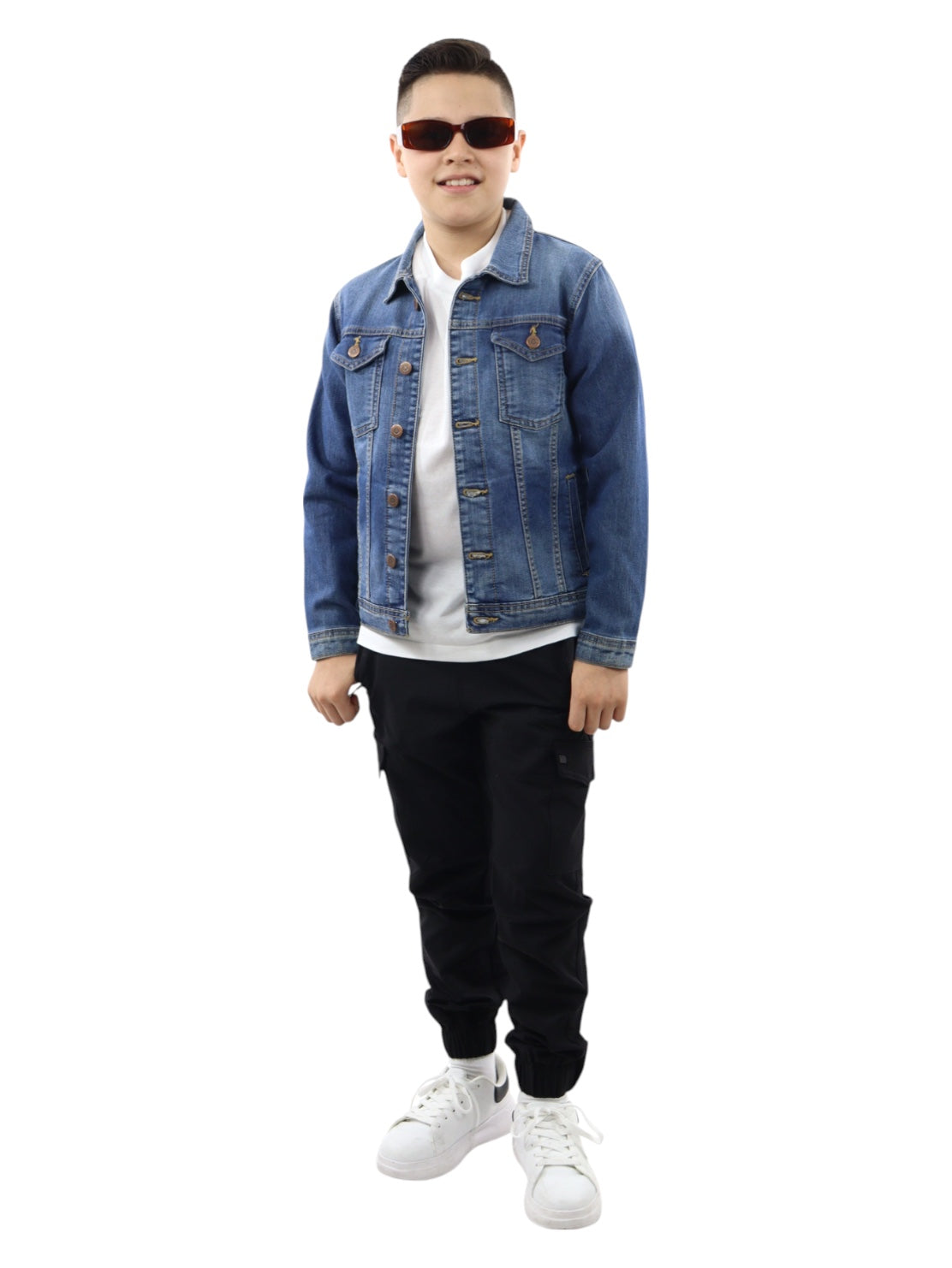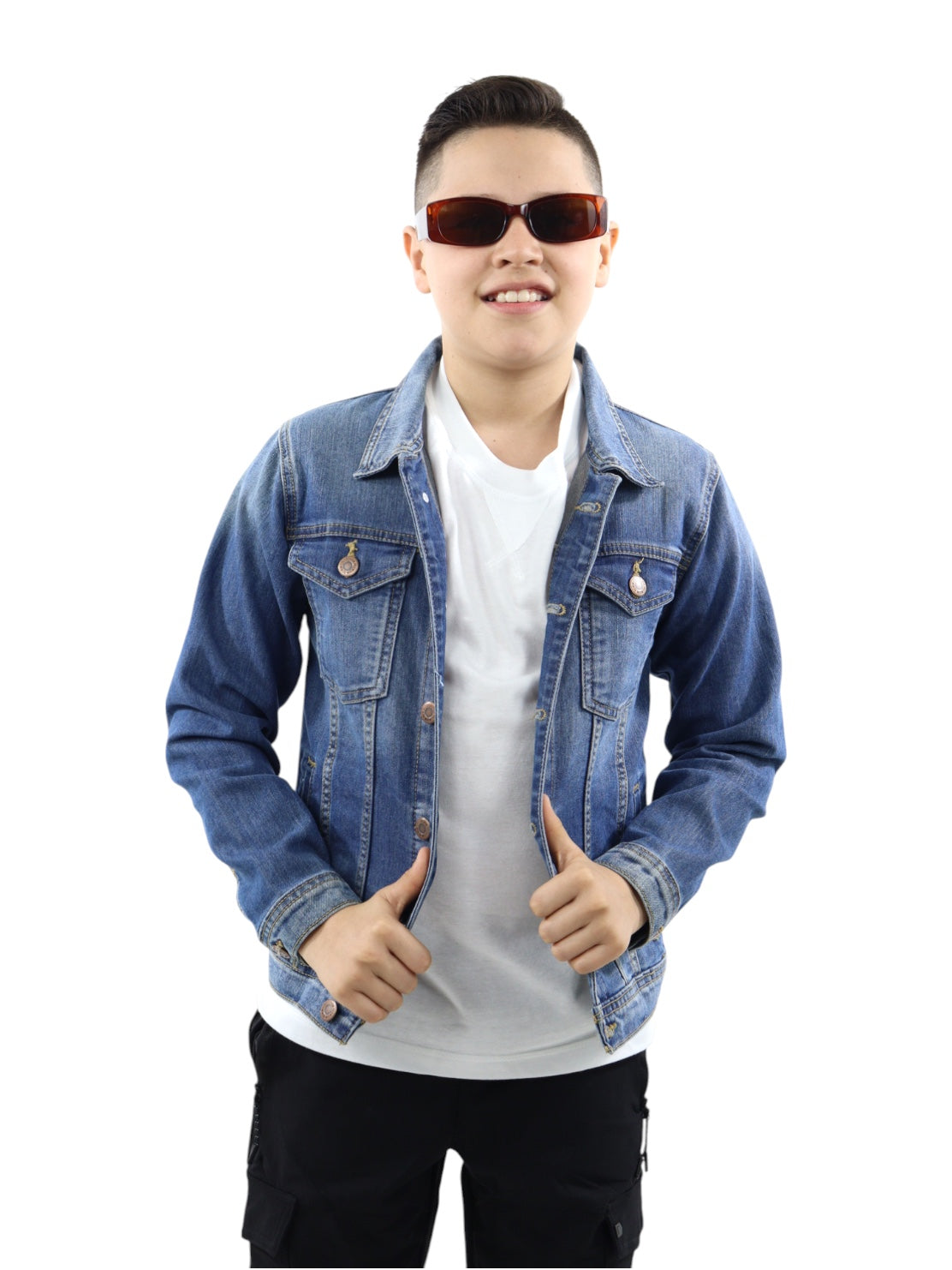 Chamarra vaquera básica. Lavado medio-oscuro, ligeramente ensuciado, de aspecto usado tipo vintage. Cierre con botones.