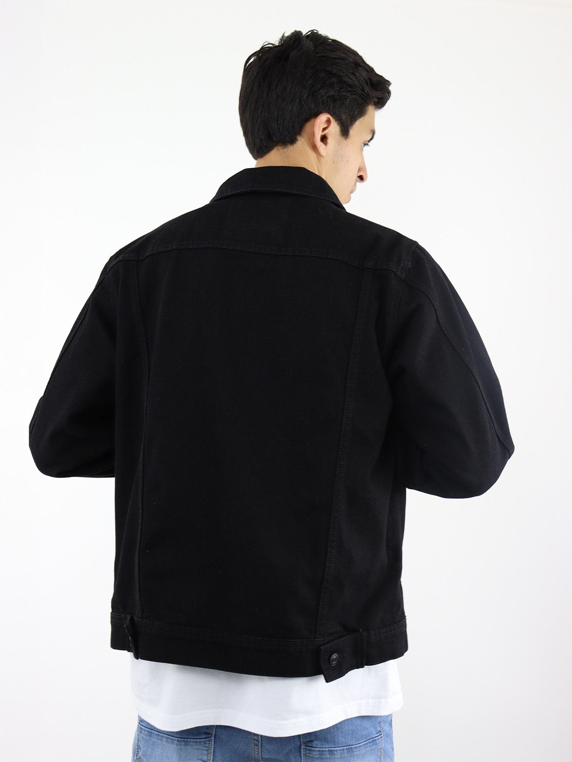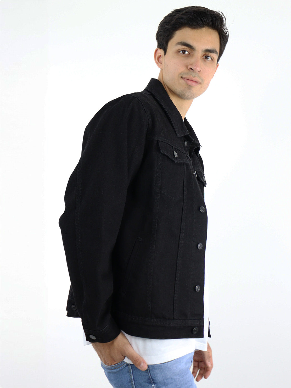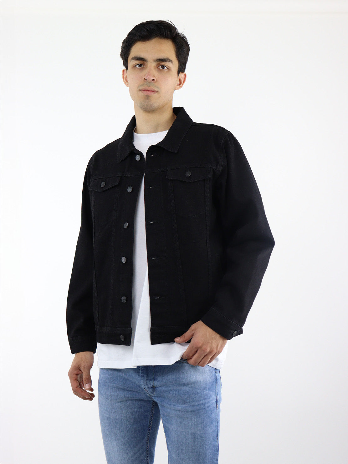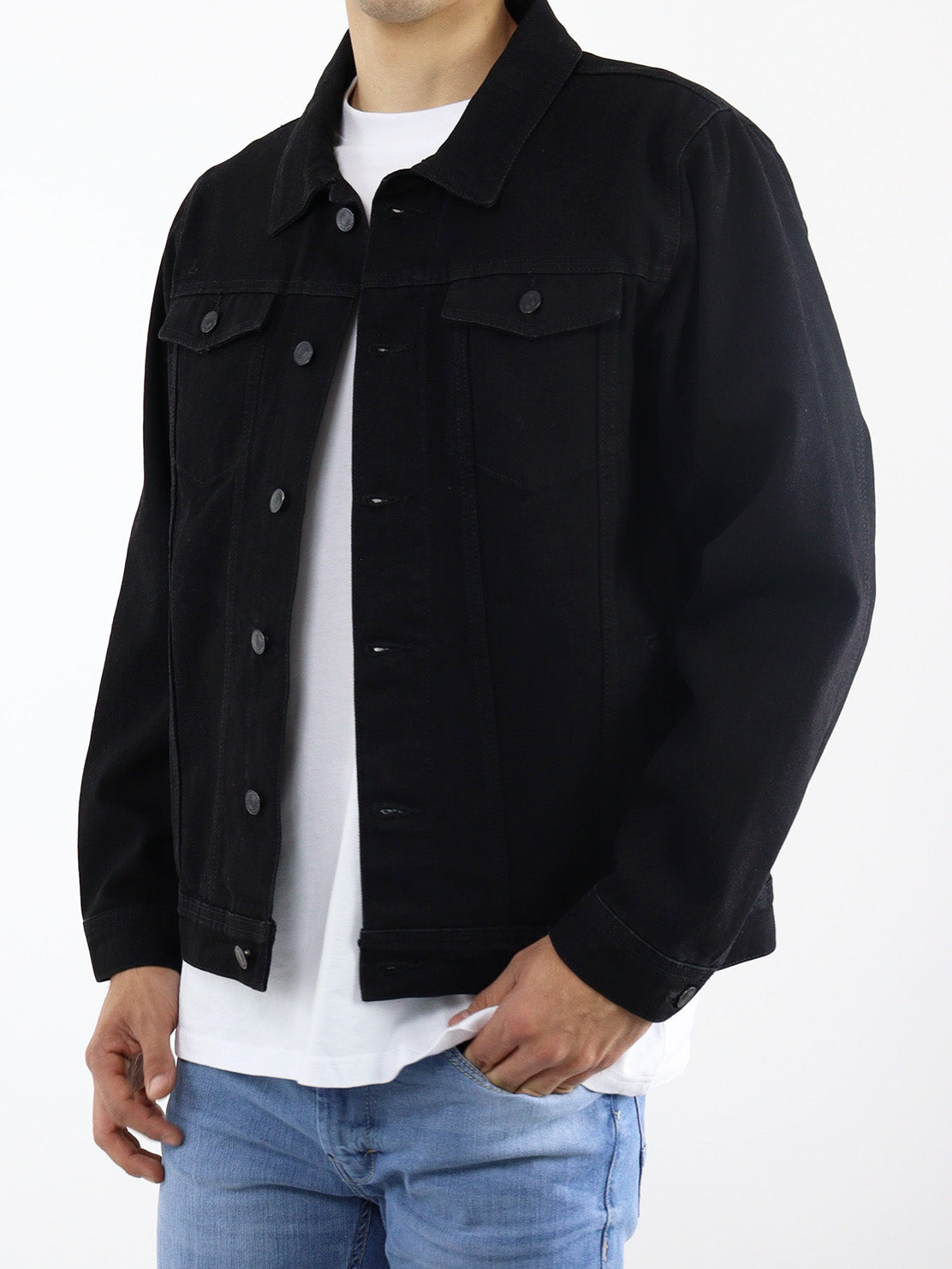 Chamarra vaquera básica en tono negro. Cierre con botones.