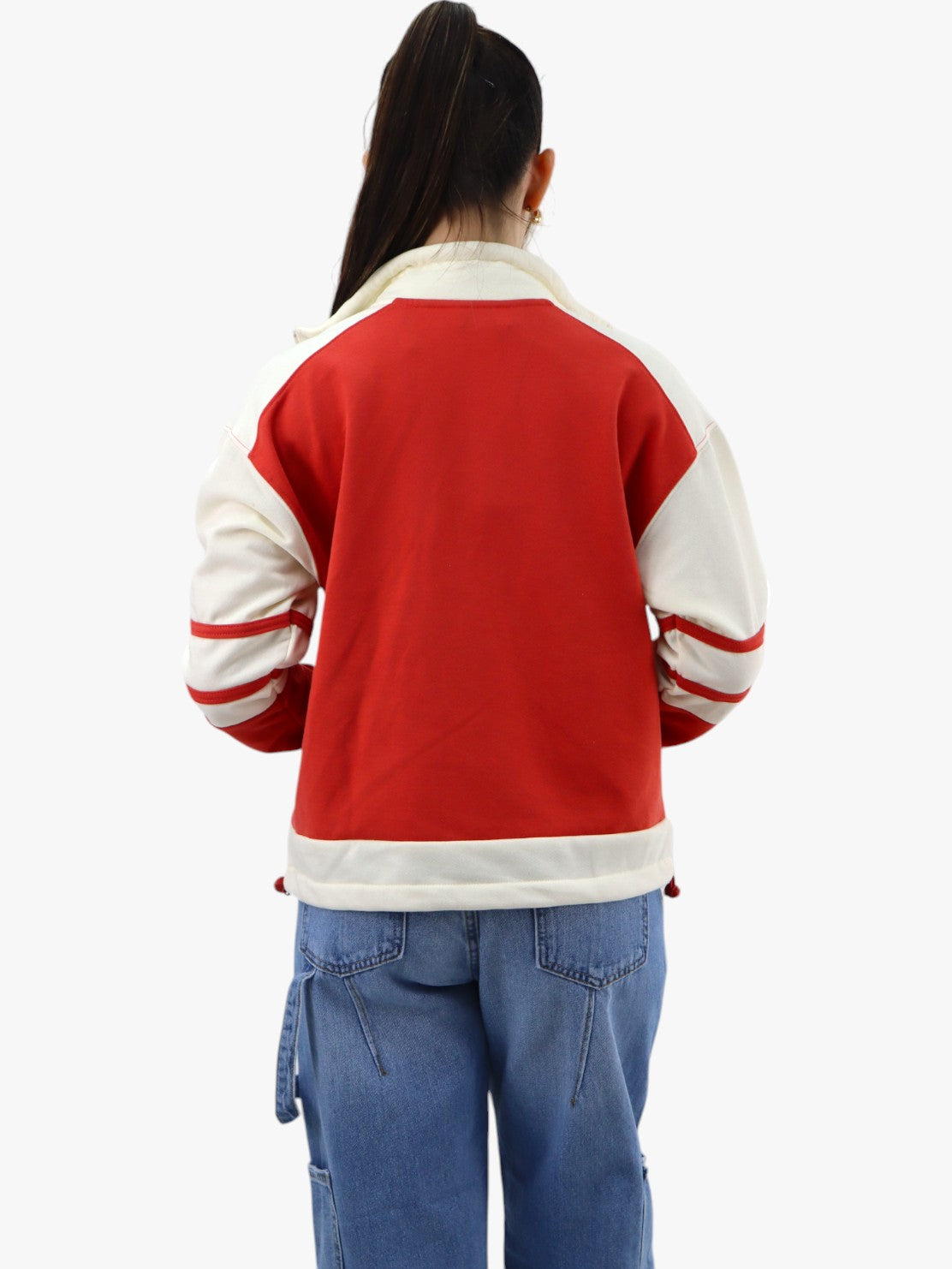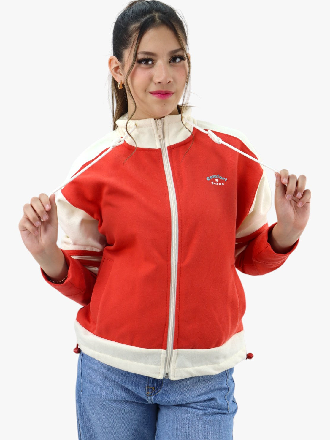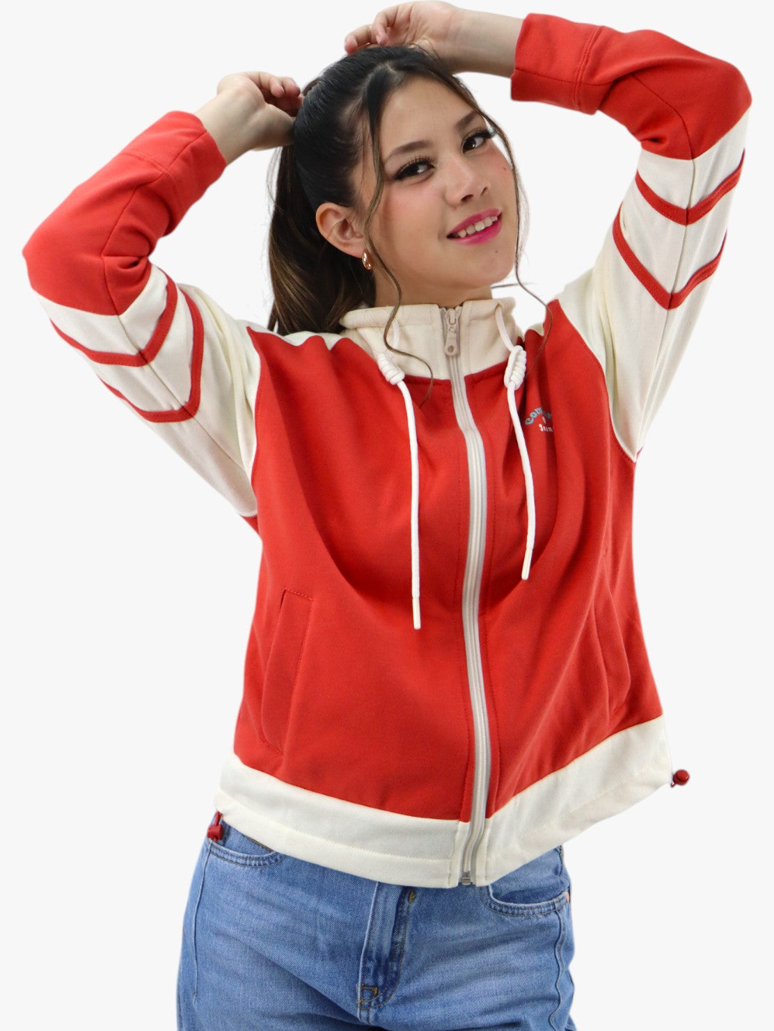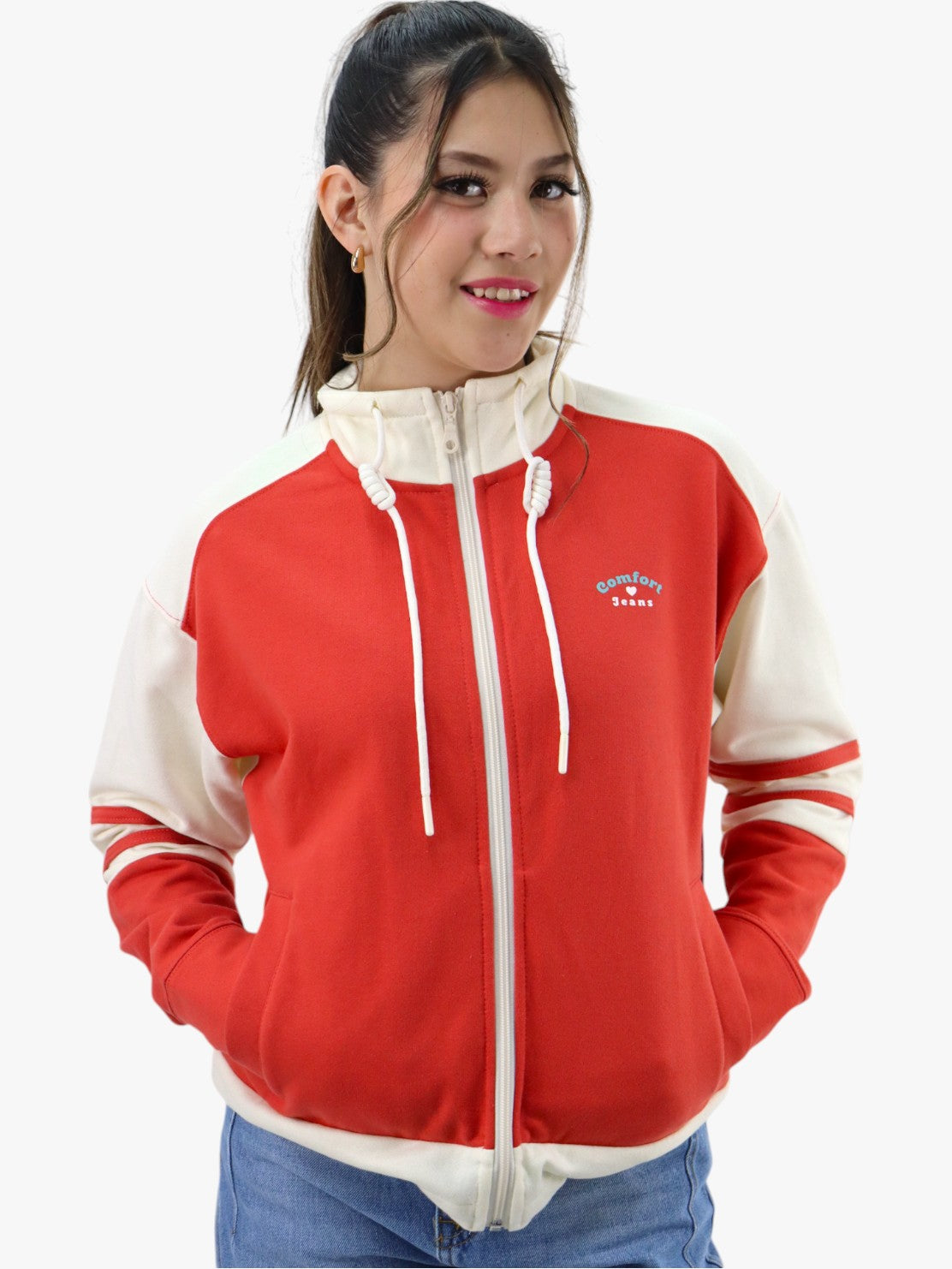 Chaqueta con detalle de rayas laterales en la manga, cierre de cremallera, bolsillos laterales y cuello alto.
