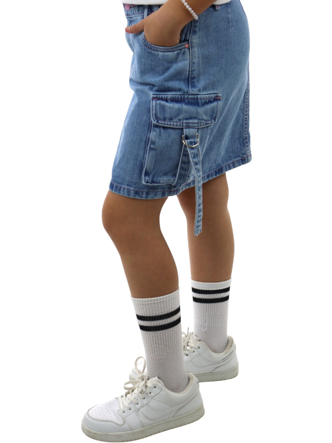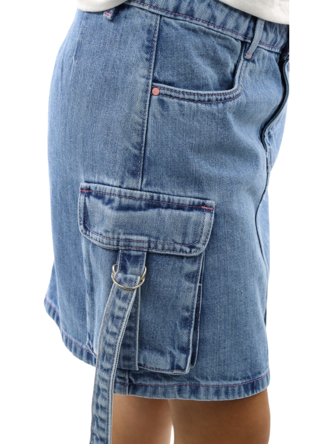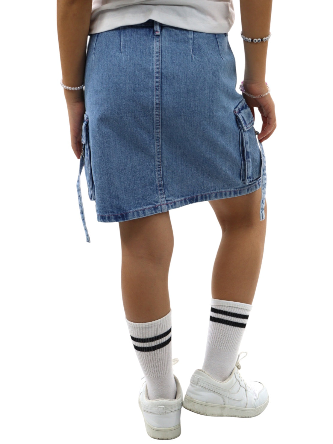 Falda de mezclilla cargo, con bolsillos en la parte delantera, cierre de botón y cremallera. Lavado azul medio, ligeramente ensuciado, aspecto sucio.