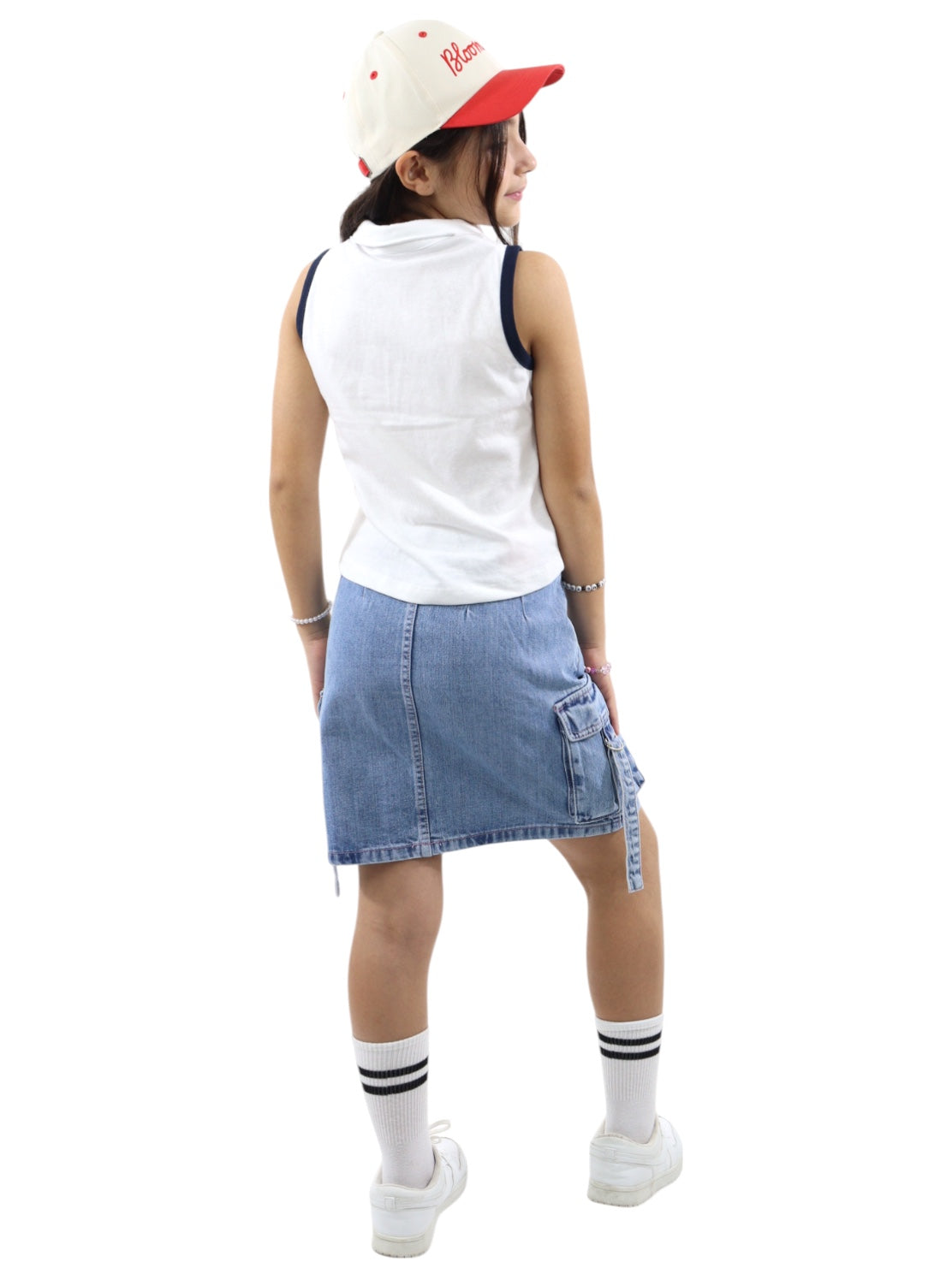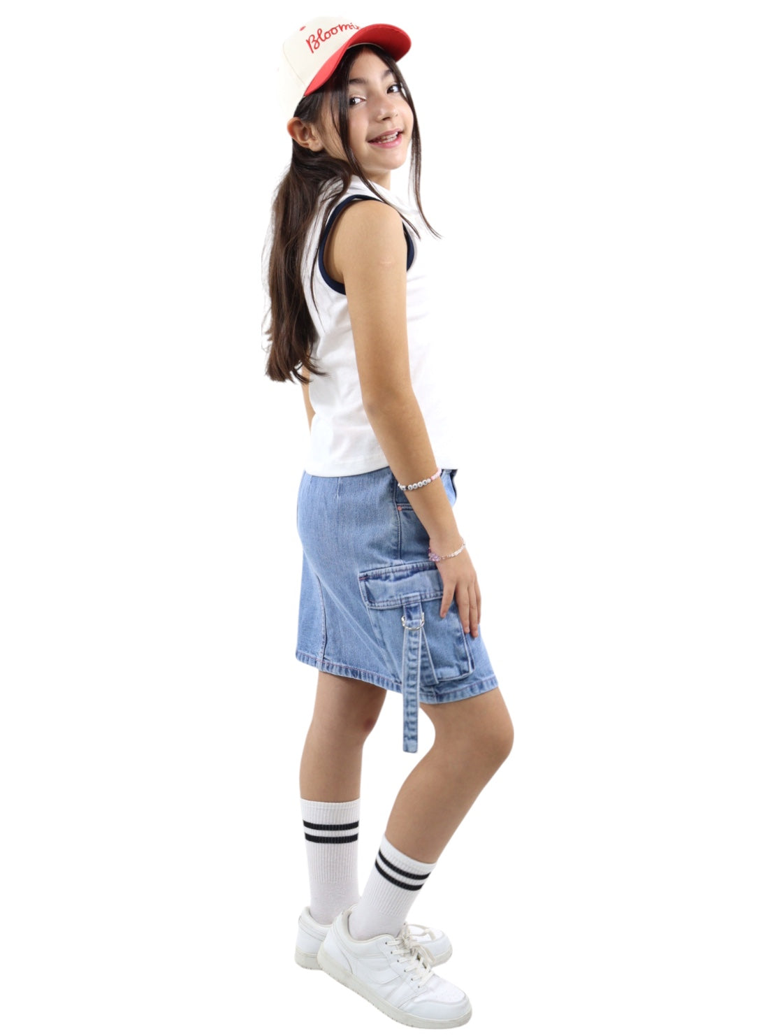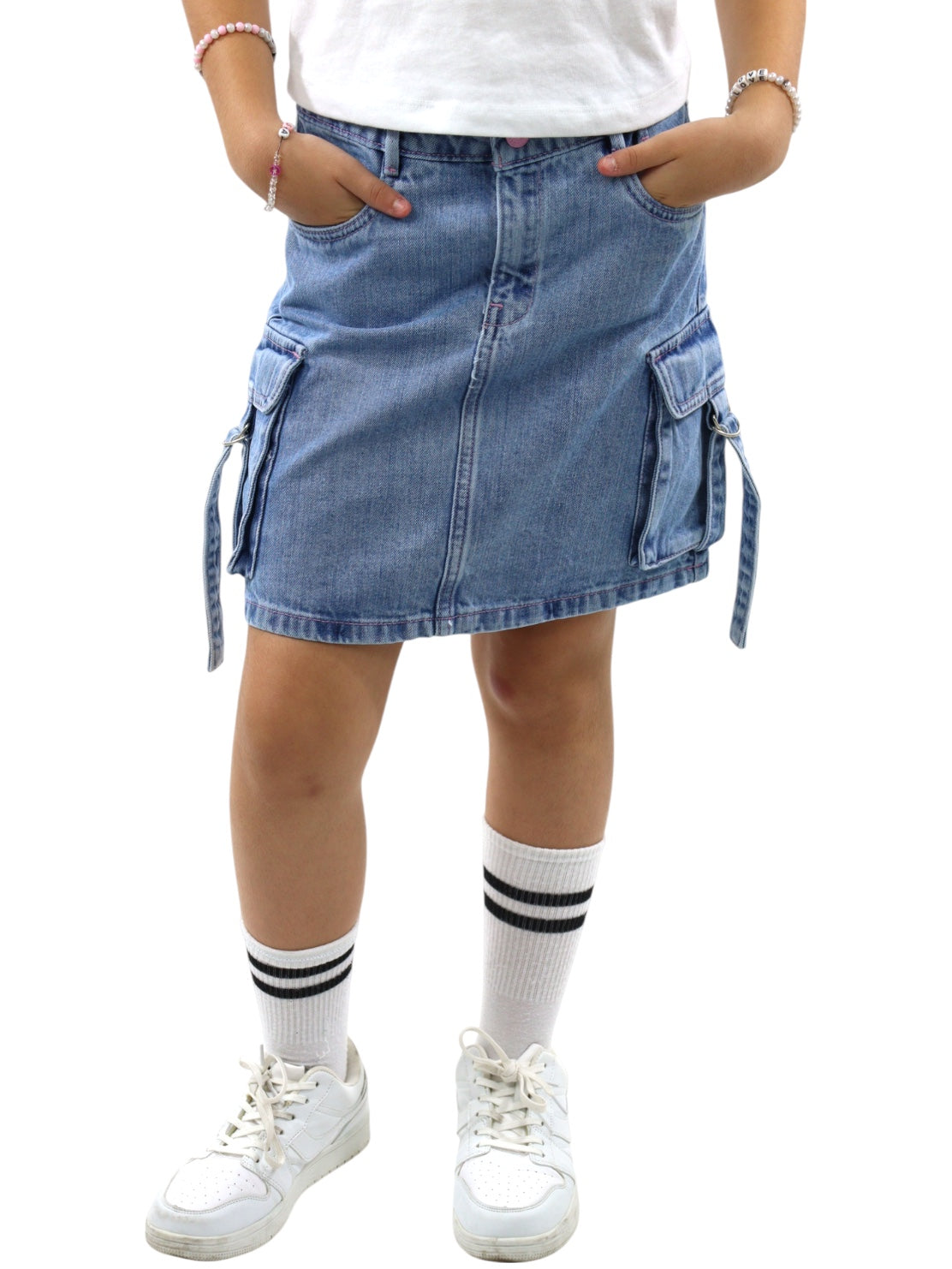 Falda de mezclilla cargo, con bolsillos en la parte delantera, cierre de botón y cremallera. Lavado azul medio, ligeramente ensuciado, aspecto sucio.
