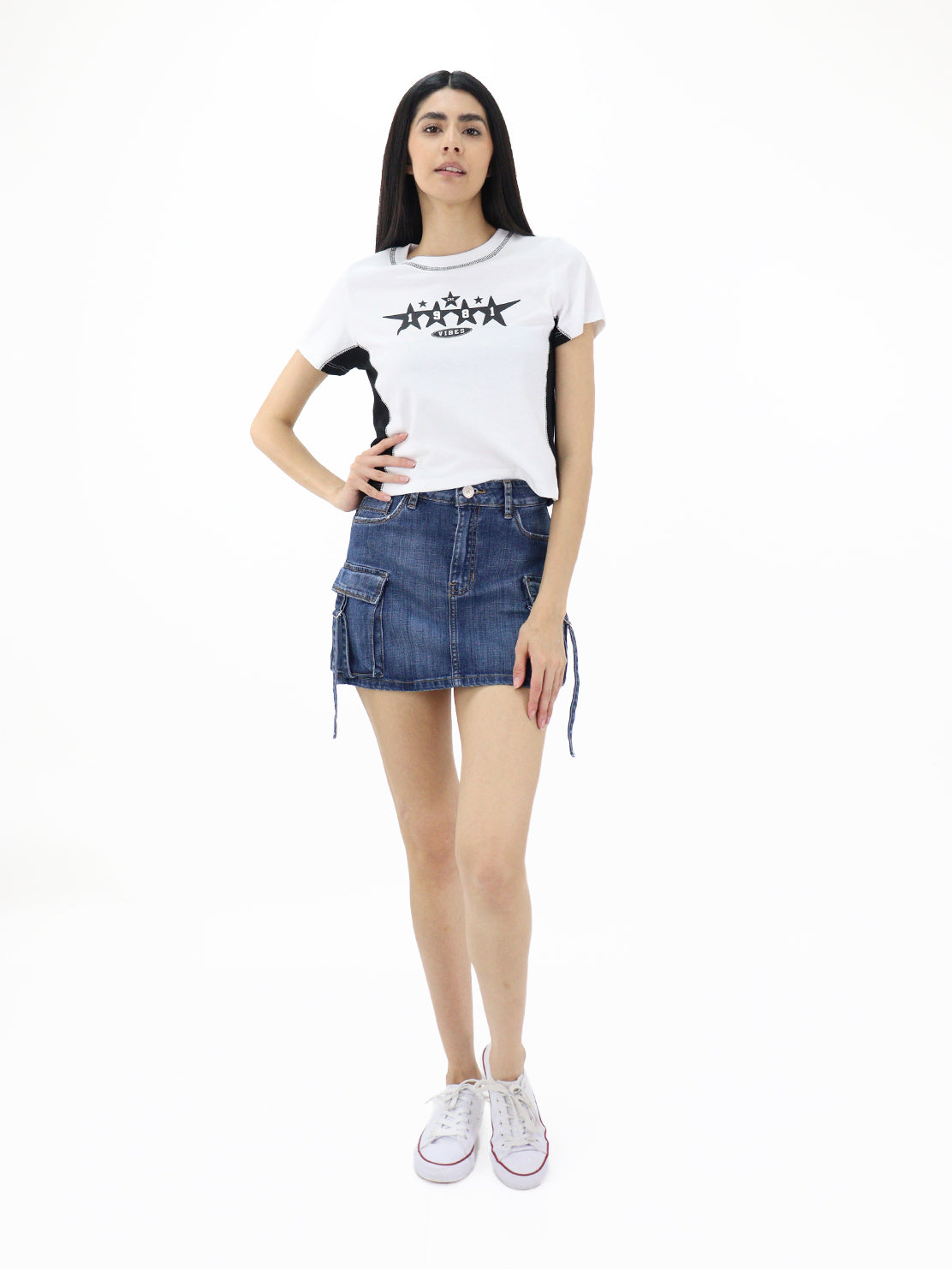 Falda de mezclilla cargo tiro medio, con bolsillos en la parte delantera, cierre de botón y cremallera. Lavado azul oscuro, ligeramente ensuciado, aspecto sucio.