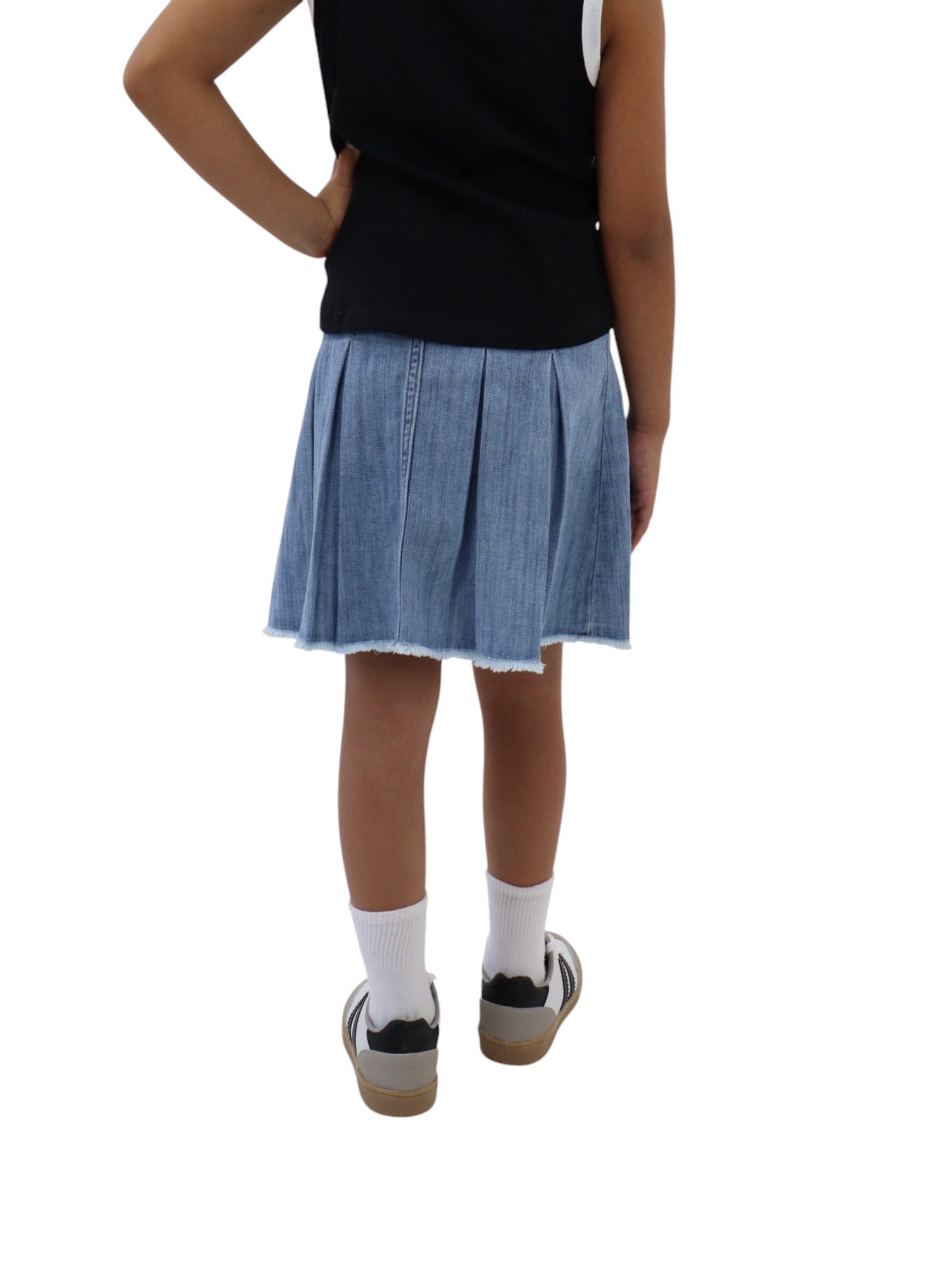 Falda corta de tablas, lavado azul ligeramente ensuciado, aspecto sucio, con cierre de botón y cremallera, con trabillas para cinturón.