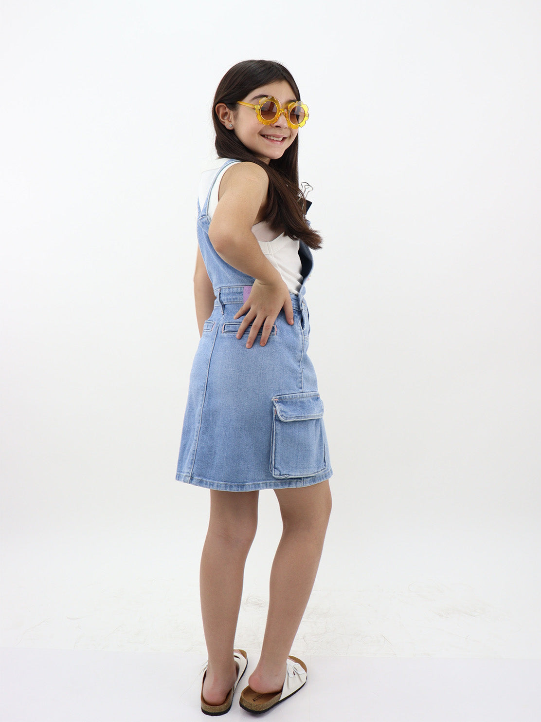 Falda peto lavado azul claro, ligeramente ensuciado. Bolsillos laterales en ambas piernas, con tapeta, con cierre de botón y tirantes ajustables.