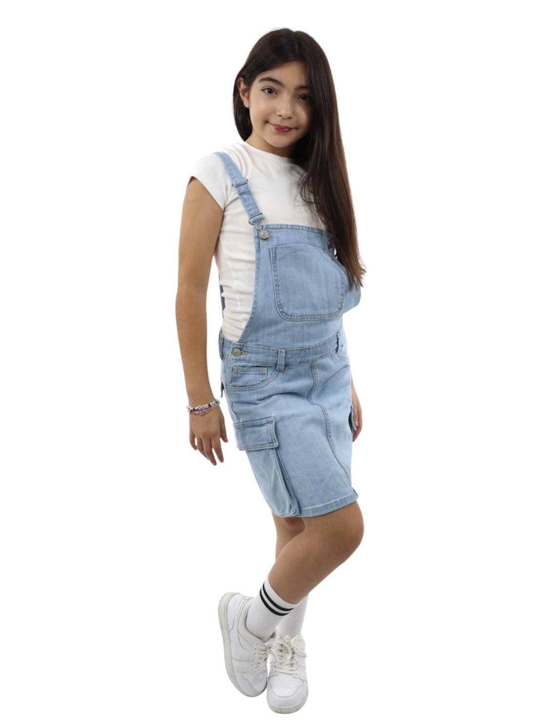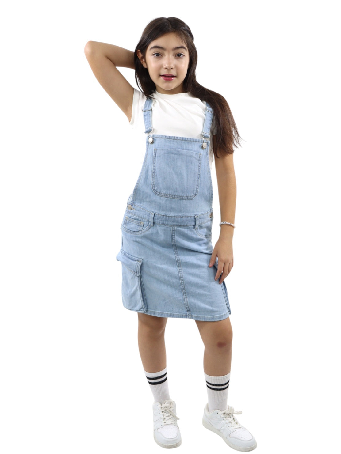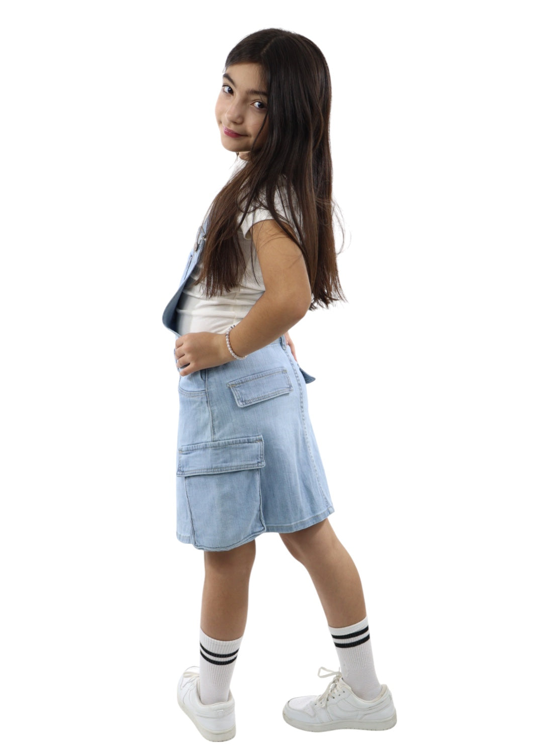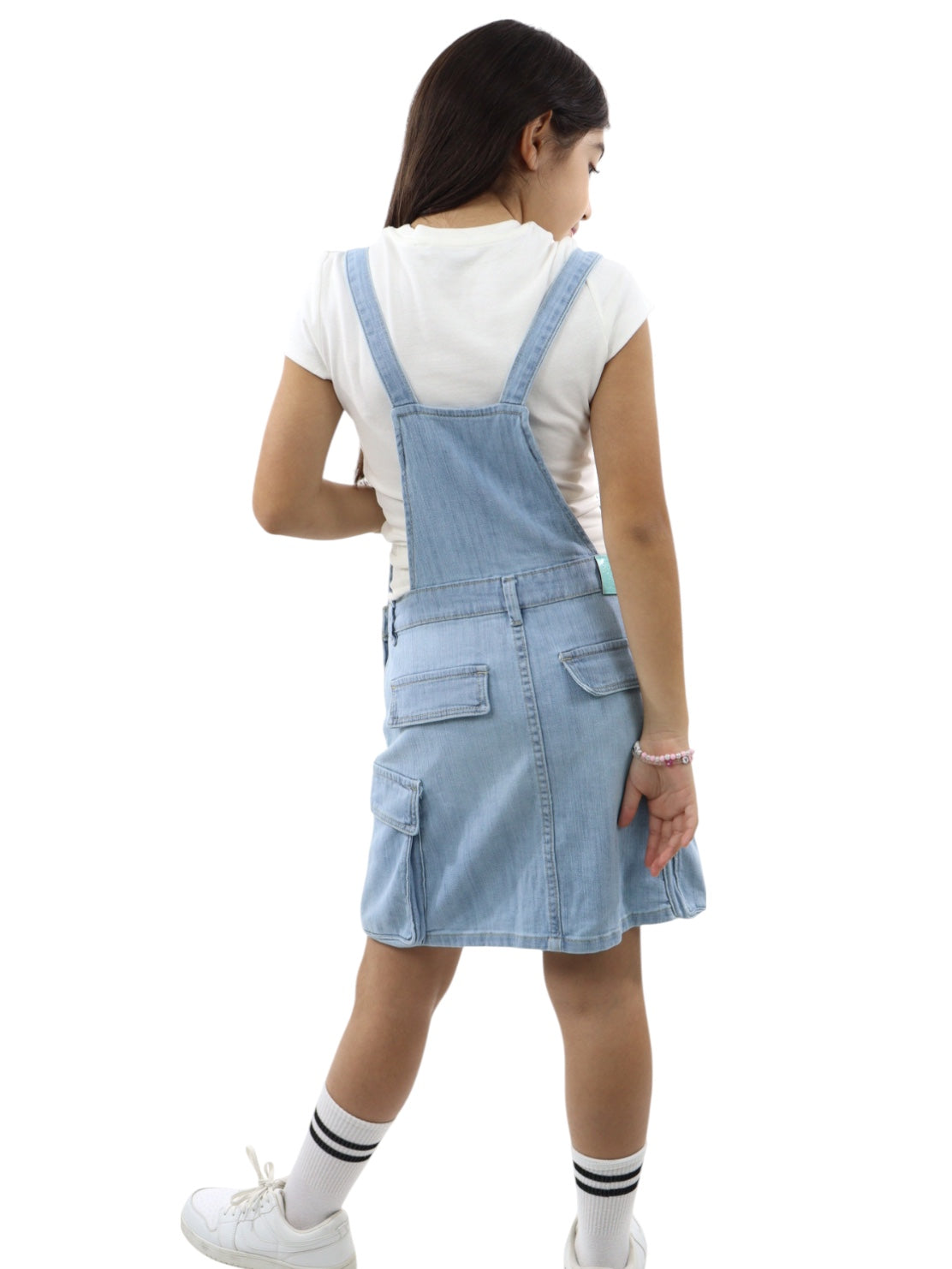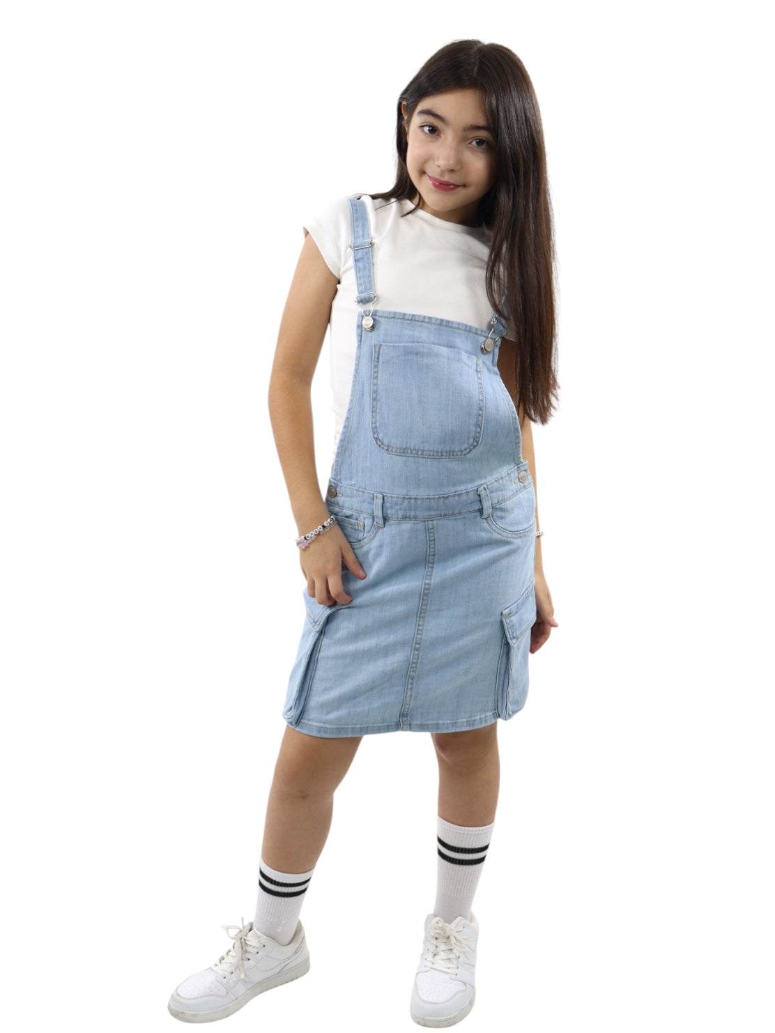Falda peto lavado azul claro, con 2 bolsillos laterales en ambas piernas, con tapeta, con cierre de botón y tirantes ajustables.