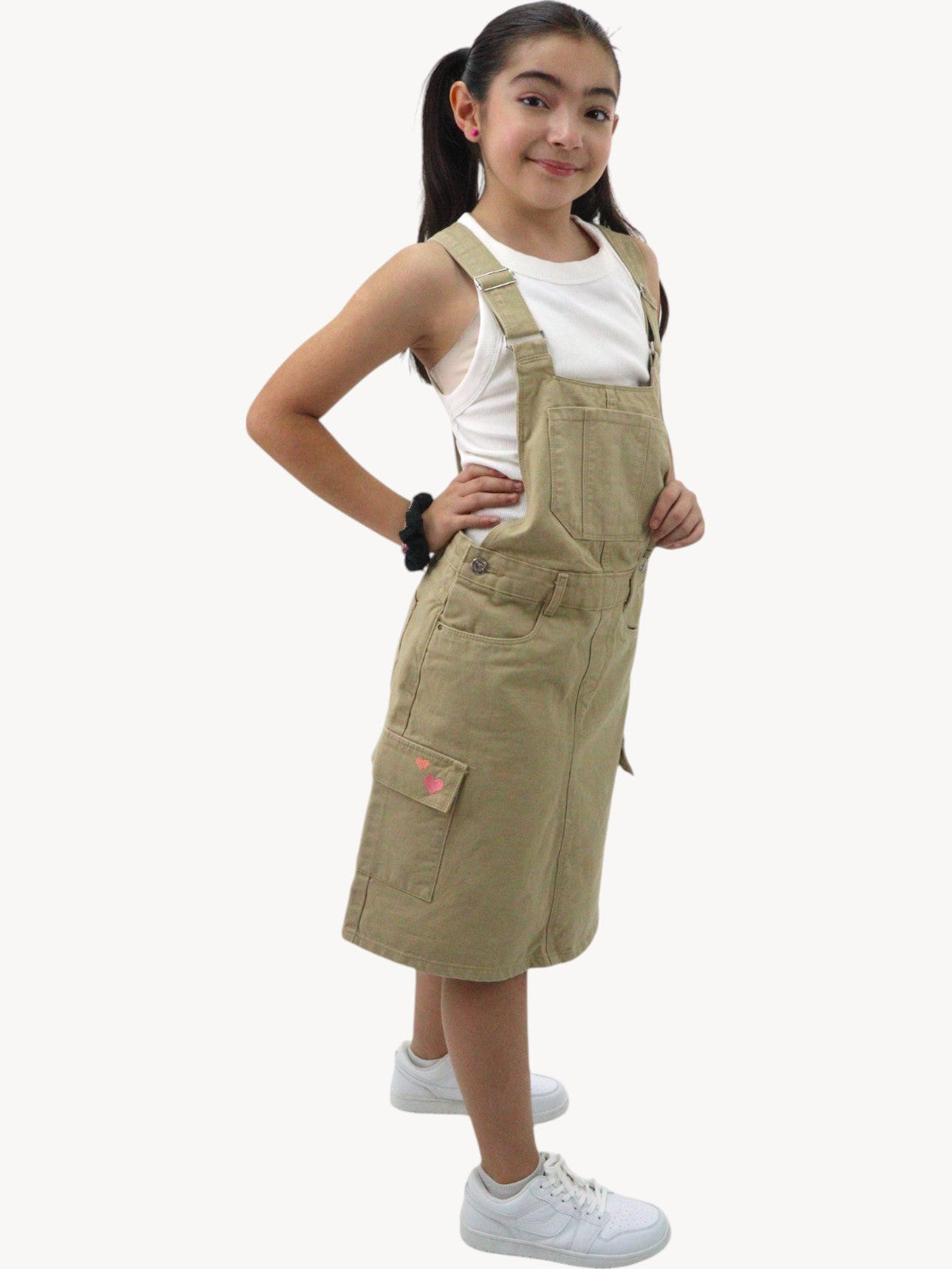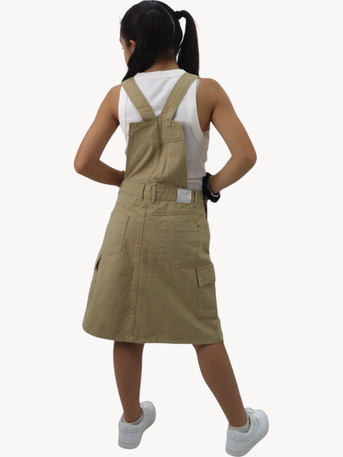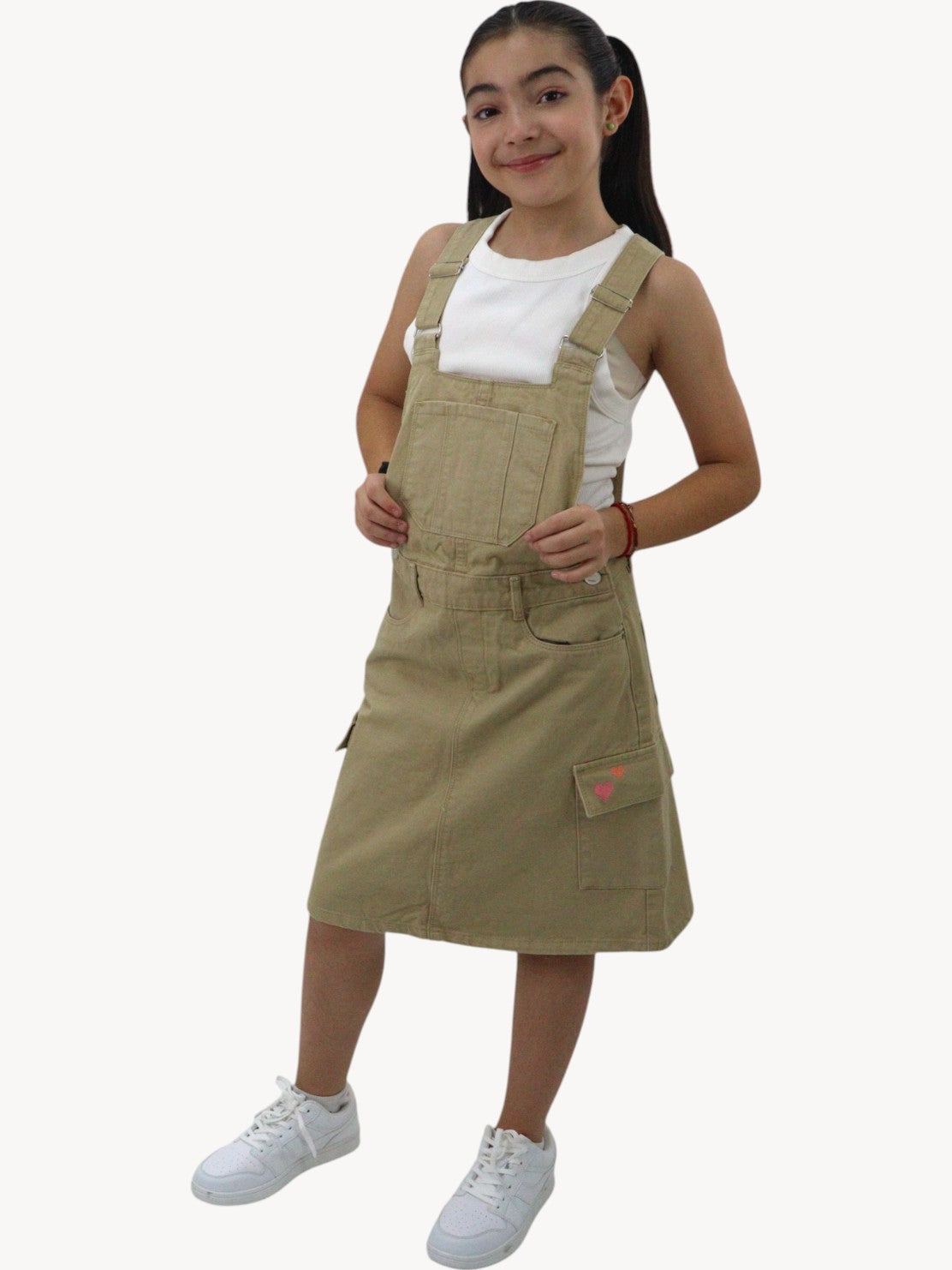 Falda peto lavado Khaki. Cuatro bolsillos laterales en ambas piernas, con tapeta, con cierre de botón y tirantes ajustables.