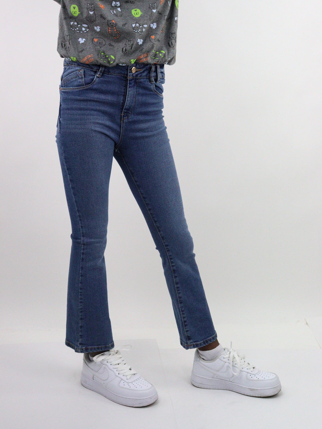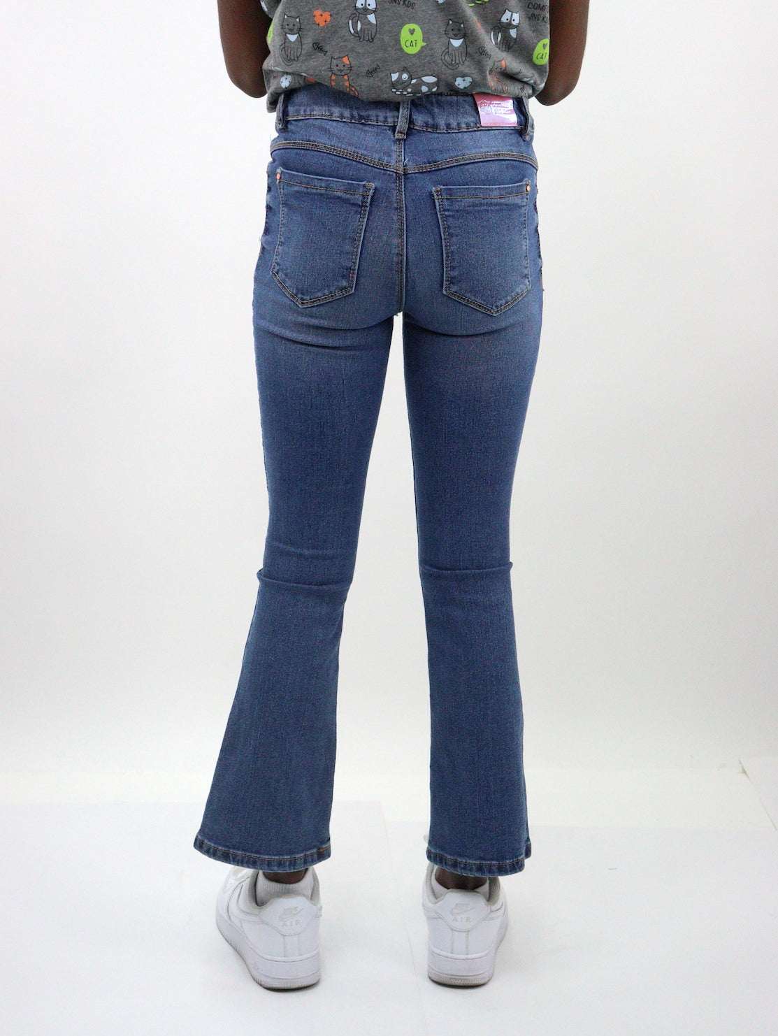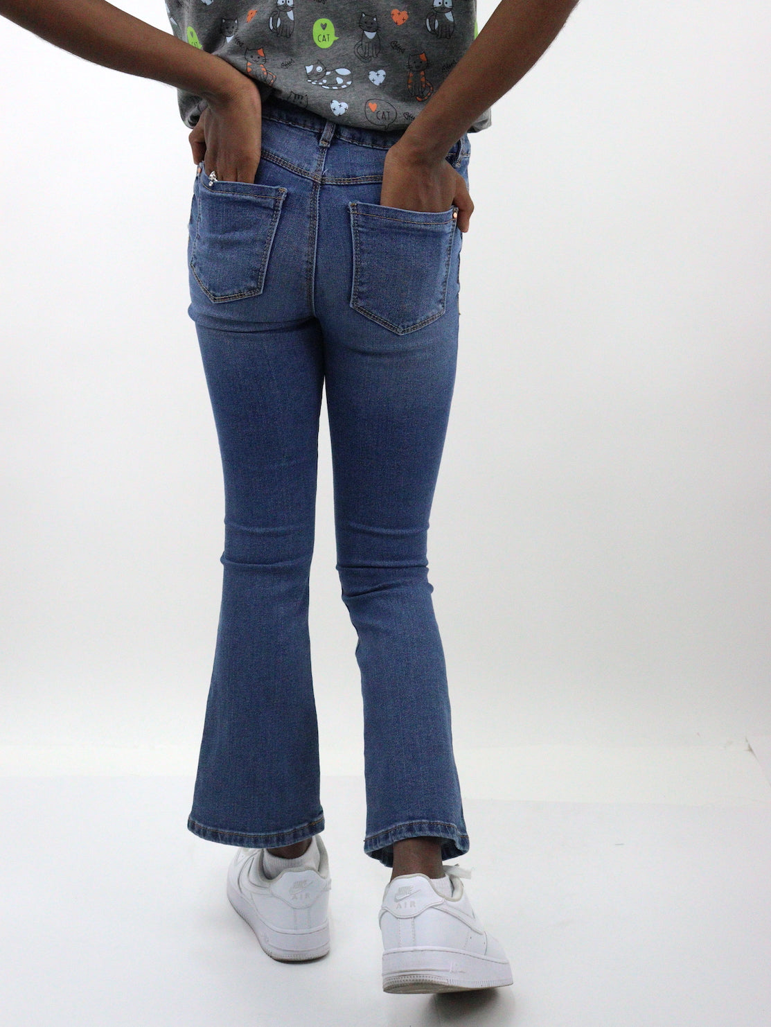 Jeans acampanado de color azul deslavado, con bolsas delanteras/traseras. Cierre de botón y cremallera.