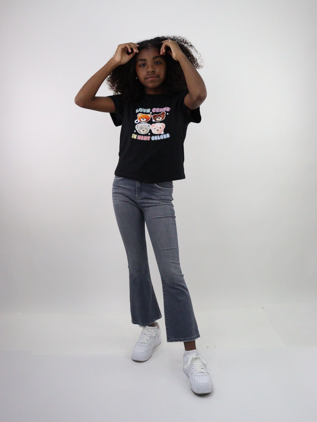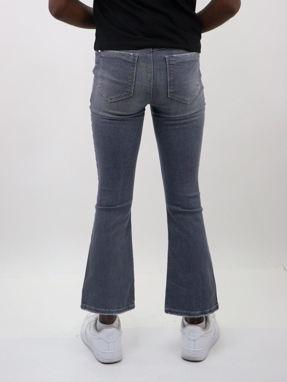 Jeans acampanado de mezclilla stretch color gris oxford, con bolsas traseras/delanteras. Cierre de botón y cremallera.