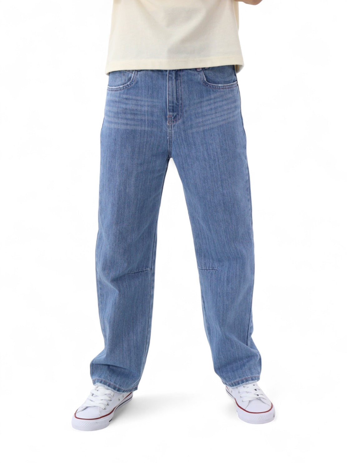 Jeans baggy de mezclilla lavado azul medio, ligeramente ensuciado, aspecto usado, con cierre de botón y cremallera.