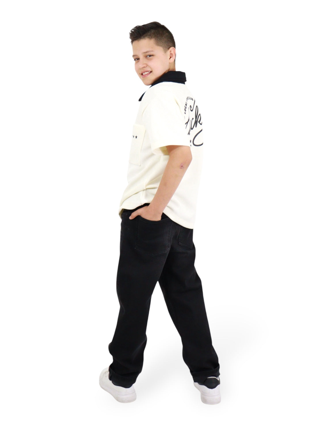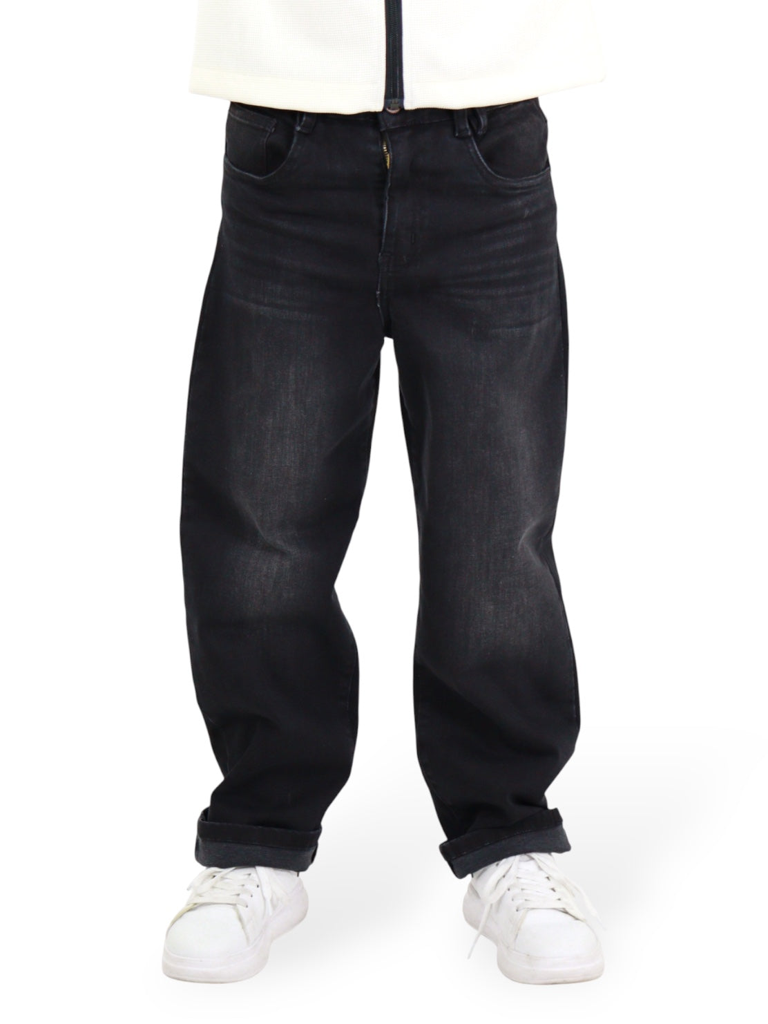 Jeans baggy tiro alto de mezclilla lavado negro, ligeramente ensuciado, aspecto usado, con cierre de botón y cremallera.