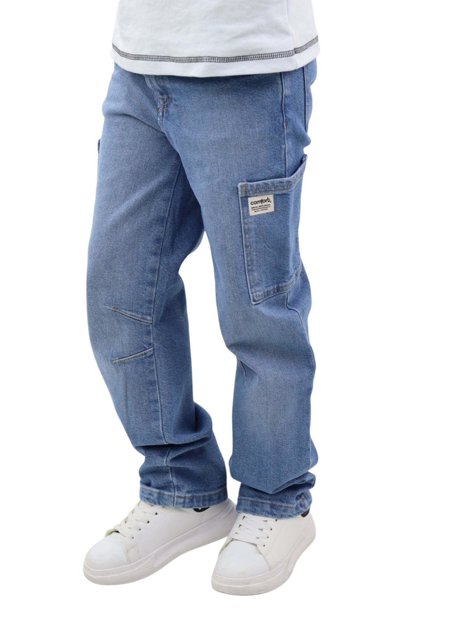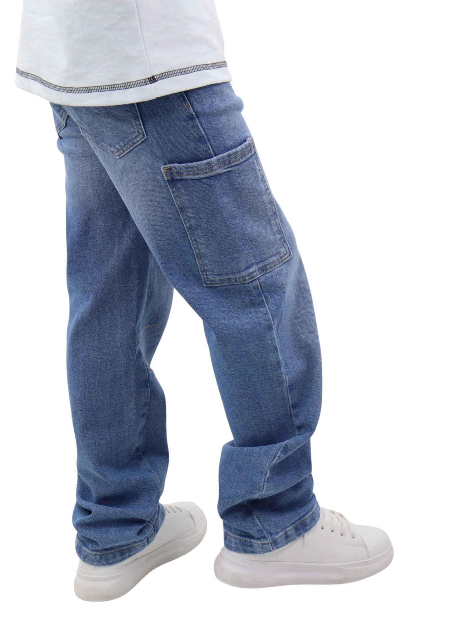 Jeans baggy de talle alto, con bolsillos en la parte delantera, frontal y trasera, cierre de botón y cremallera. Lavado azul medio, ligeramente ensuciado, aspecto sucio.