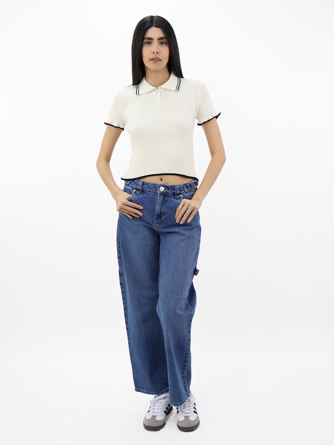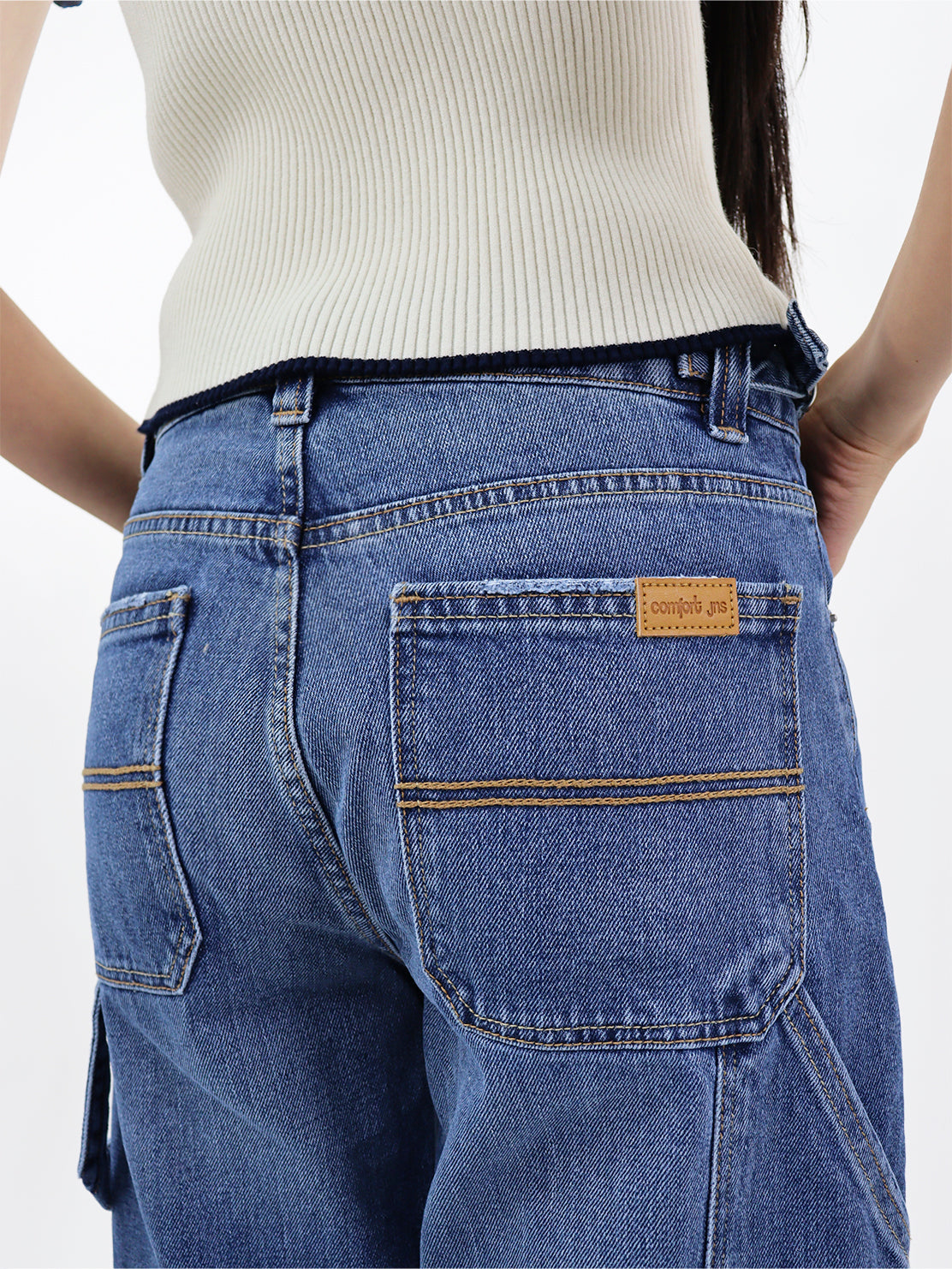 Jeans baggy de talle alto, con bolsillos en la parte delantera y trasera, cierre de botón y cremallera. Lavado azul oscuro, ligeramente ensuciado, aspecto sucio.
