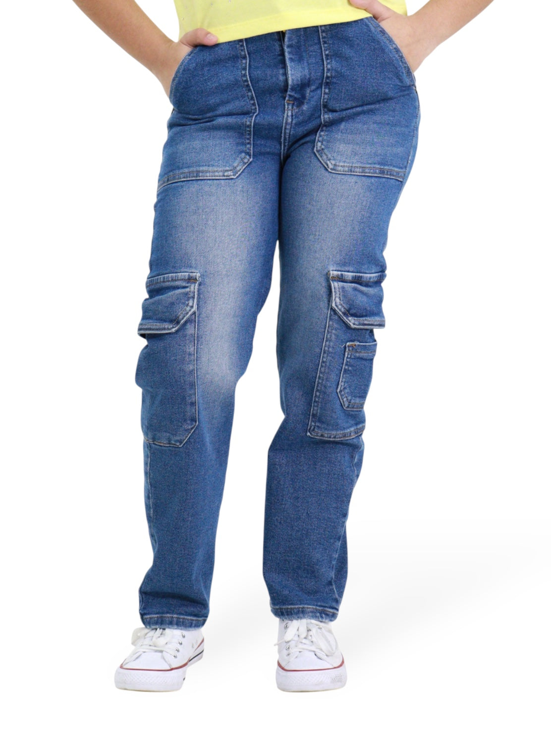Jeans baggy cargo de talle alto azul deslavado, con bolsillos en la parte delantera y trasera, con pierna recta.