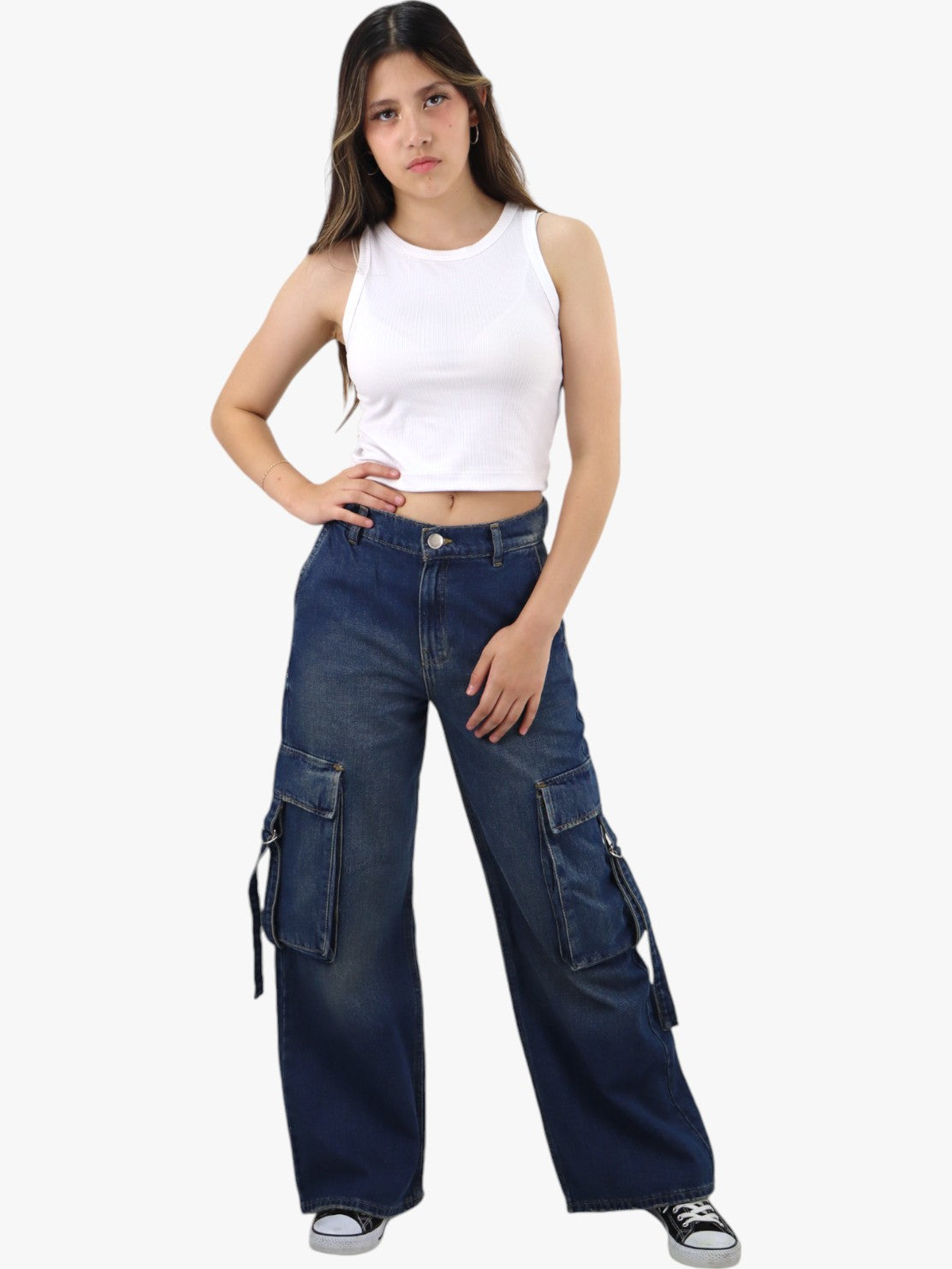 Jeans de talle medio con bolsillos en los laterales y bolsillos de cargo, cierre de botón y cremallera. Lavado oscuro ligeramente ensuciado, aspecto usado.
