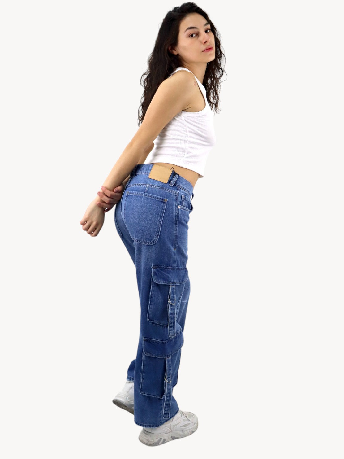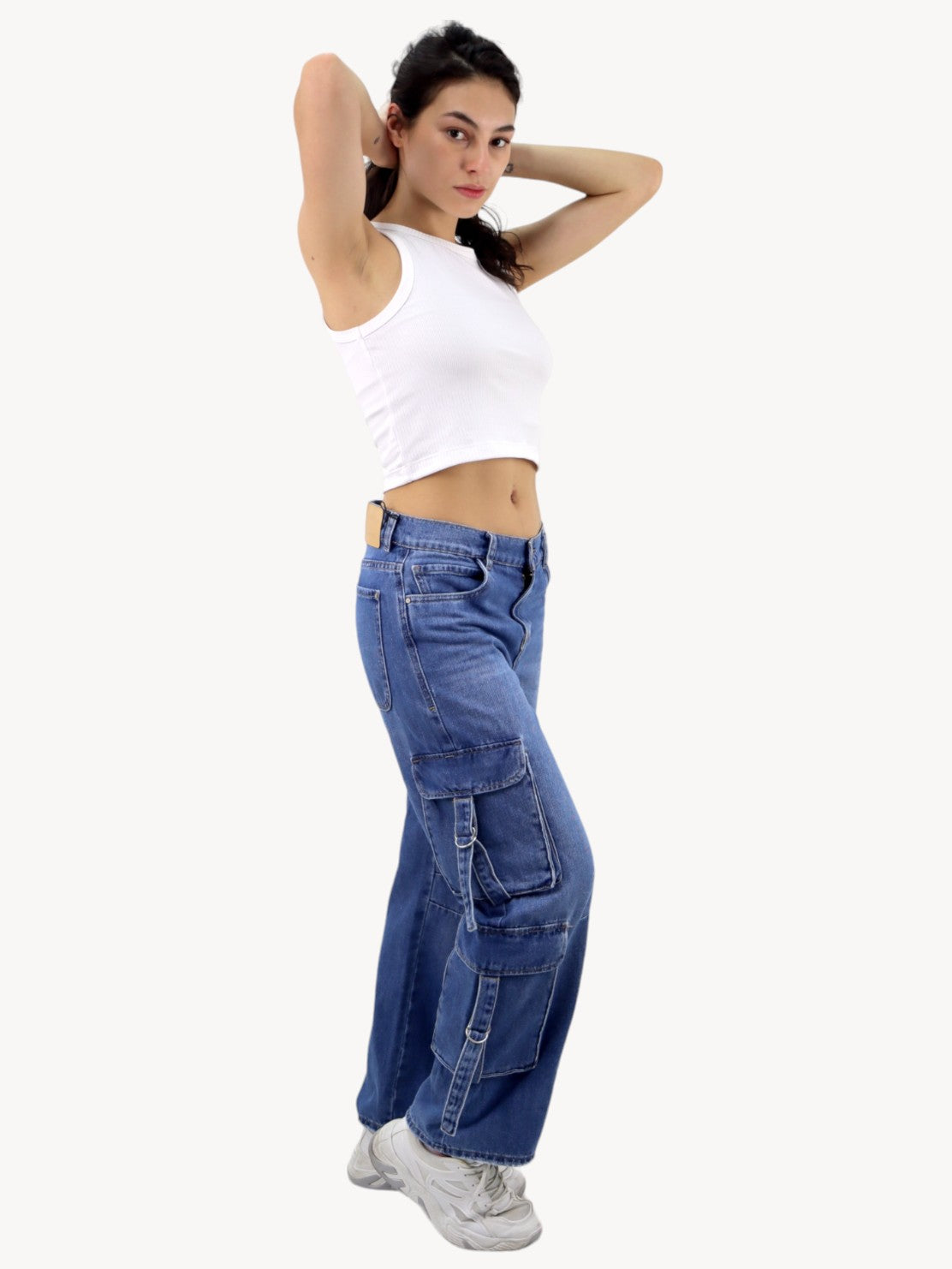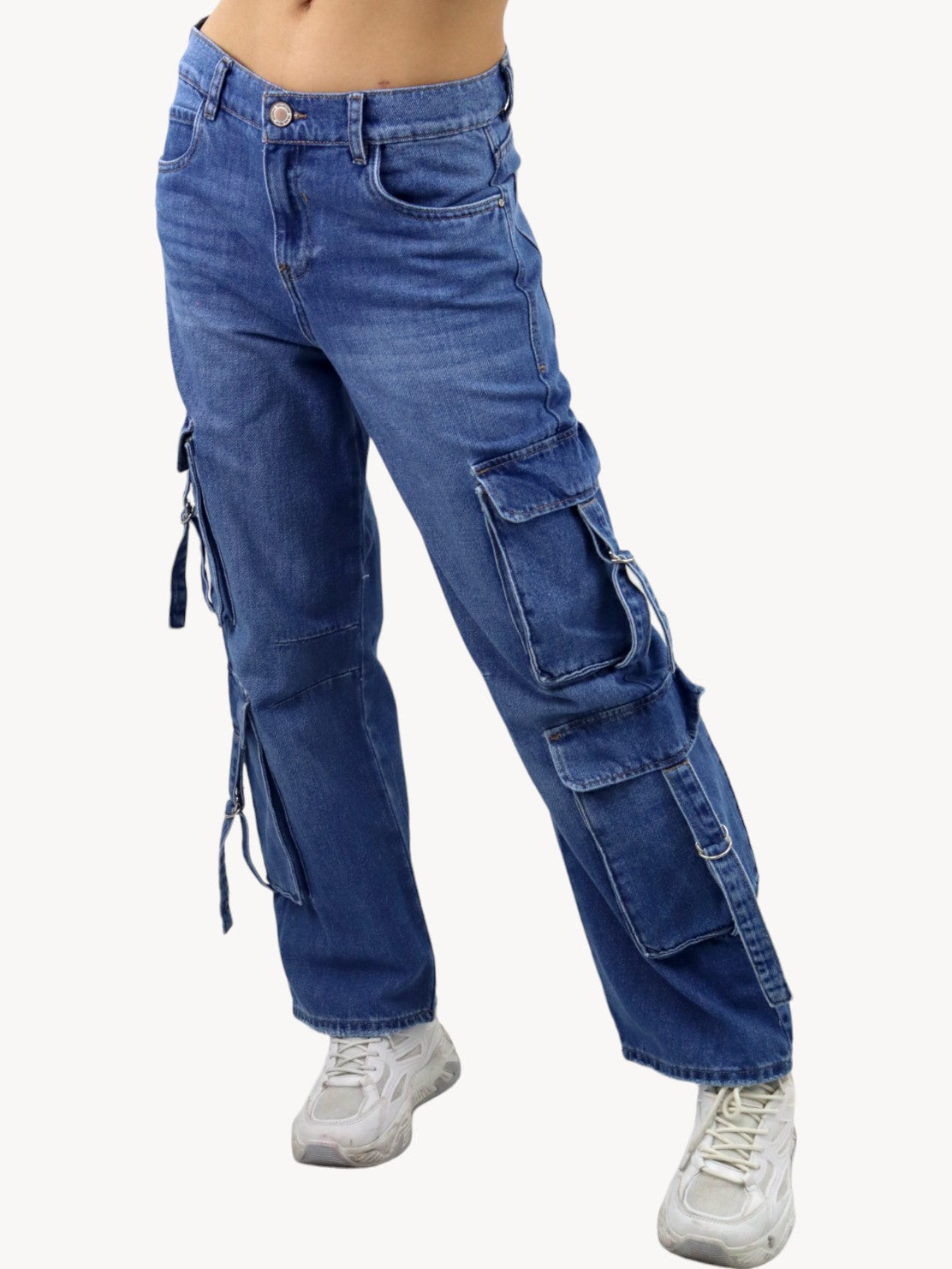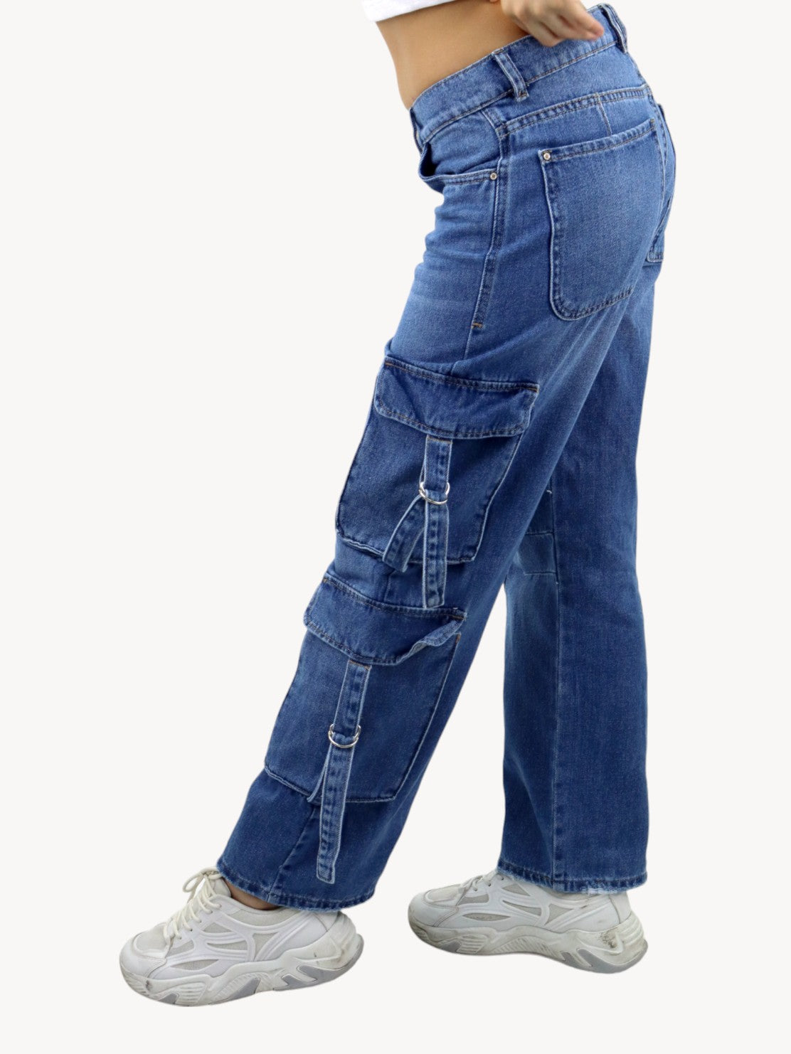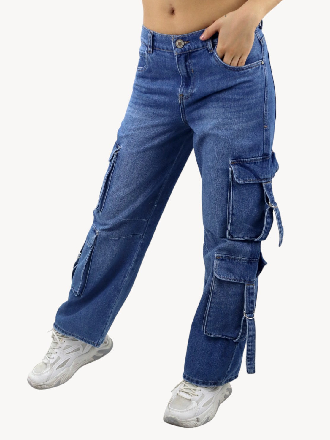 Jeans cargo tiro medio de color azul medio, con bolsas delanteras/traseras. Cierre de botón y cremallera